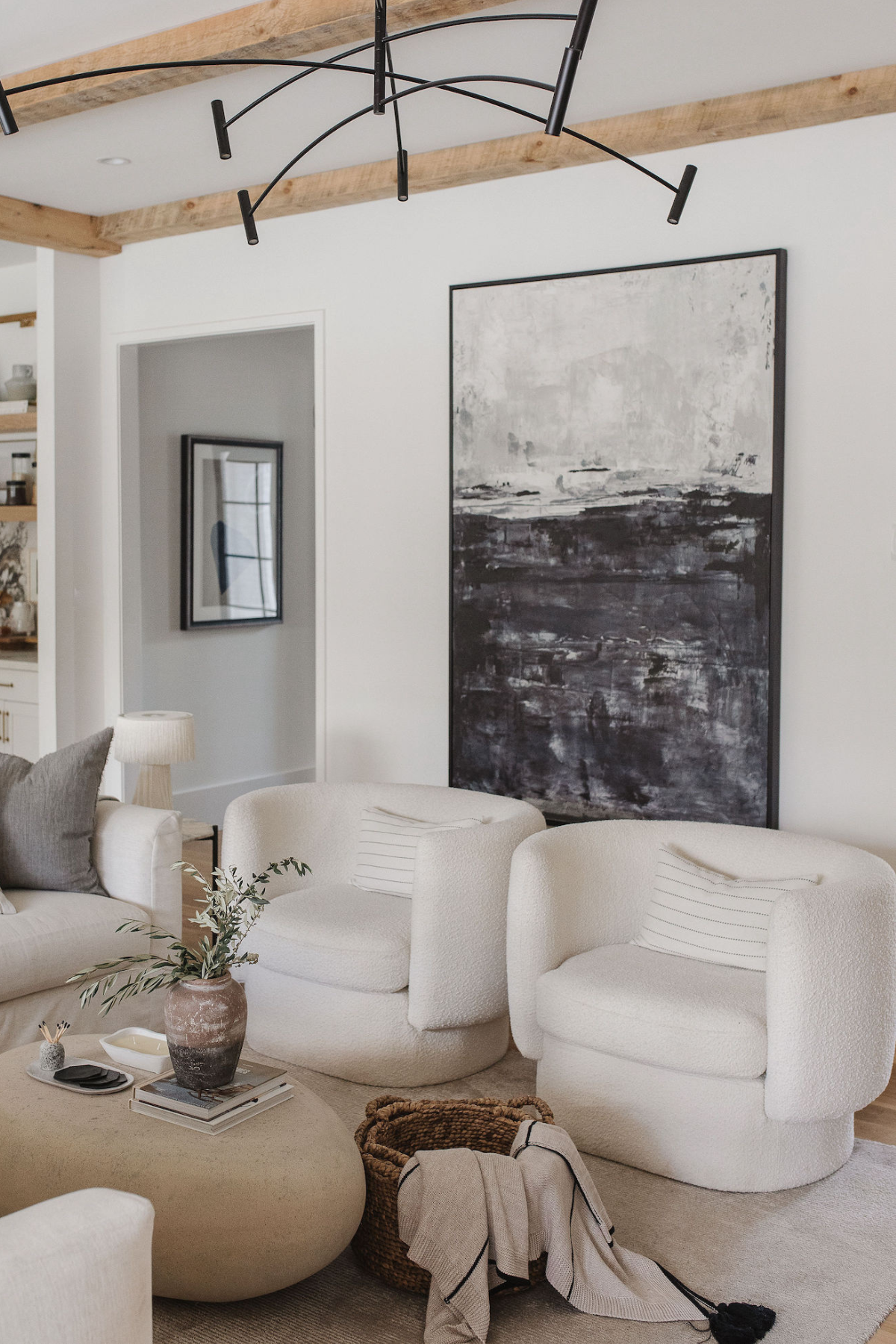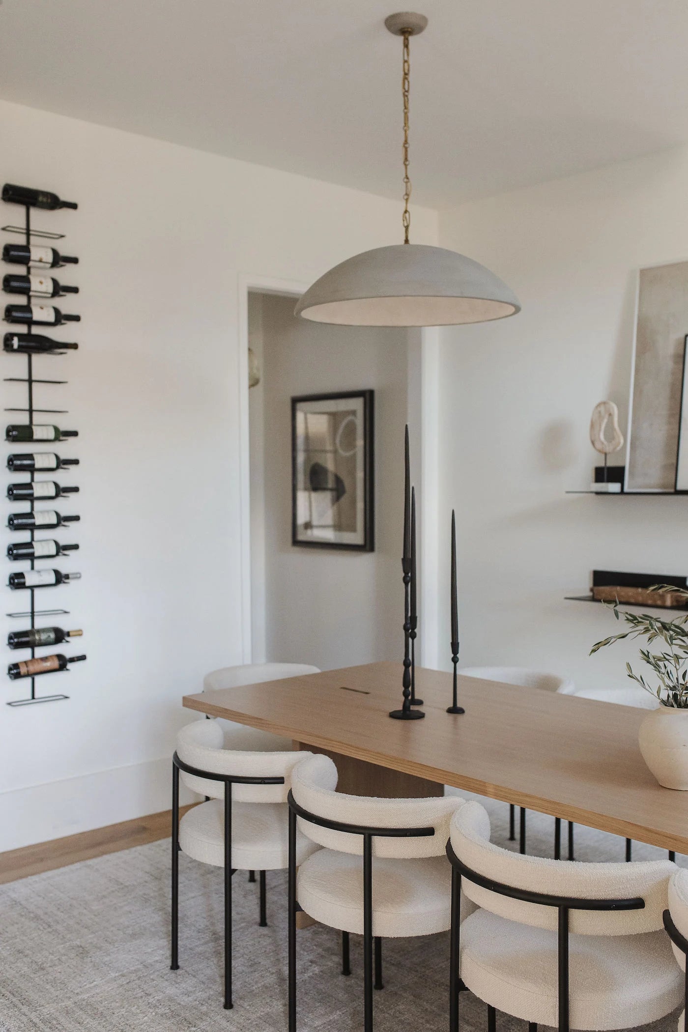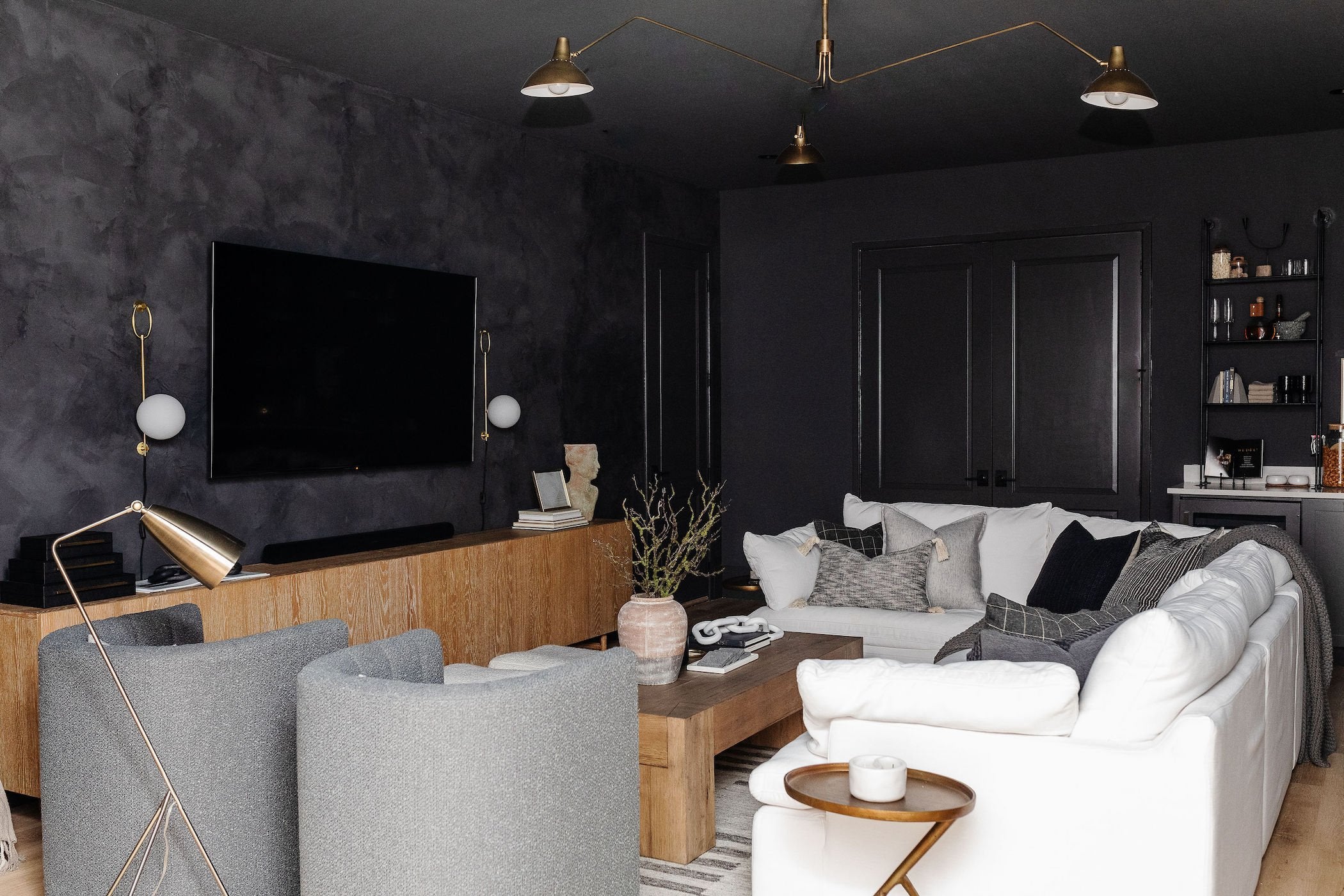 Inspired by the Design influence of Wabi Sabi and the Santa Monica Proper Hotel, this 6,000 sqft, three-story new build is a neutral lover's dream! Located in the suburbs of Atlanta, Georgia this Southern home is the perfect abode for this family of three. While our clients selected the hardscape finishes, our team, led by RJ Bialkowski, completed this project and brought our client's vision to life with lighting and furnishings! Our client wanted neutral and modern styling, yet still wanted to take risks with various bold Design elements. The basement is the perfect example of this; we chose to paint it black floor to ceiling and add texture with a Roman Clay finish for a moody vibe. Each space throughout this home is outfitted with oversized lighting, furniture in various materials and tones, and styling that is layered for a unique, yet timeless aesthetic.