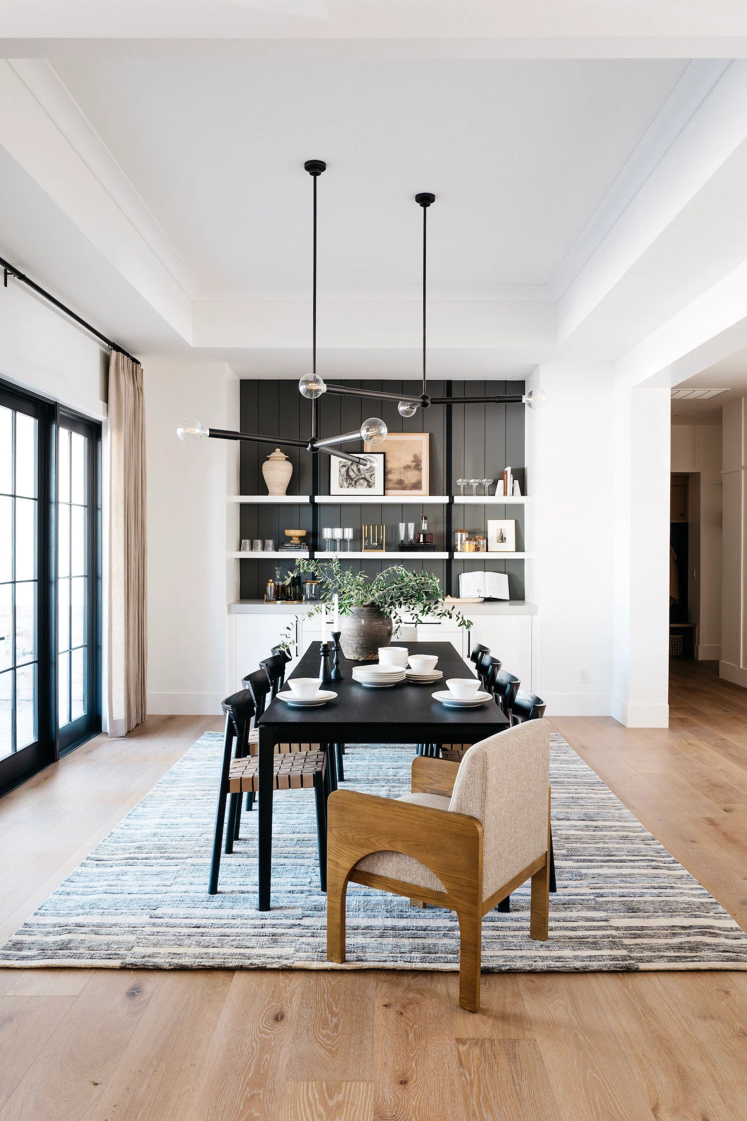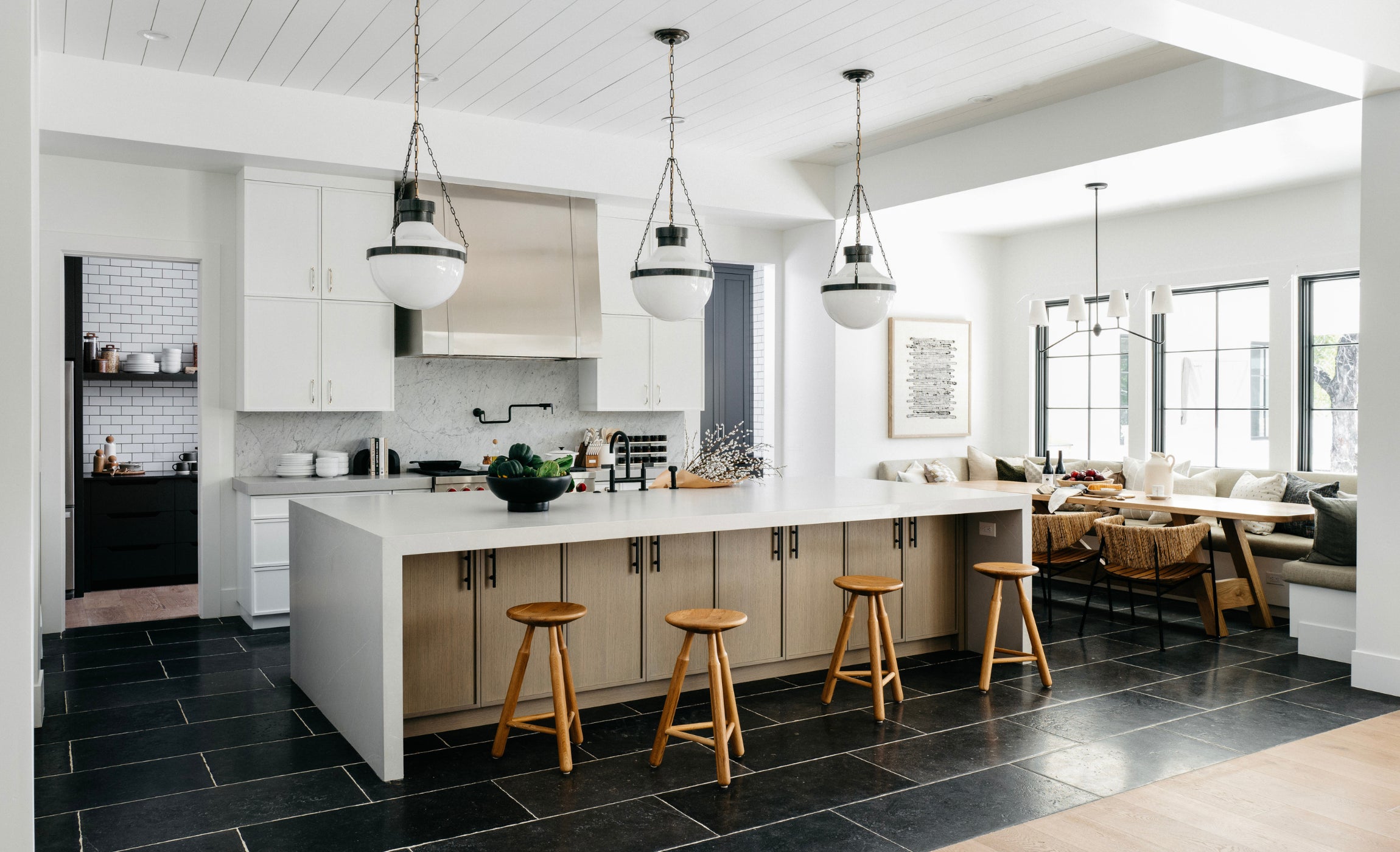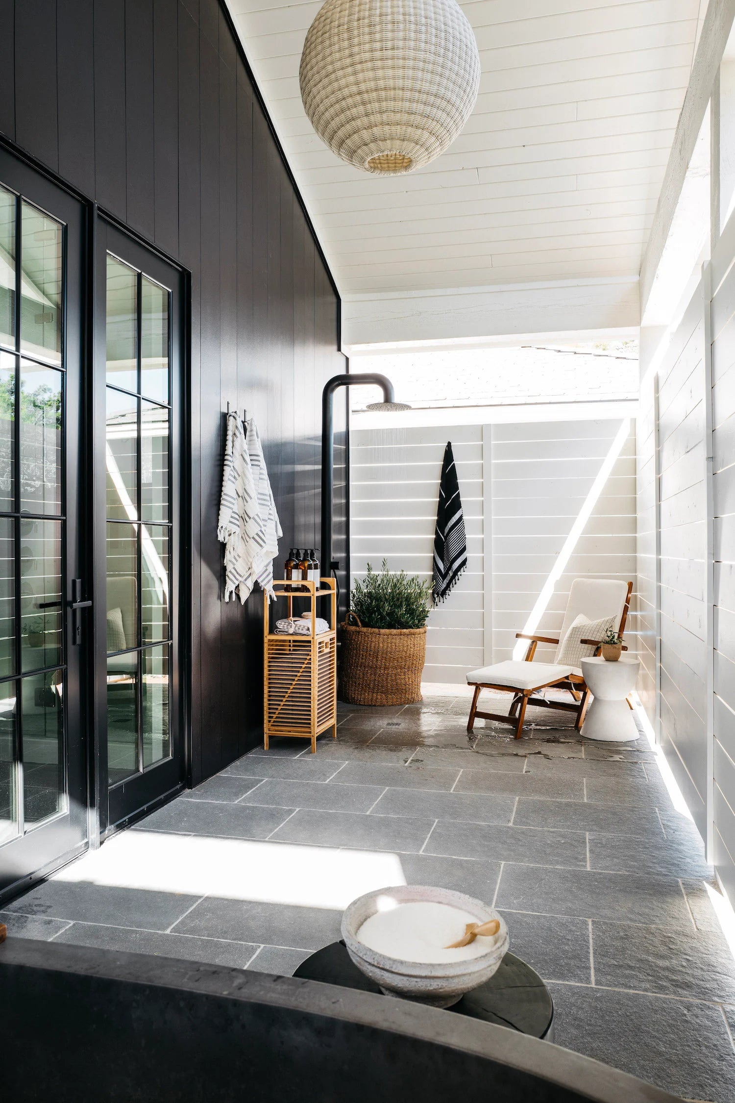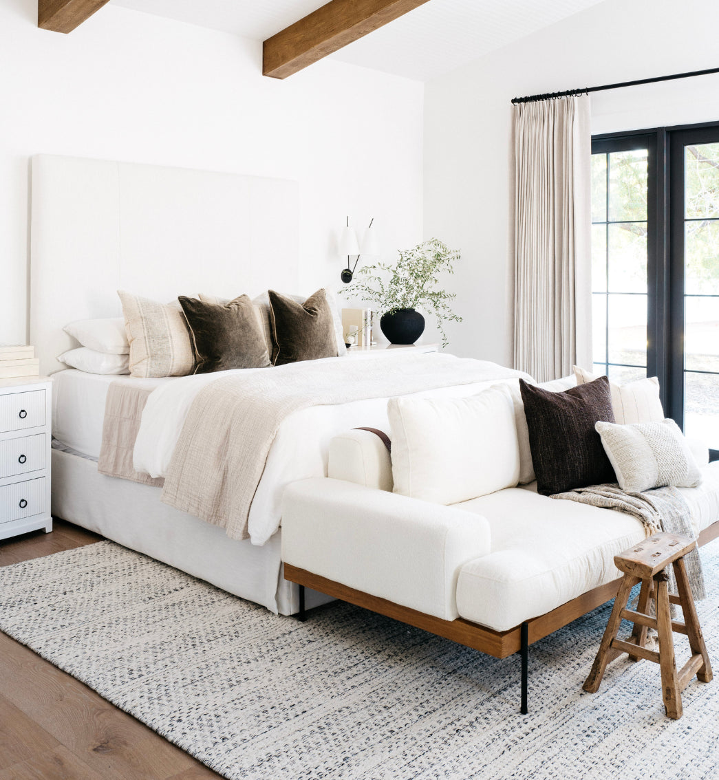 While designing #MrAndMrsSmithProj, Lead Designer Kylie Ray Syburg and team stuck to three words as inspiration for the Design: California, Casual, and Americana. Built in partnership with E&S Builders, this 7,000+ sqft new build located in Phoenix, Arizona is our client’s private oasis! With both a main and guest house, this family of four has room to live, play and grow in this home for years to come. Our clients have a more traditional aesthetic, so to elevate our signature neutral color palette, we included wall treatments like board and batten, shiplap and playful wallpaper. We also used polished nickel accents, which you typically don't see a lot of in our projects, but intentionally played up the traditional Design direction. The unique features in this home include a "dirty kitchen," expansive kids wing and home theater, but the star of the show is most definitely the private outdoor shower and tub off of the primary suite!