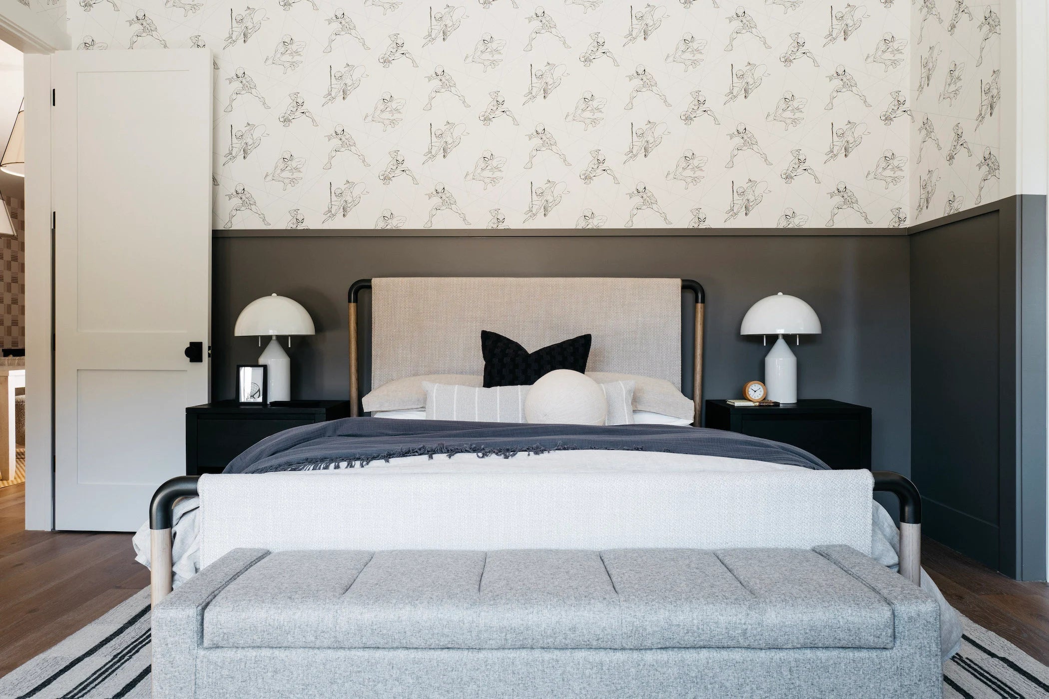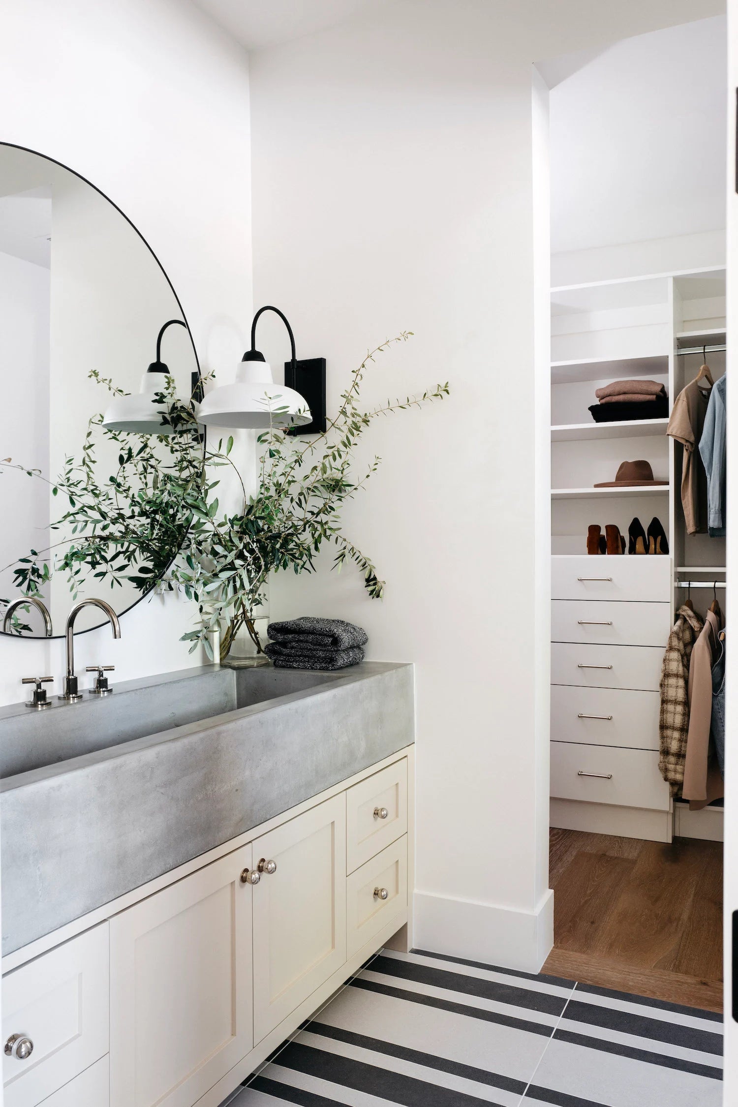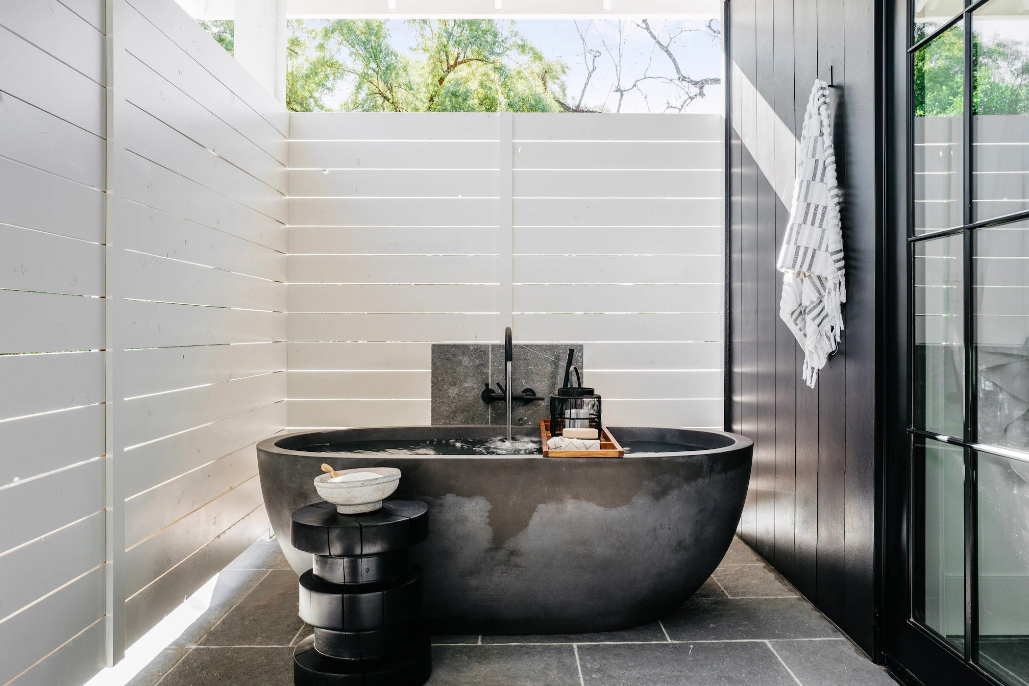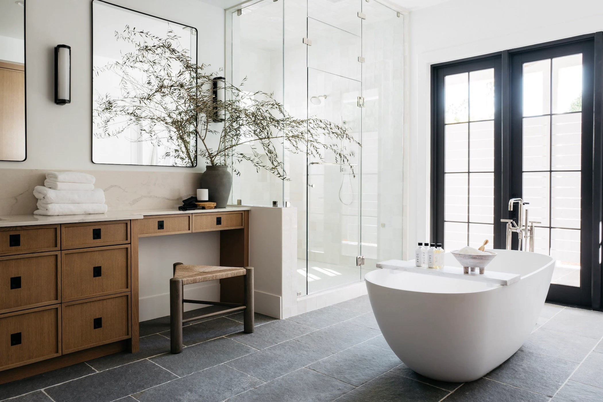 While designing #MrAndMrsSmithProj, Lead Designer Kylie Ray Syburg and team stuck to three words as inspiration for the Design: California, Casual, and Americana. Built in partnership with E&S Builders, this 7,000+ sqft new build located in Phoenix, Arizona is our client’s private oasis! With both a main and guest house, this family of four has room to live, play and grow in this home for years to come. Our clients have a more traditional aesthetic, so to elevate our signature neutral color palette, we included wall treatments like board and batten, shiplap and playful wallpaper. We also used polished nickel accents, which you typically don't see a lot of in our projects, but intentionally played up the traditional Design direction. The unique features in this home include a "dirty kitchen," expansive kids wing and home theater, but the star of the show is most definitely the private outdoor shower and tub off of the primary suite!