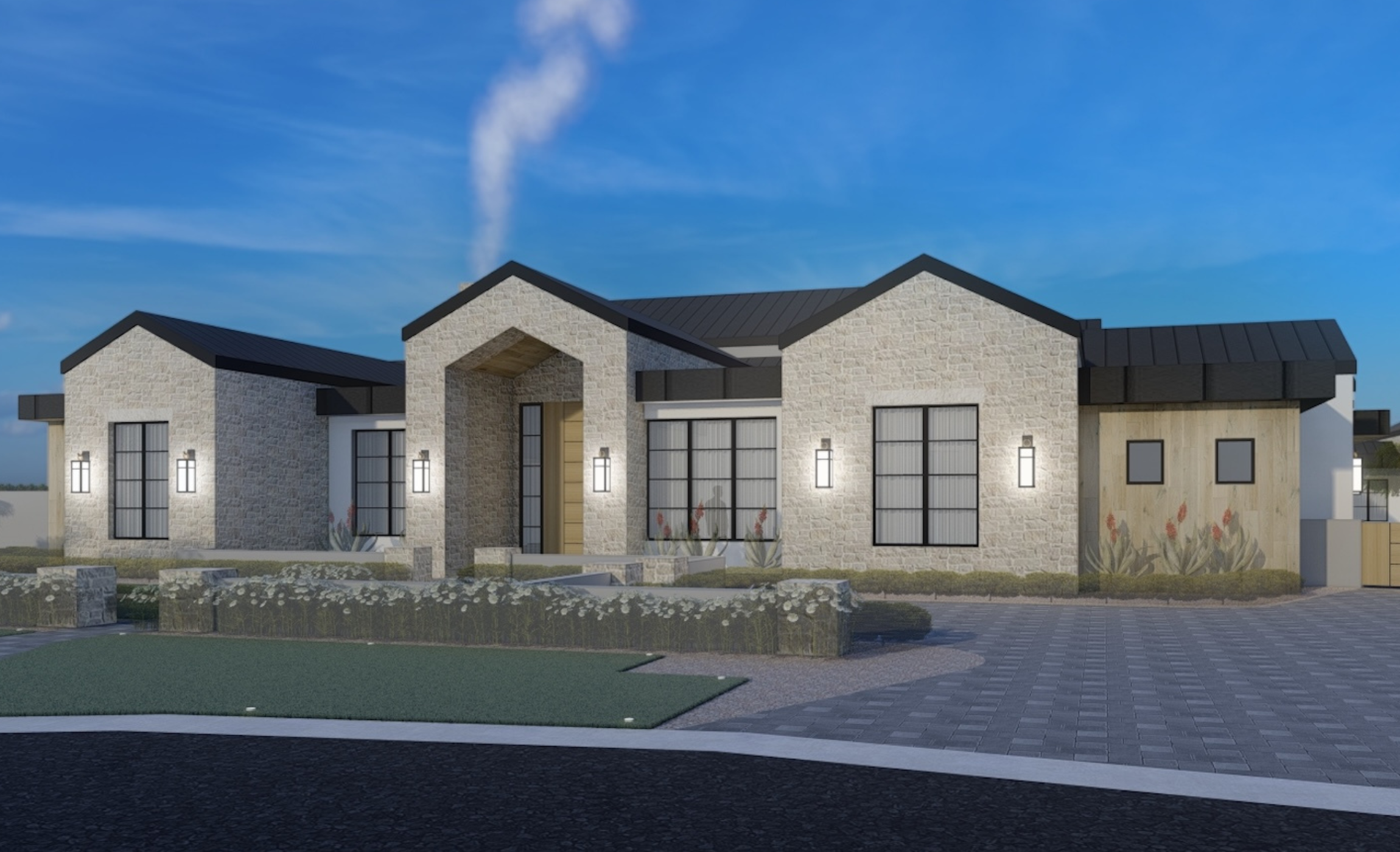 This palette is rooted in natural stone, warm wood tones, and organic materials, contrasted by clean, modern lines. Expansive steel-framed windows and generous outdoor living space, including a pool, sunken fire pit, and covered patios, are designed to create a seamless indoor–outdoor experience. This home is shaping up to be a thoughtful balance of modern design and organic warmth, built to stand out in today’s luxury spec market.