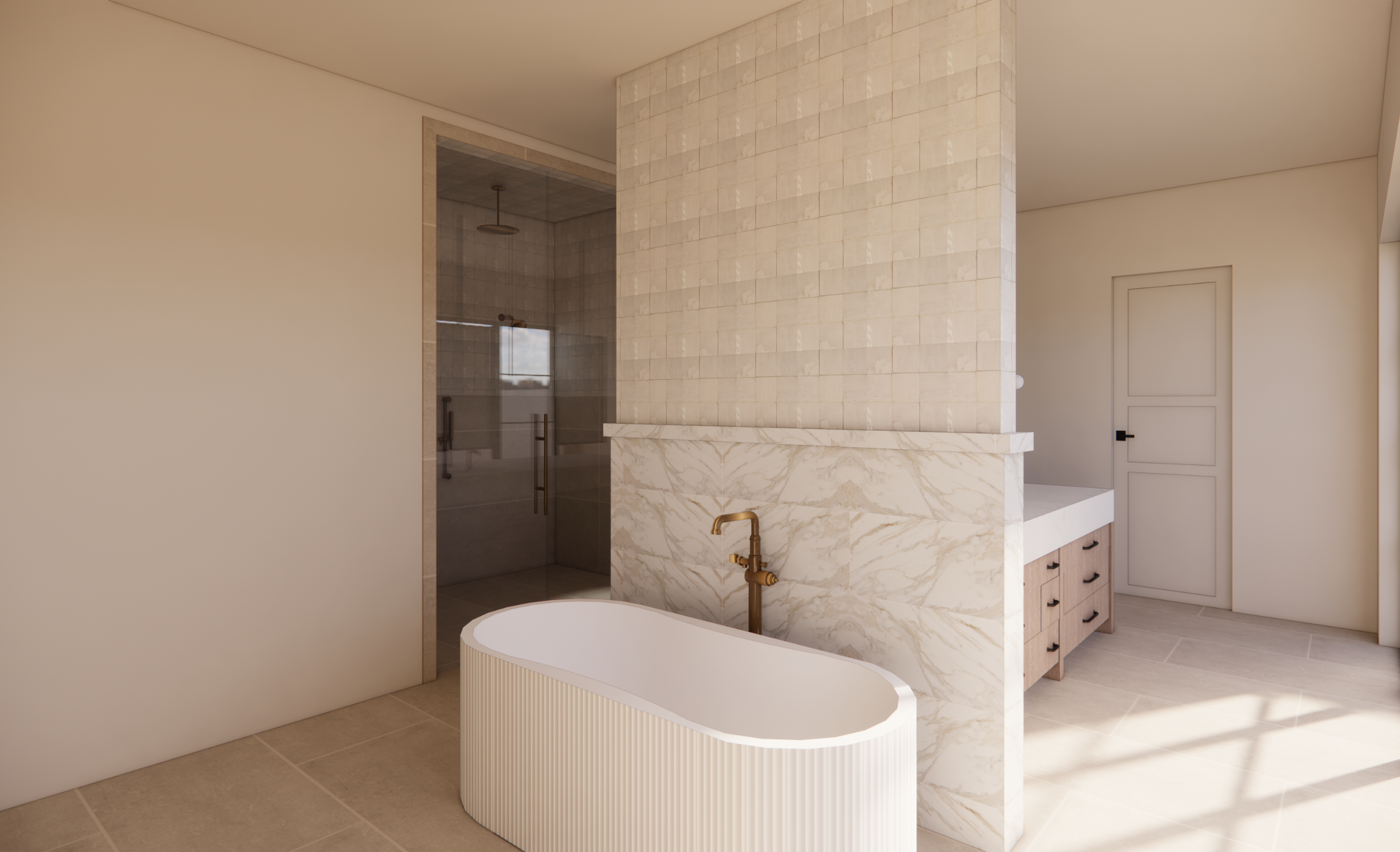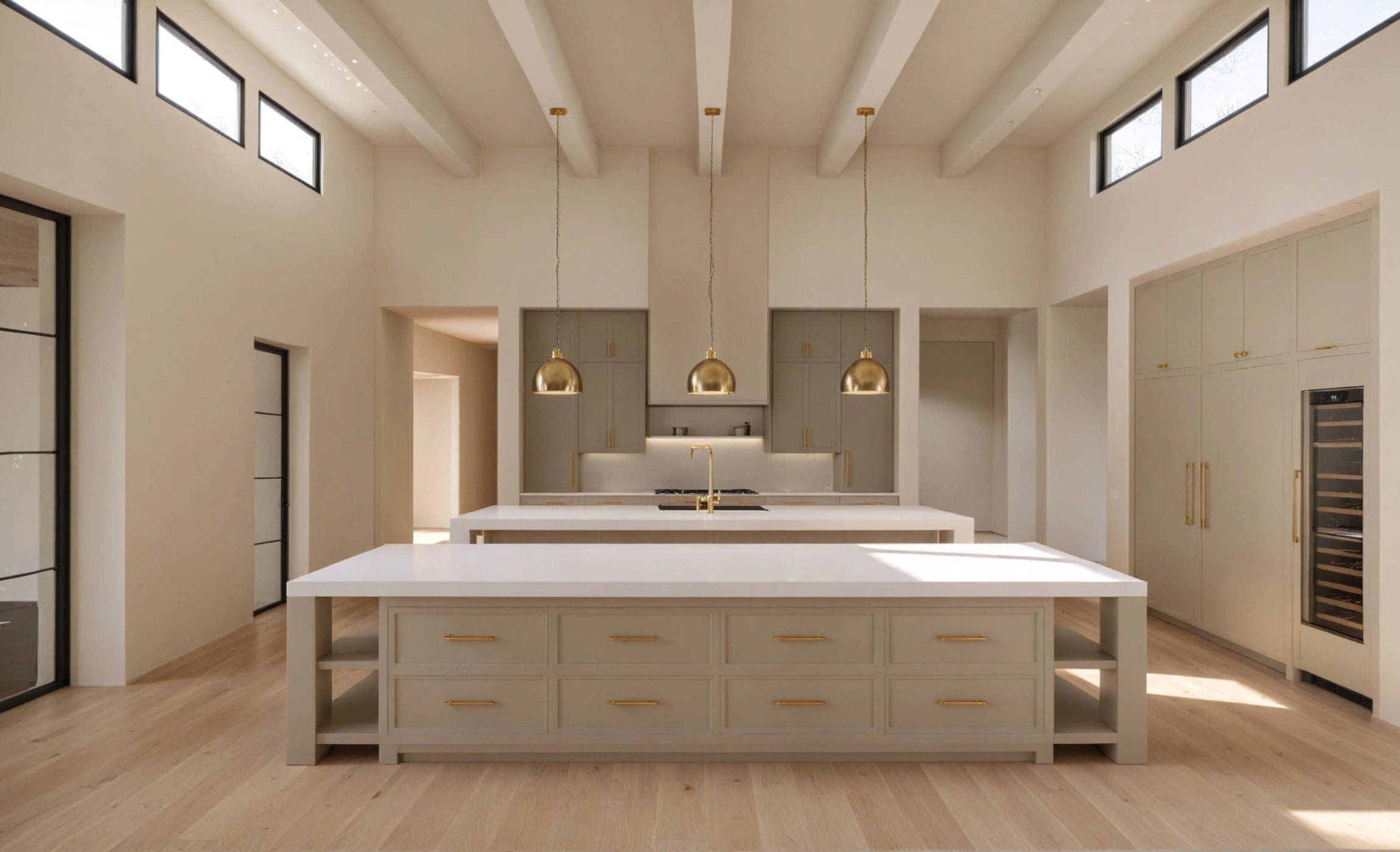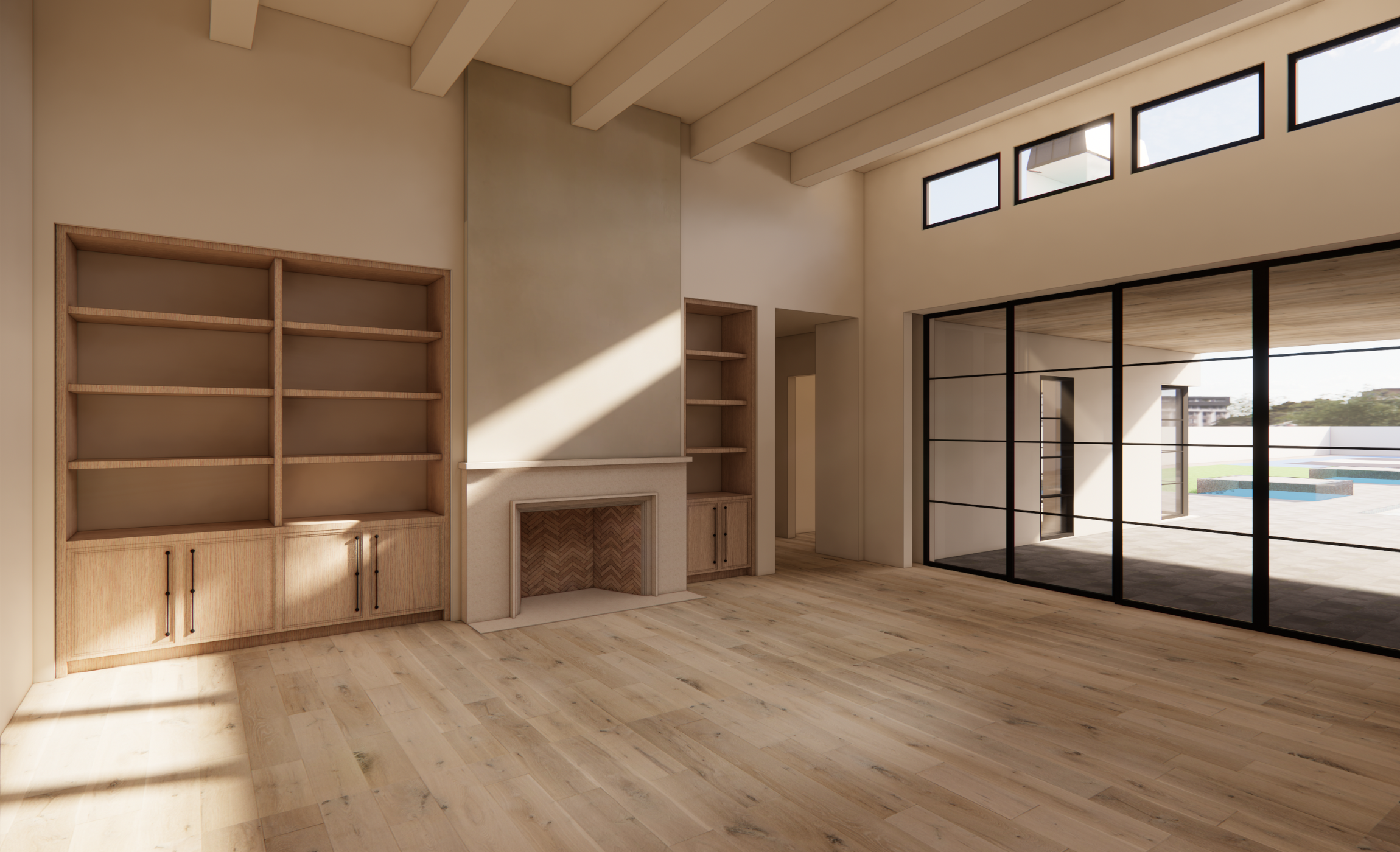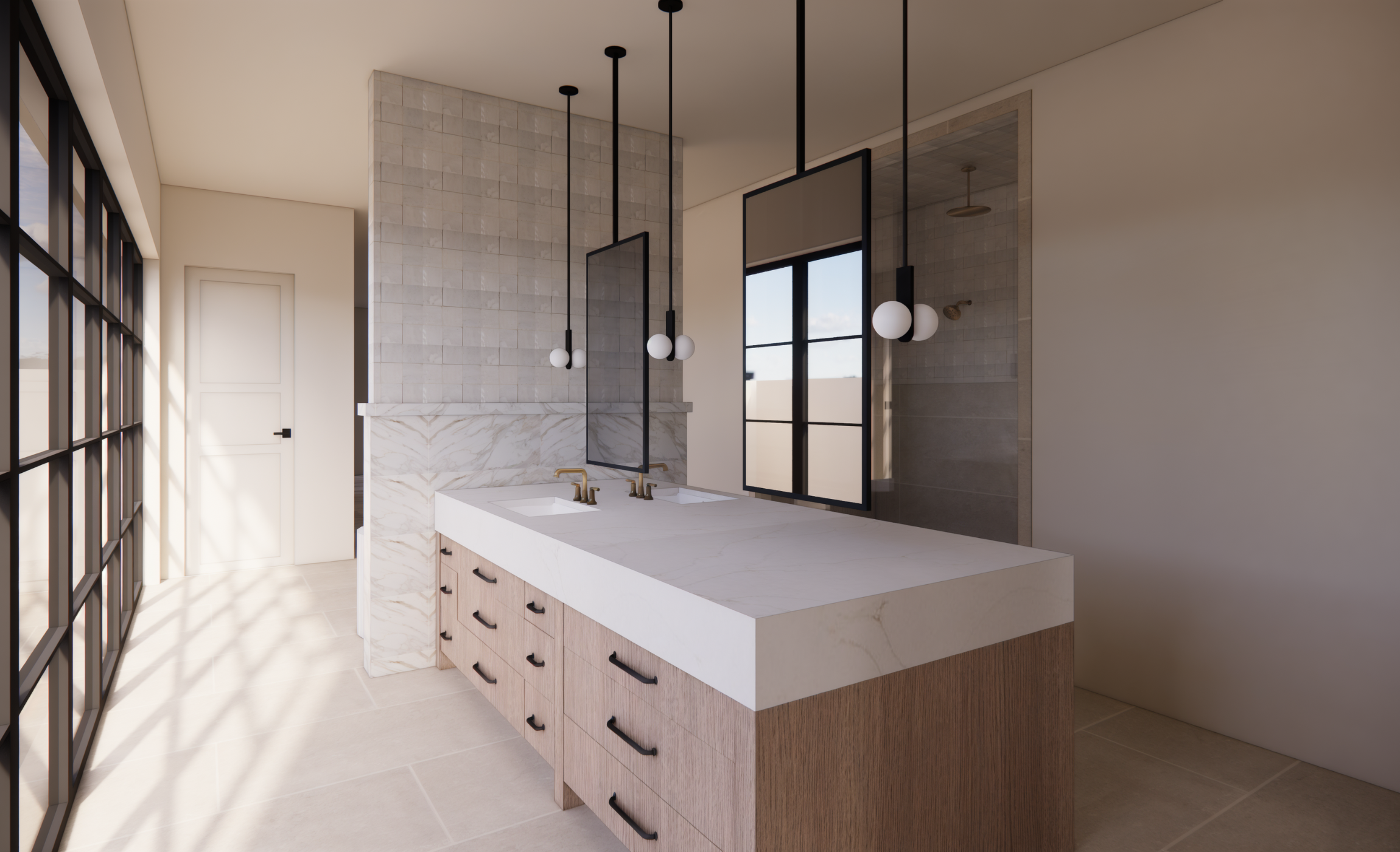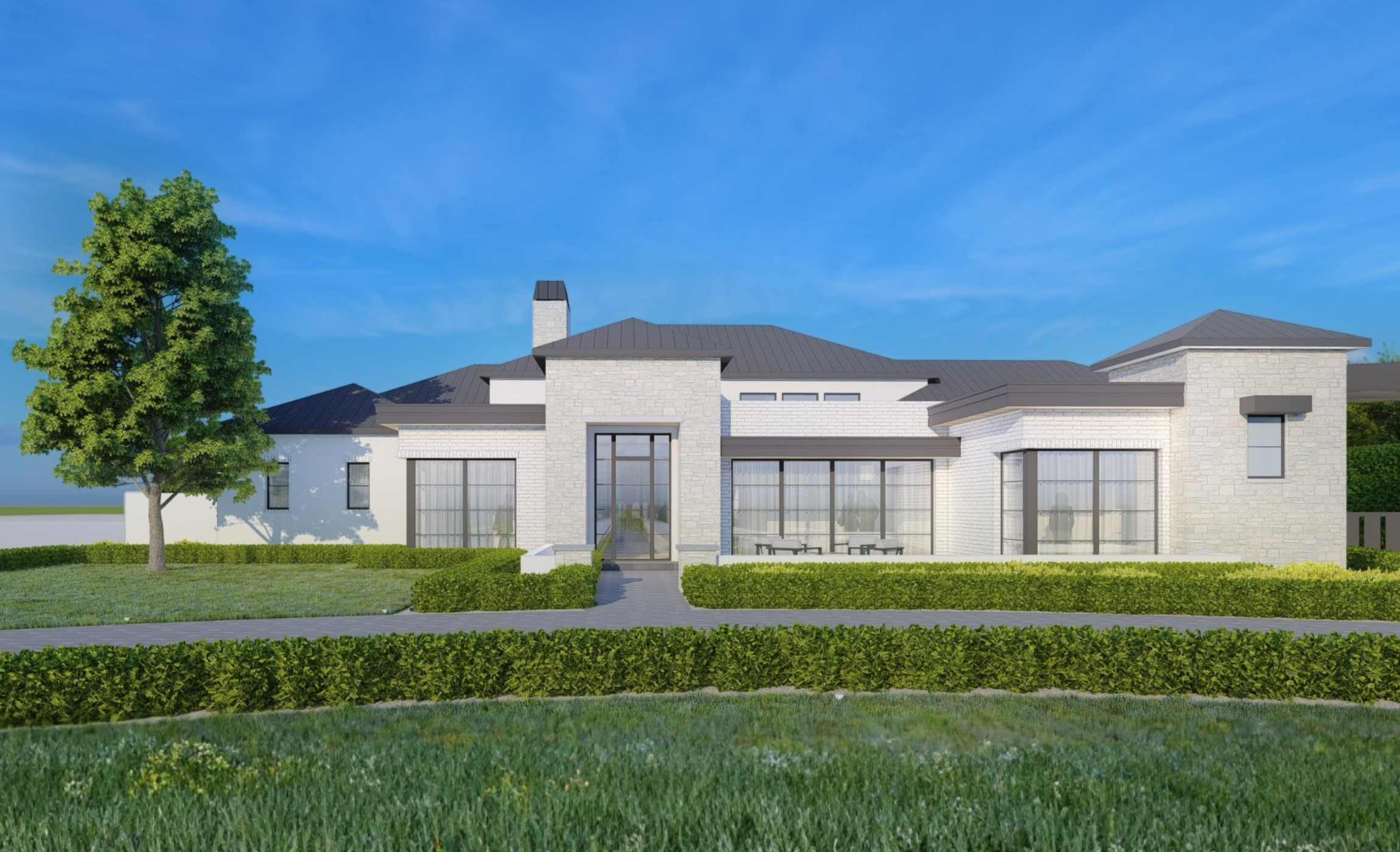 This 6,740-square-foot spec home features six bedrooms and six-and-a-half bathrooms, designed with a tonal, textural, and modern aesthetic accented by subtle industrial touches. A layered palette of stone, brick, limewash, and warm wood brings depth to the home’s clean lines, while refined architectural forms keep the look cohesive and contemporary.