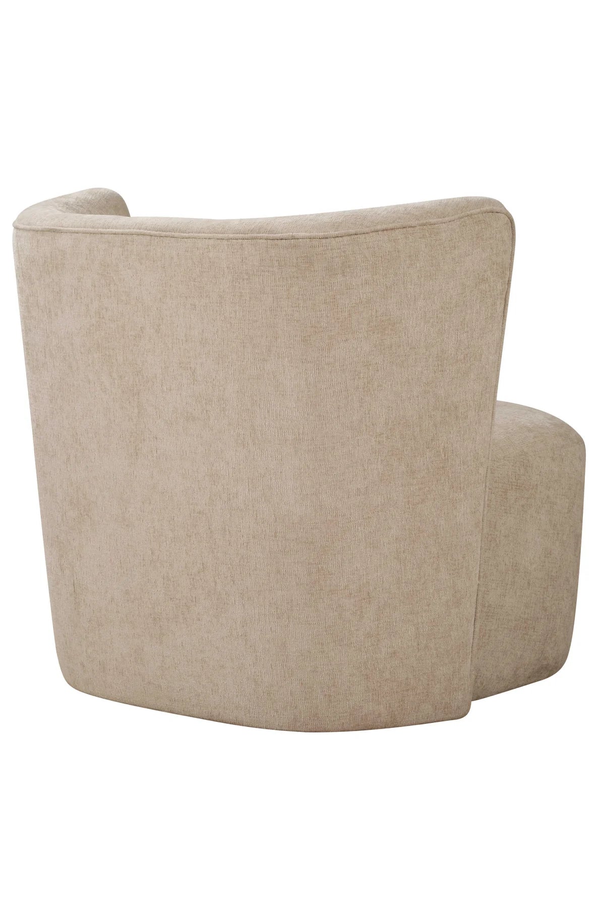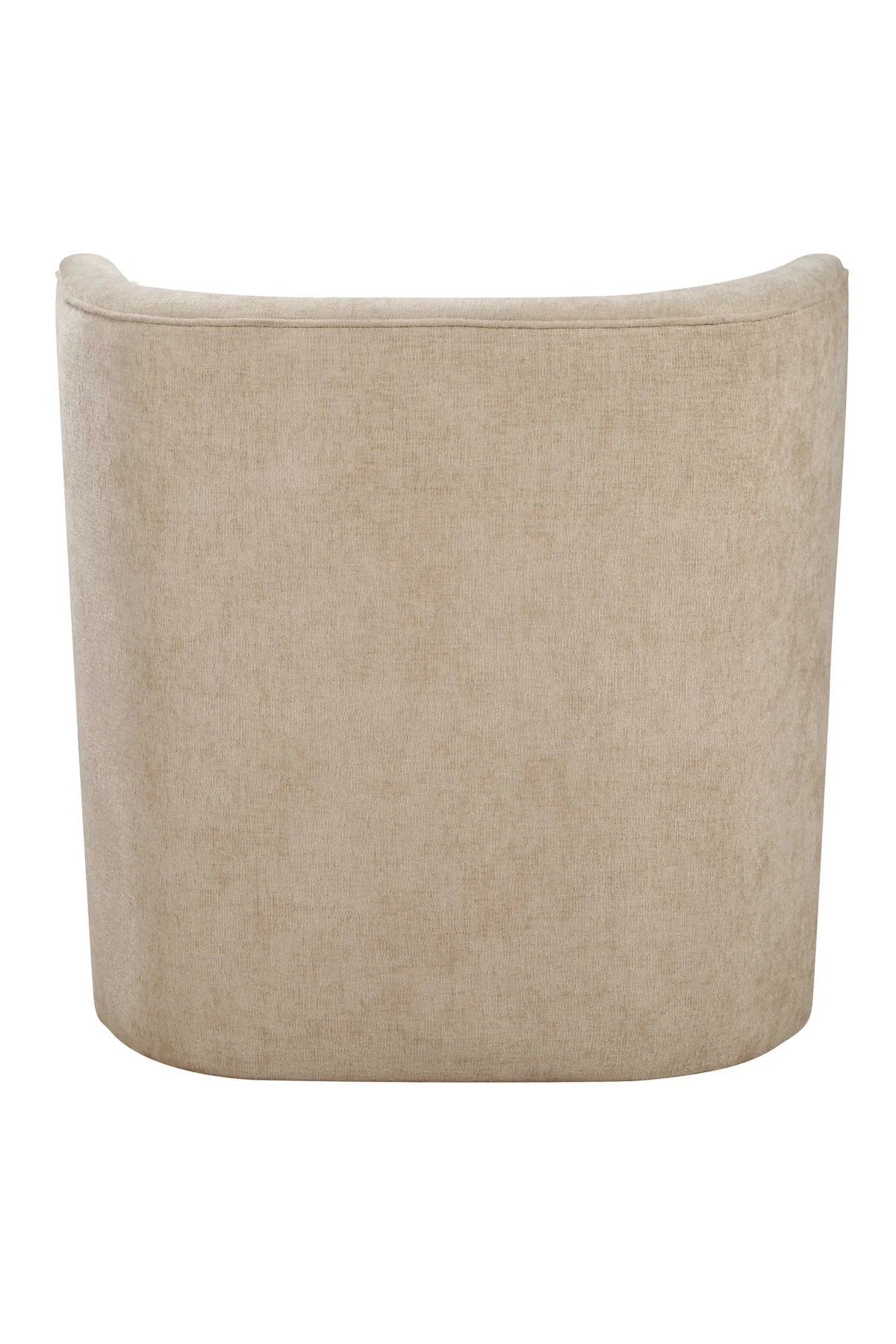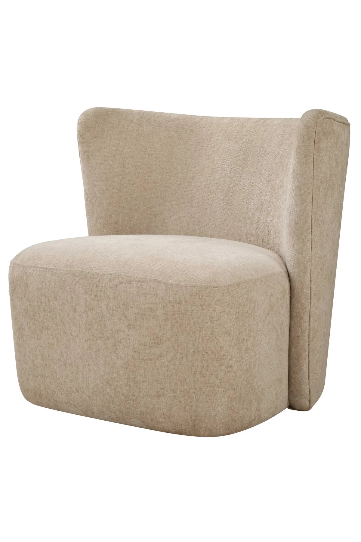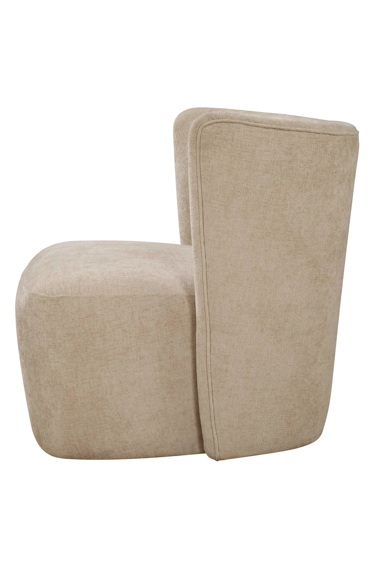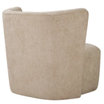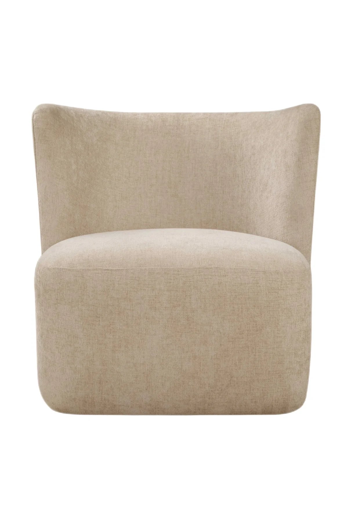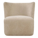 Meet the Outlook Swivel Chair. Subtly modern with a unique wrap around back with inverse angles, atop a hidden swivel base. Upholstered in a finely textured, cleanable polyester in sand.