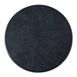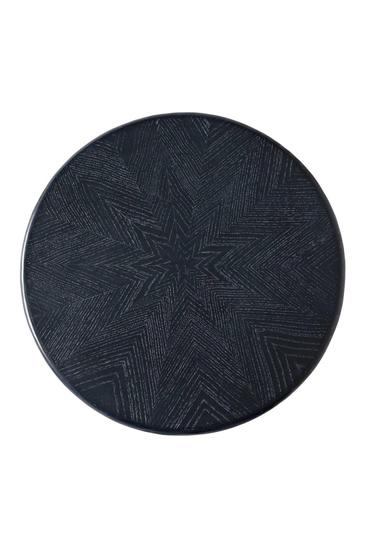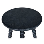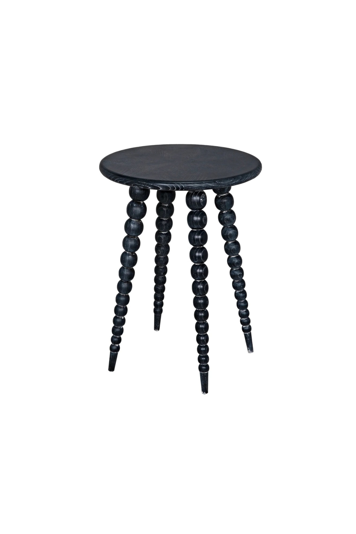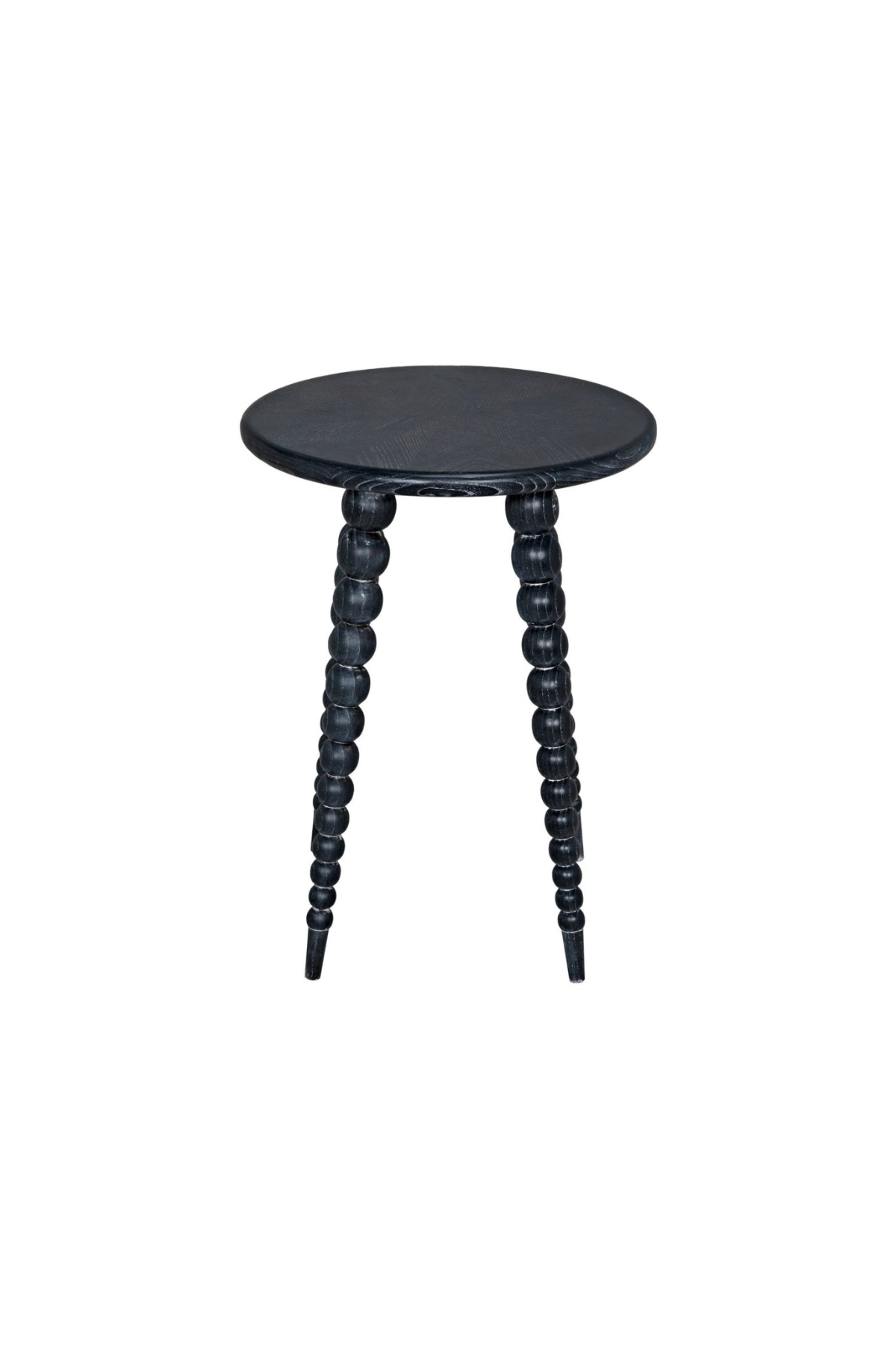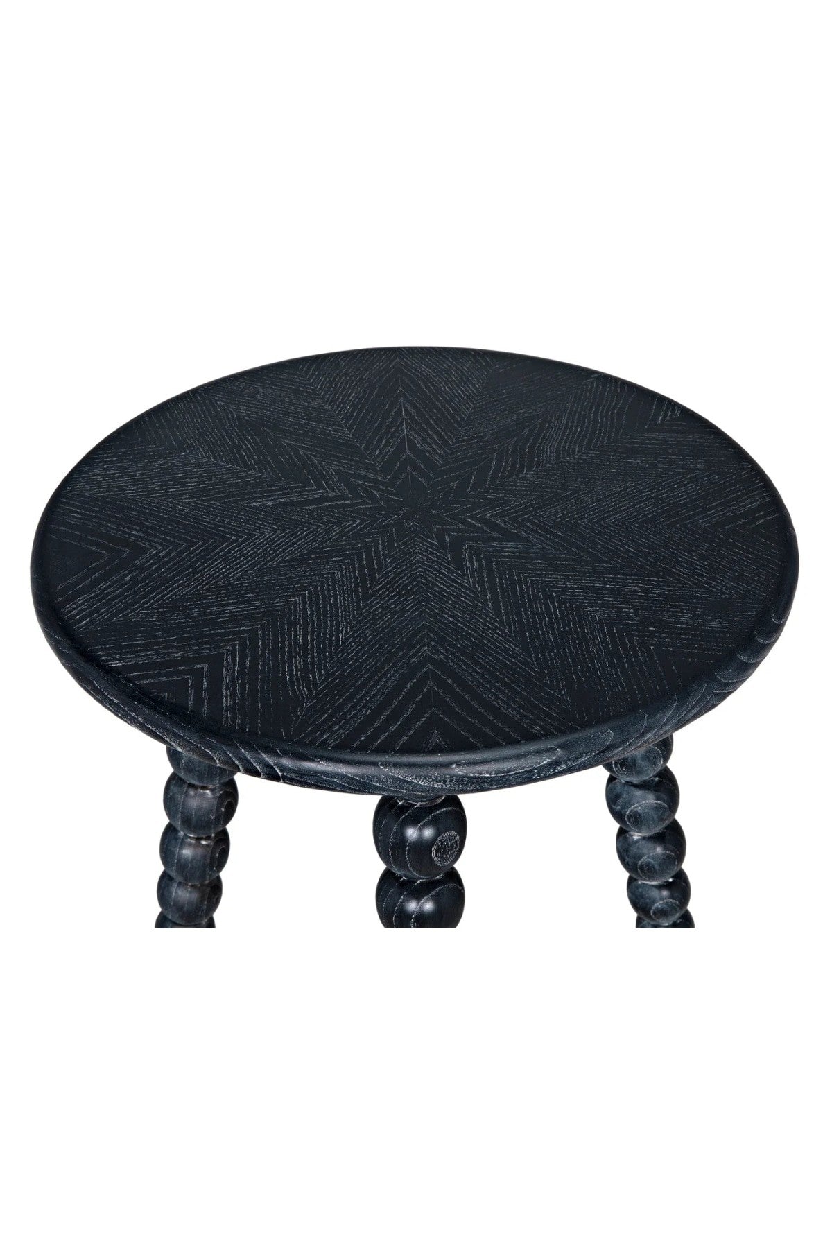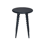 The Rebecca Side Table features four legs of repeating and graduated spheres, ending in a taper foot. Combined with a charcoal black finish with a subtle grain highlight that is uniquely graphic on the pie shaped pieced marquetry style top.