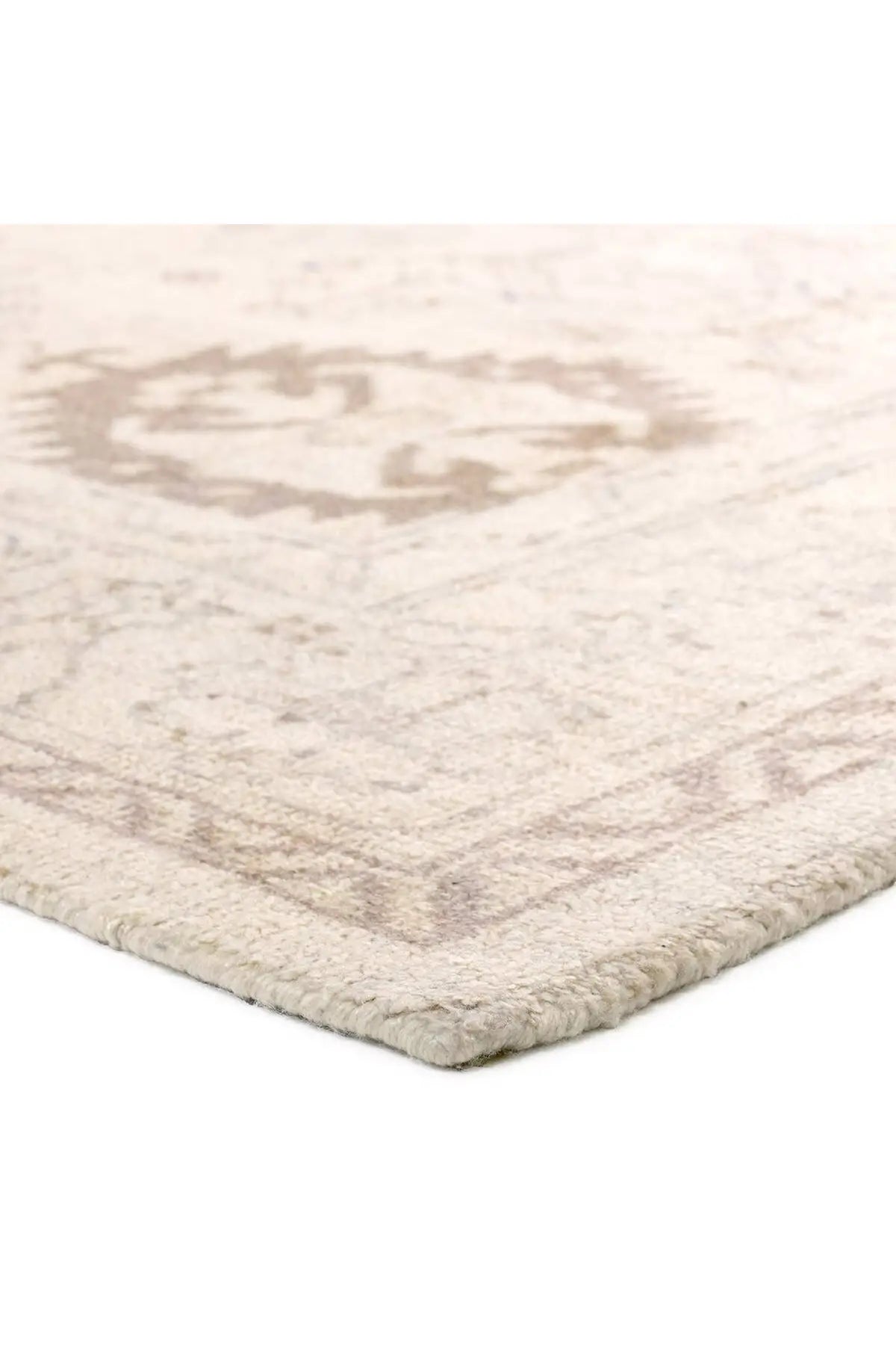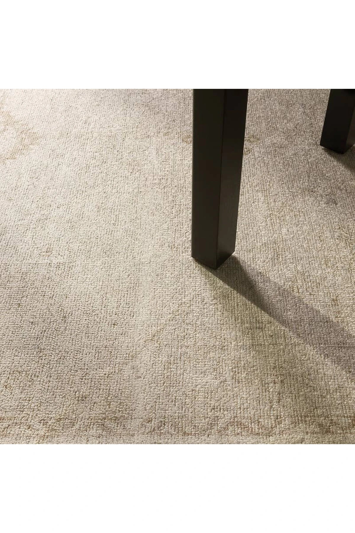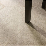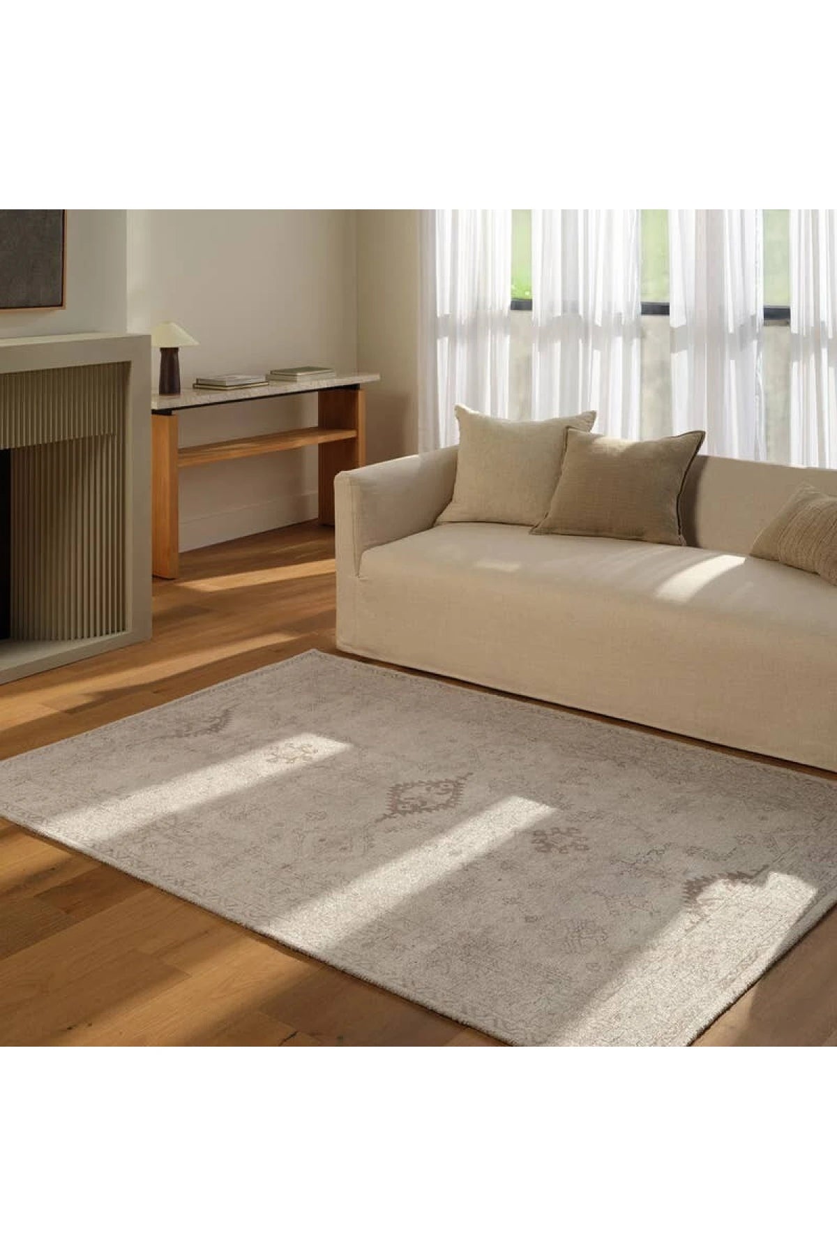 The Casen Rug features a traditional pattern of small medallions, set against a warm tan and beige backdrop with subtle tan accents. Its vintage, distressed look adds character and charm, making it feel like a cherished heirloom from the very first step. Samples are modeled at our North Scottsdale/Phoenix location.