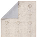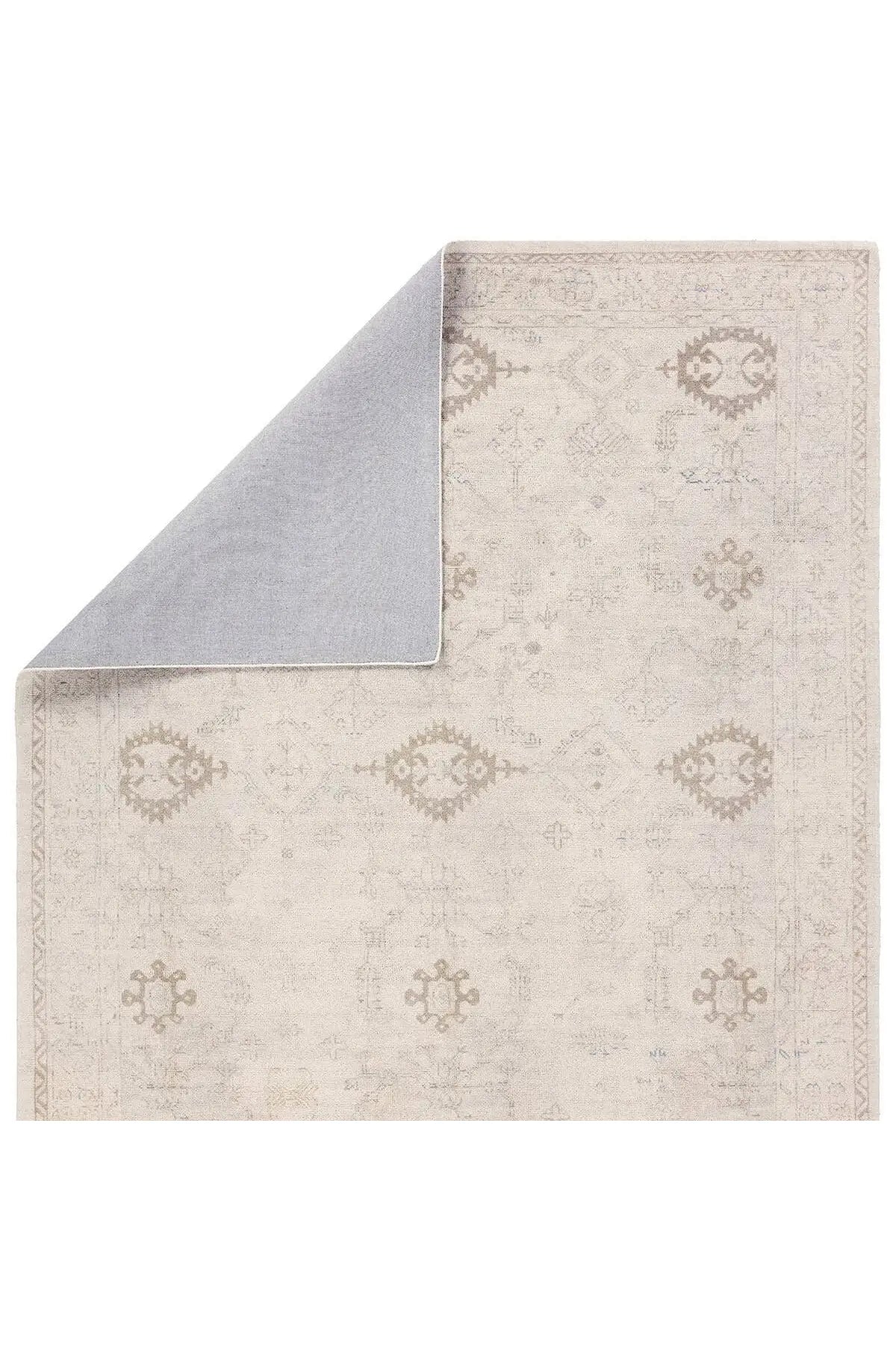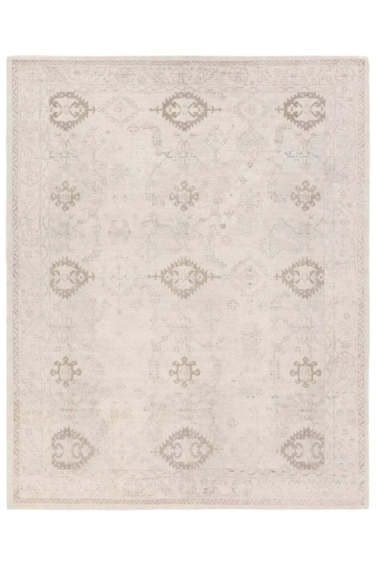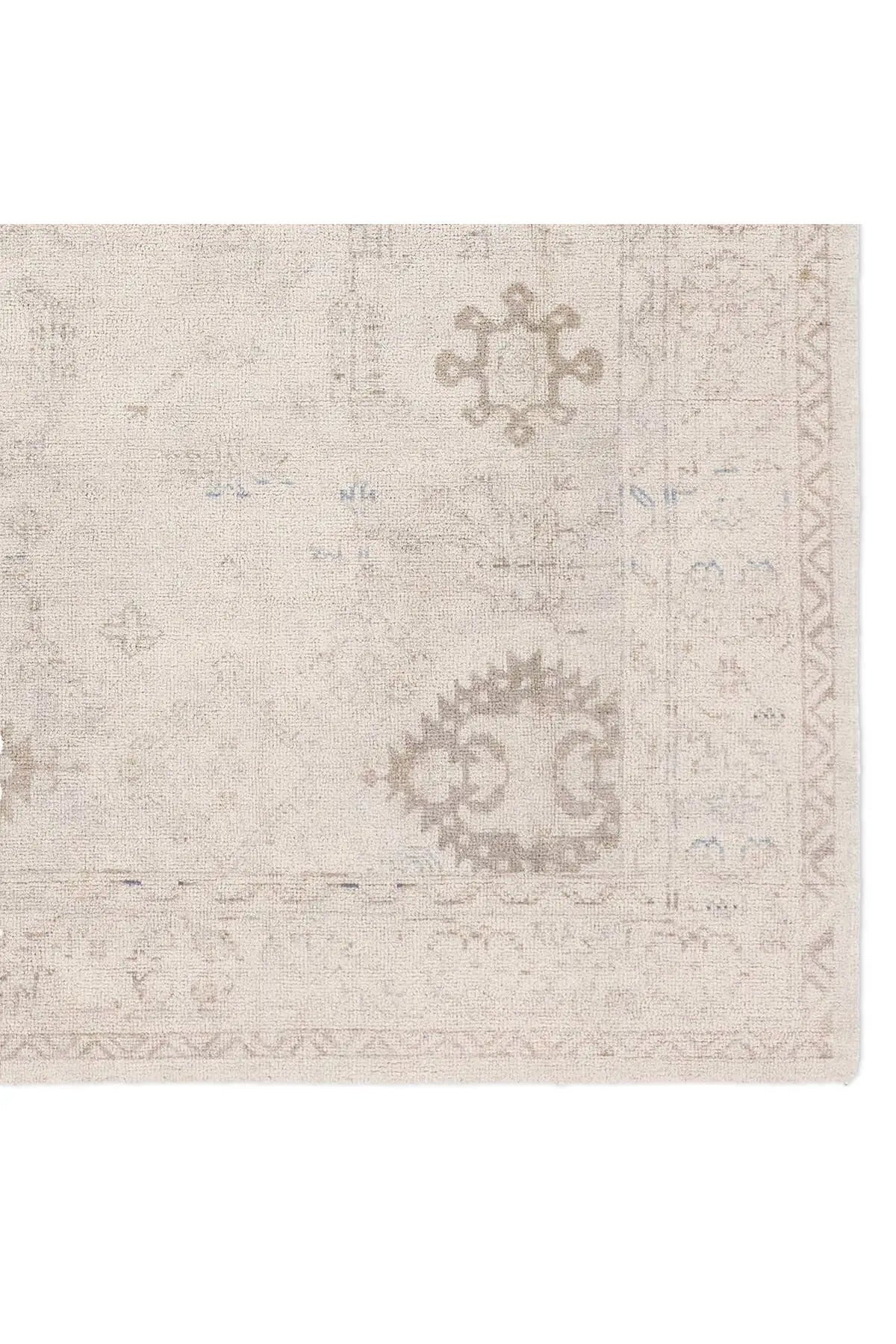 The Casen Rug features a traditional pattern of small medallions, set against a warm tan and beige backdrop with subtle tan accents. Its vintage, distressed look adds character and charm, making it feel like a cherished heirloom from the very first step. Samples are modeled at our North Scottsdale/Phoenix location.