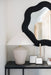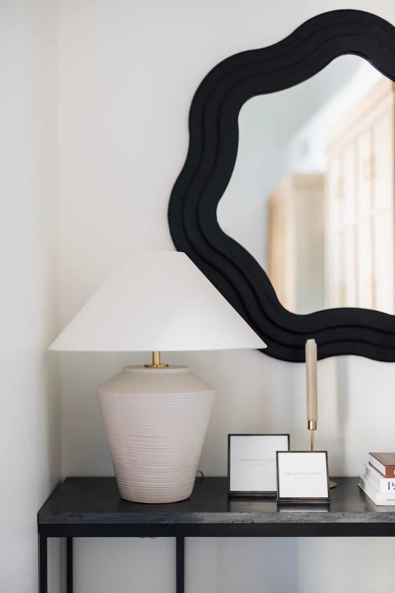 The dramatic Swirl Round Mirror 40" - Charcoal adds a touch of graphic whimsy to your home. Framed by a stepped, solid Ash frame with an oil finish, this mirror will brighten your walls with its bold, organic form.