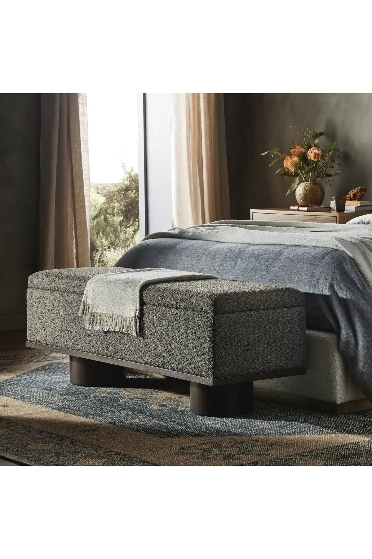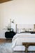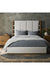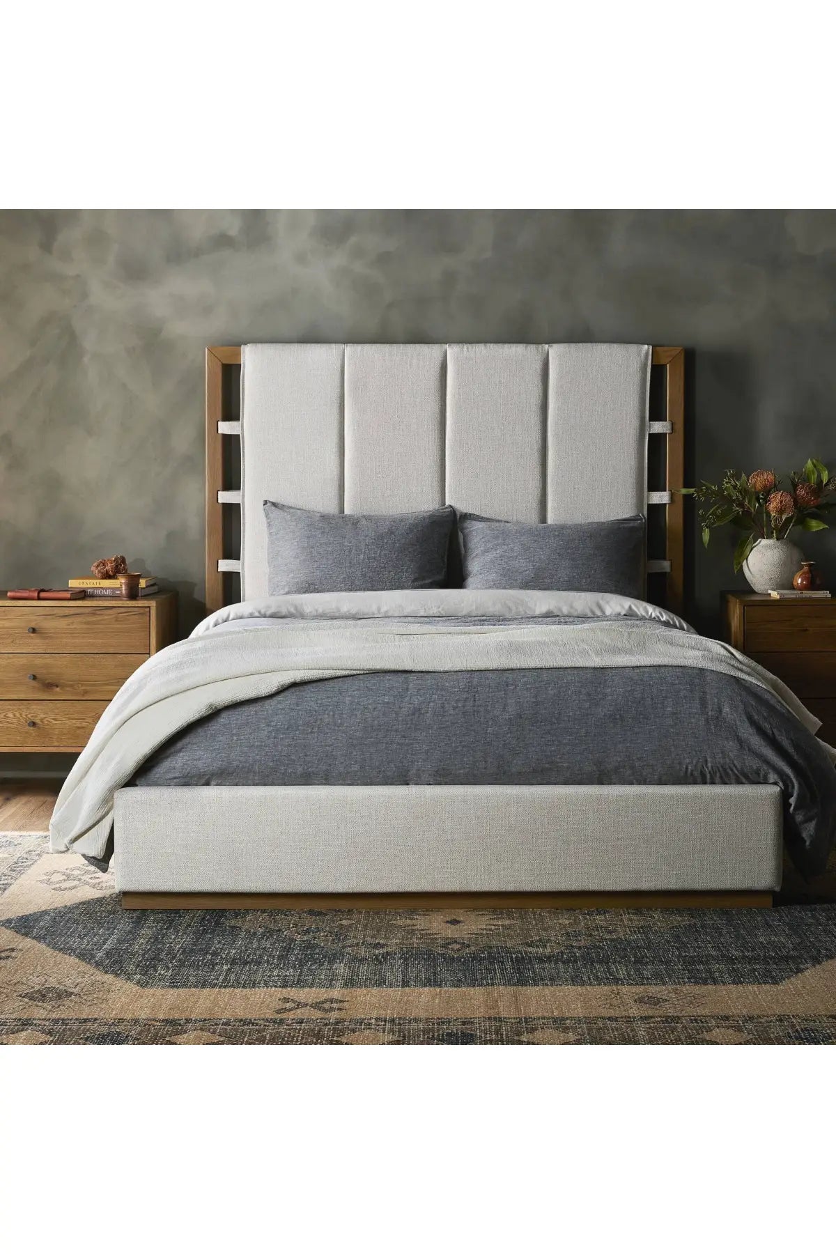 Take bedroom styling to new heights with the Barnett Bed. Framed by a plinth-style base of burnished solid oak, light, linen-like upholstery creates a well-tailored headboard, with vertical channeling and unique strap detailing. Slats included.