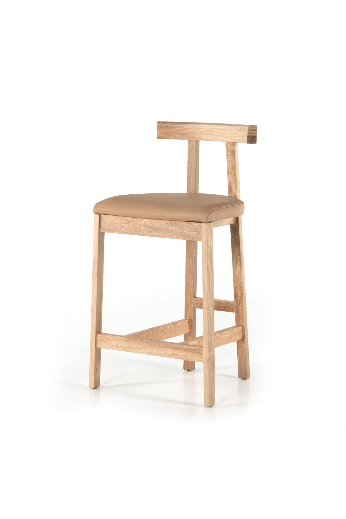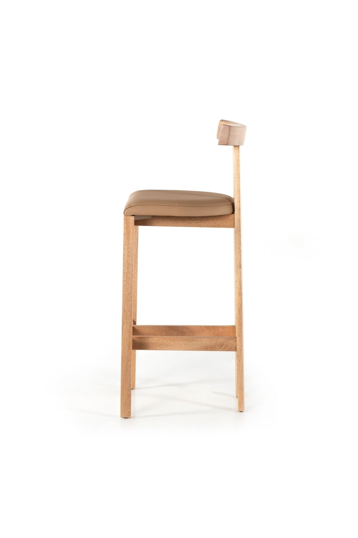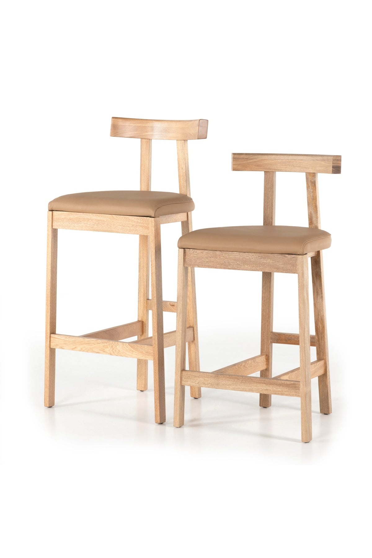 Meet the Tex Bar + Counter Stool. Opt for a beautifully monochromatic look inspired by Greek design with the Tex Stool. Solid Rosa Morada forms a T-shape frame for light tan top-grain leather seating perfectly sized for the counter or bar.