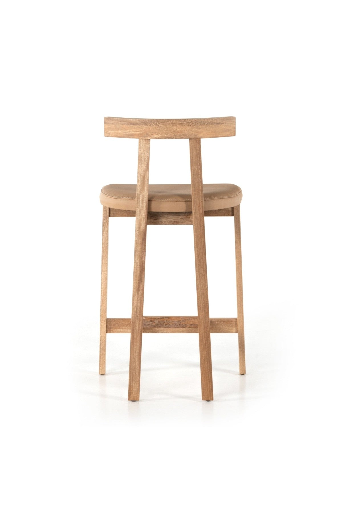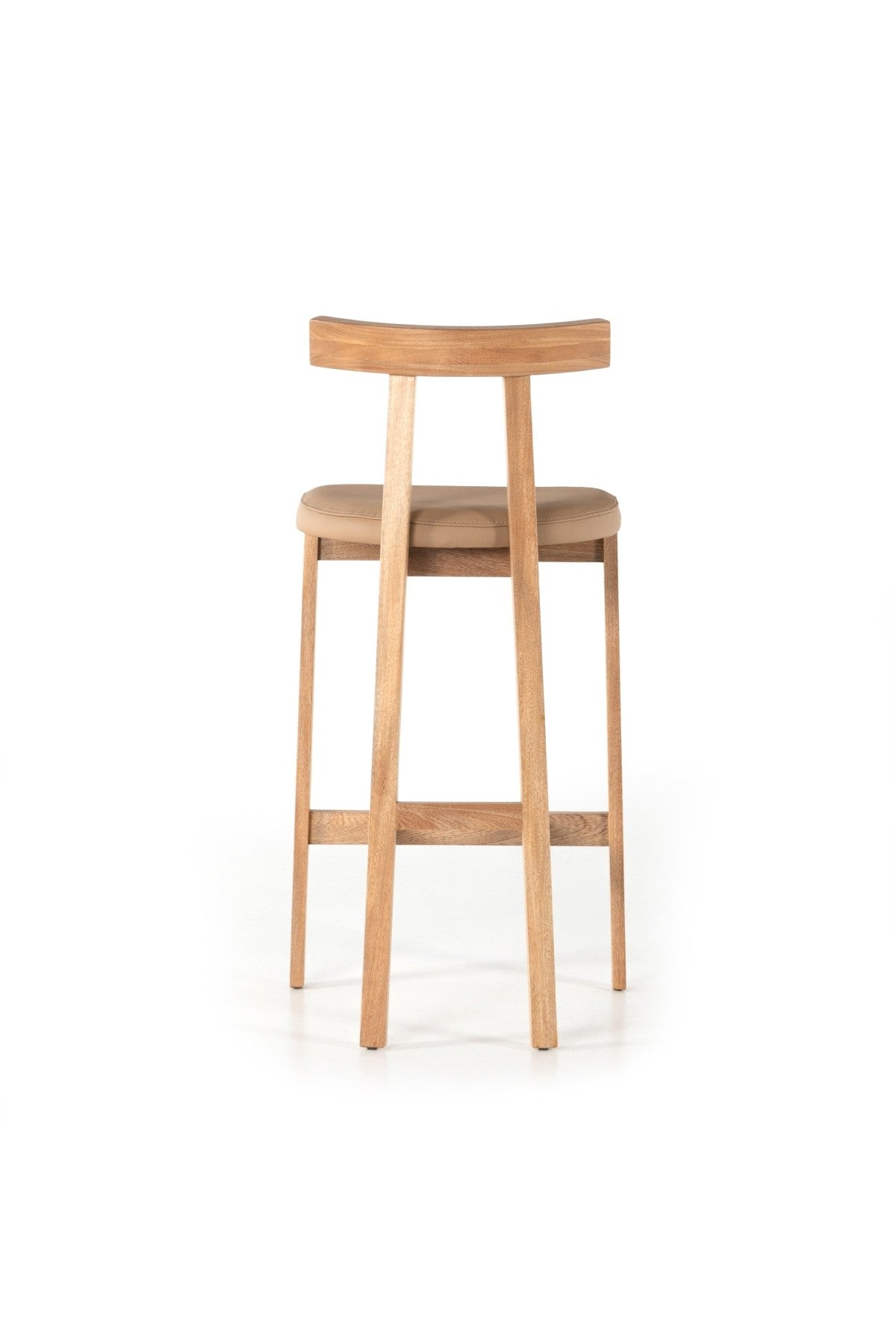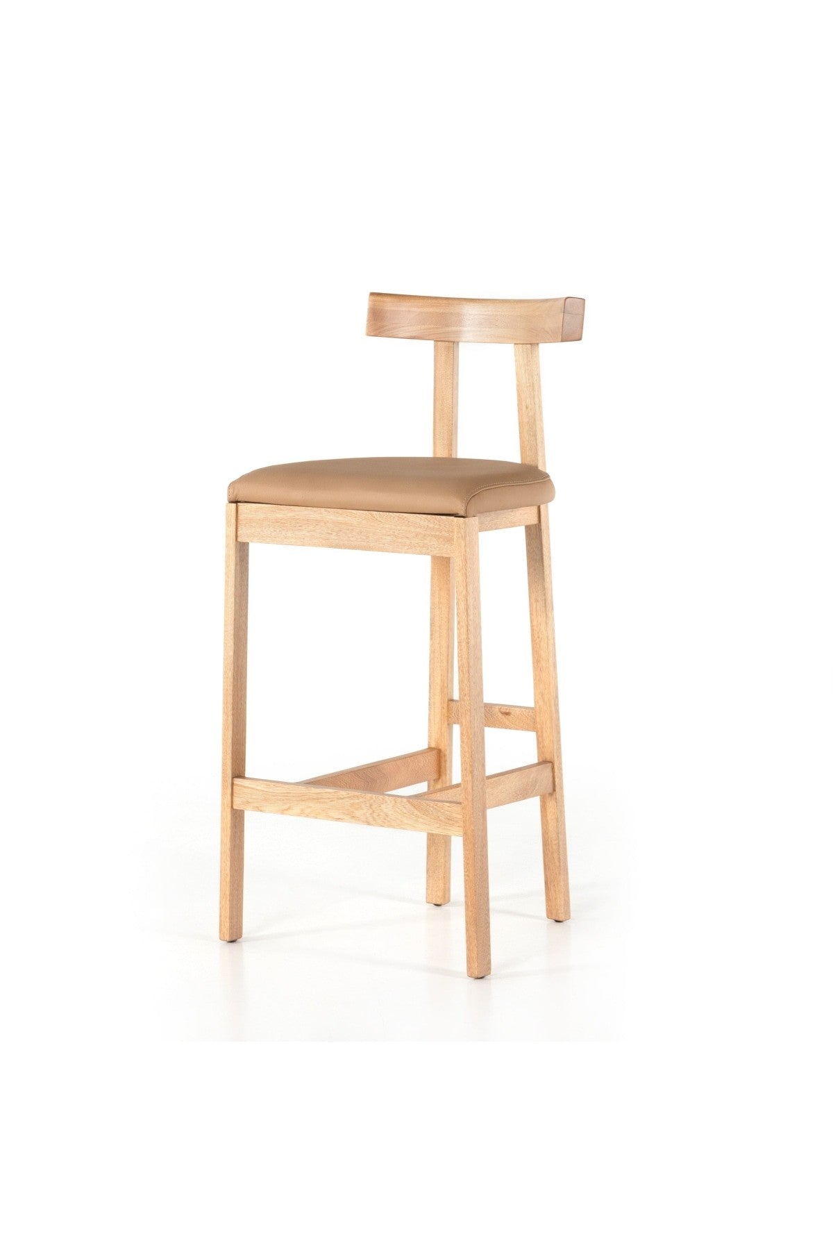 Meet the Tex Bar + Counter Stool. Opt for a beautifully monochromatic look inspired by Greek design with the Tex Stool. Solid Rosa Morada forms a T-shape frame for light tan top-grain leather seating perfectly sized for the counter or bar.