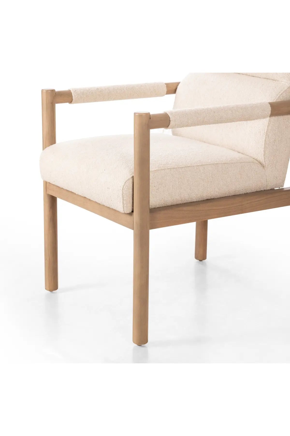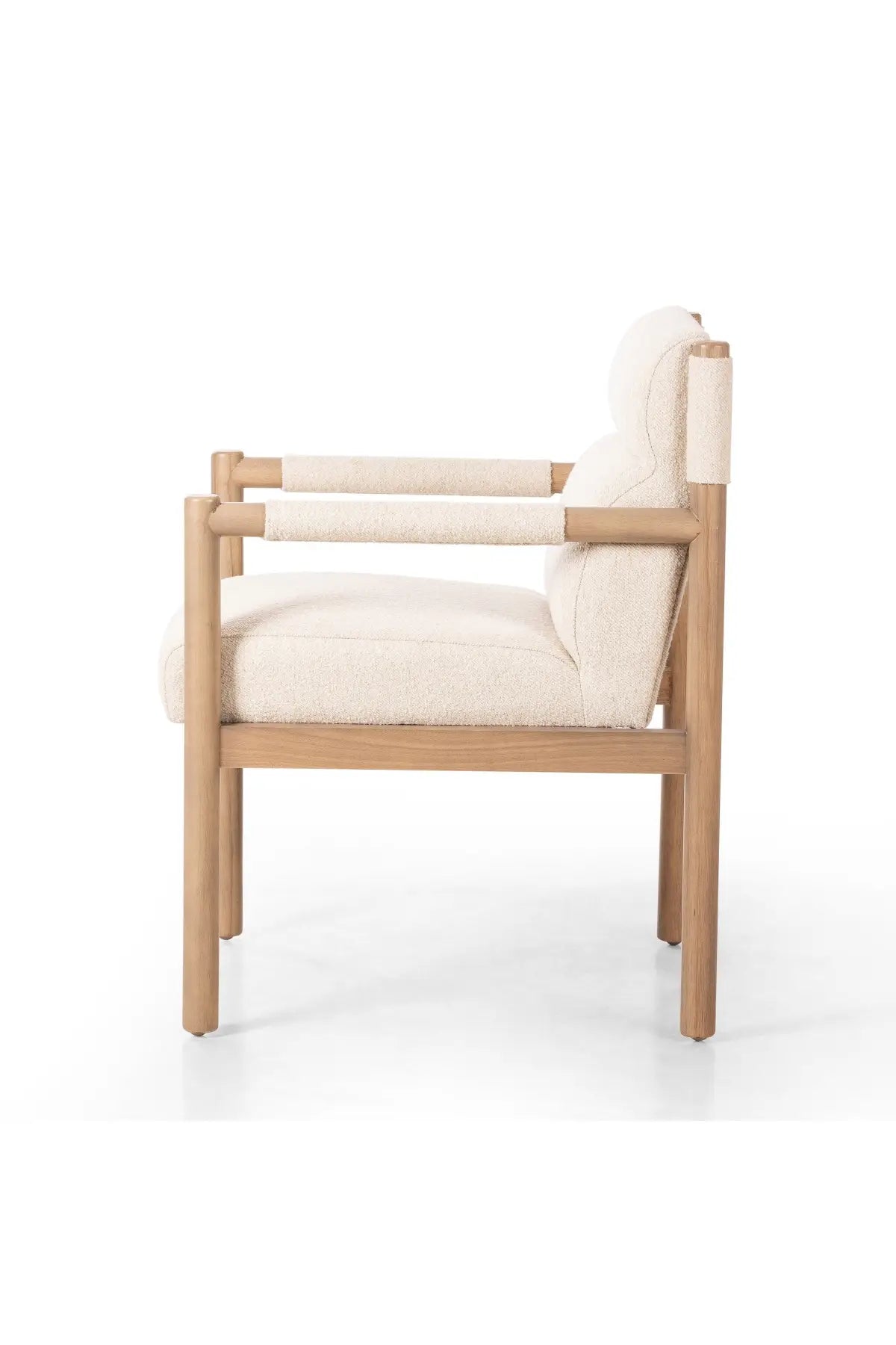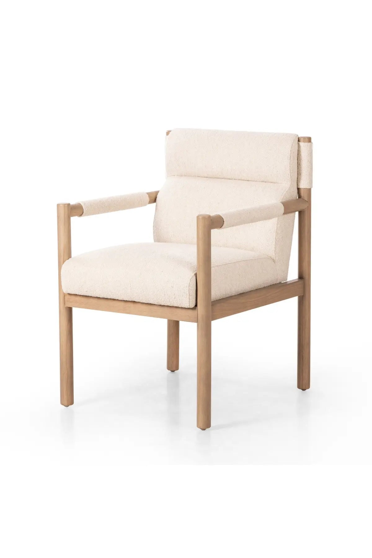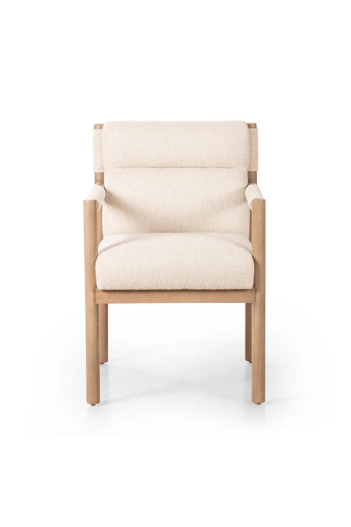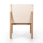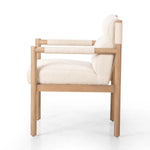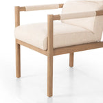 Meet the Kiano Dining Armchair. Oatmeal-colored high-performance fabric features wide channeling for comfort, with natural-finished parawood legs for a clean, monochromatic look.