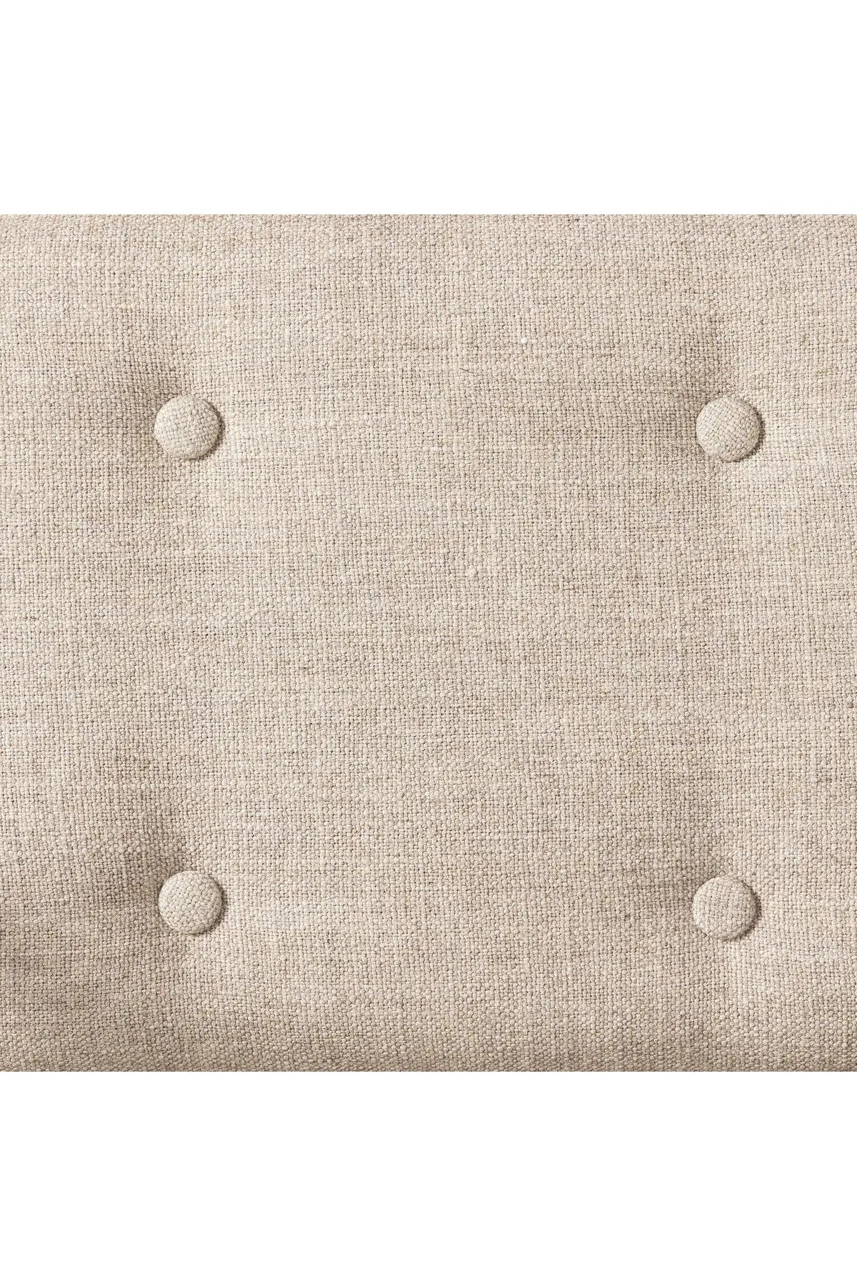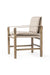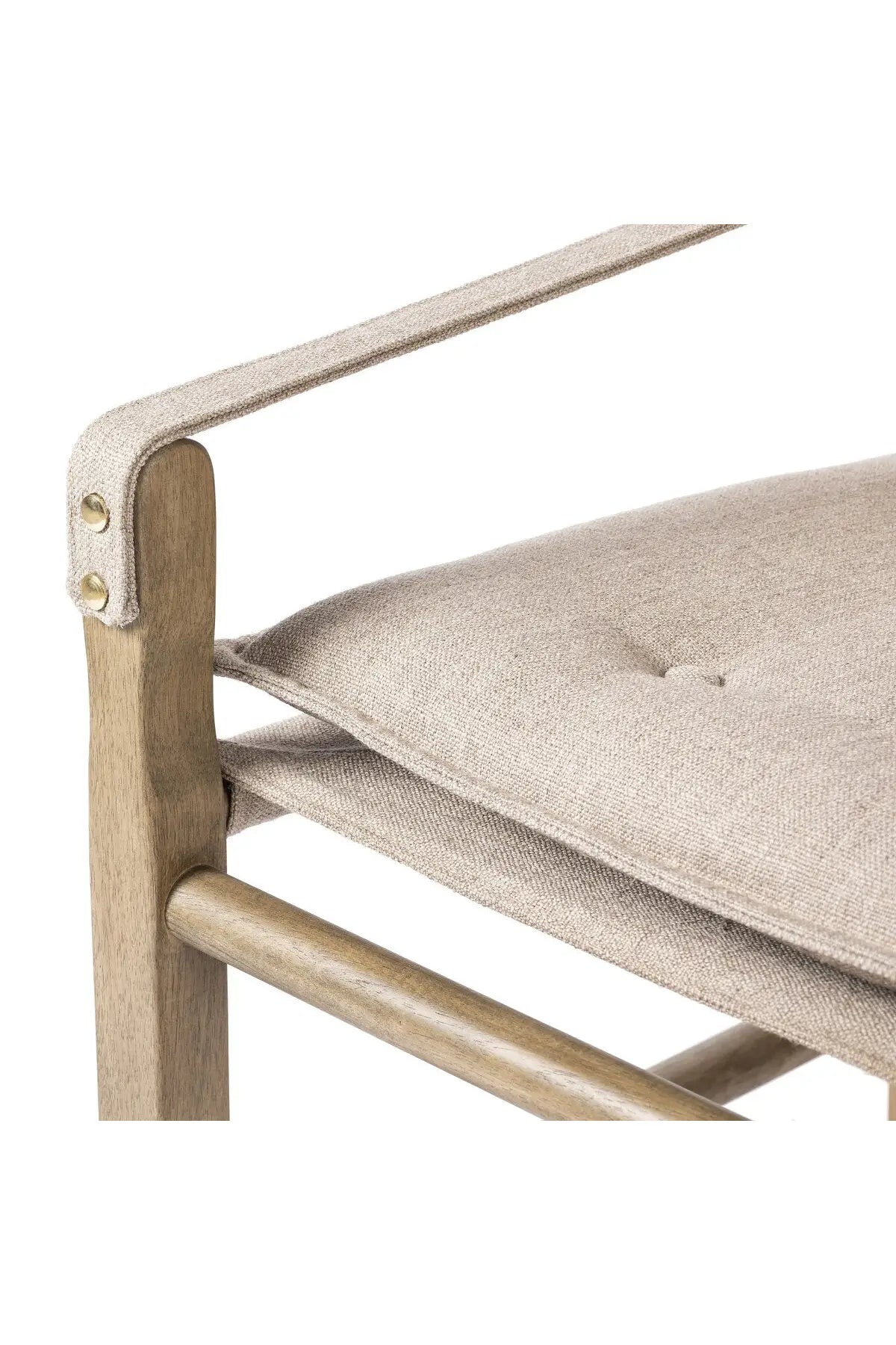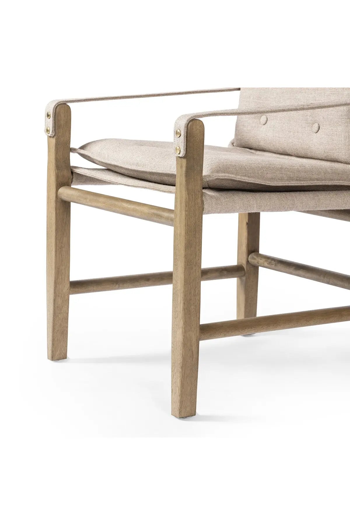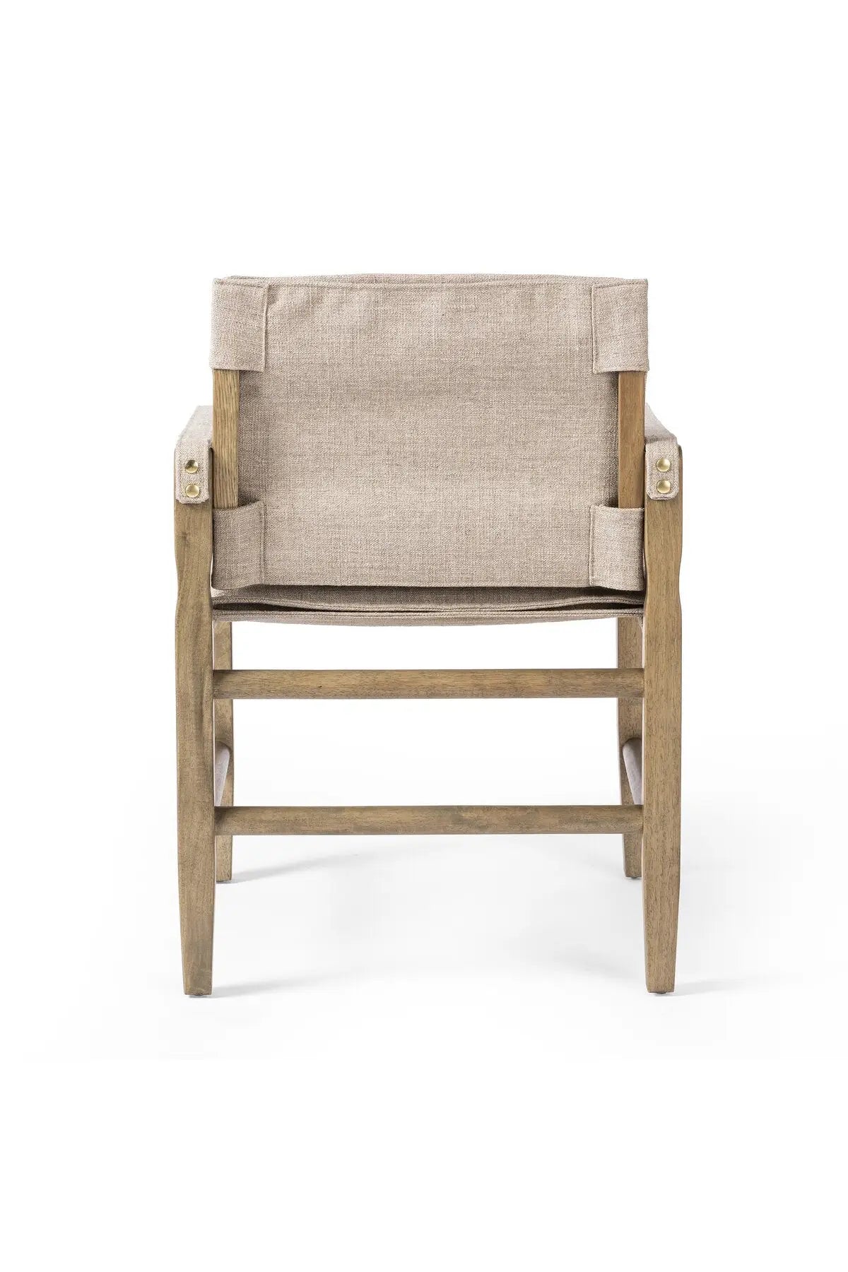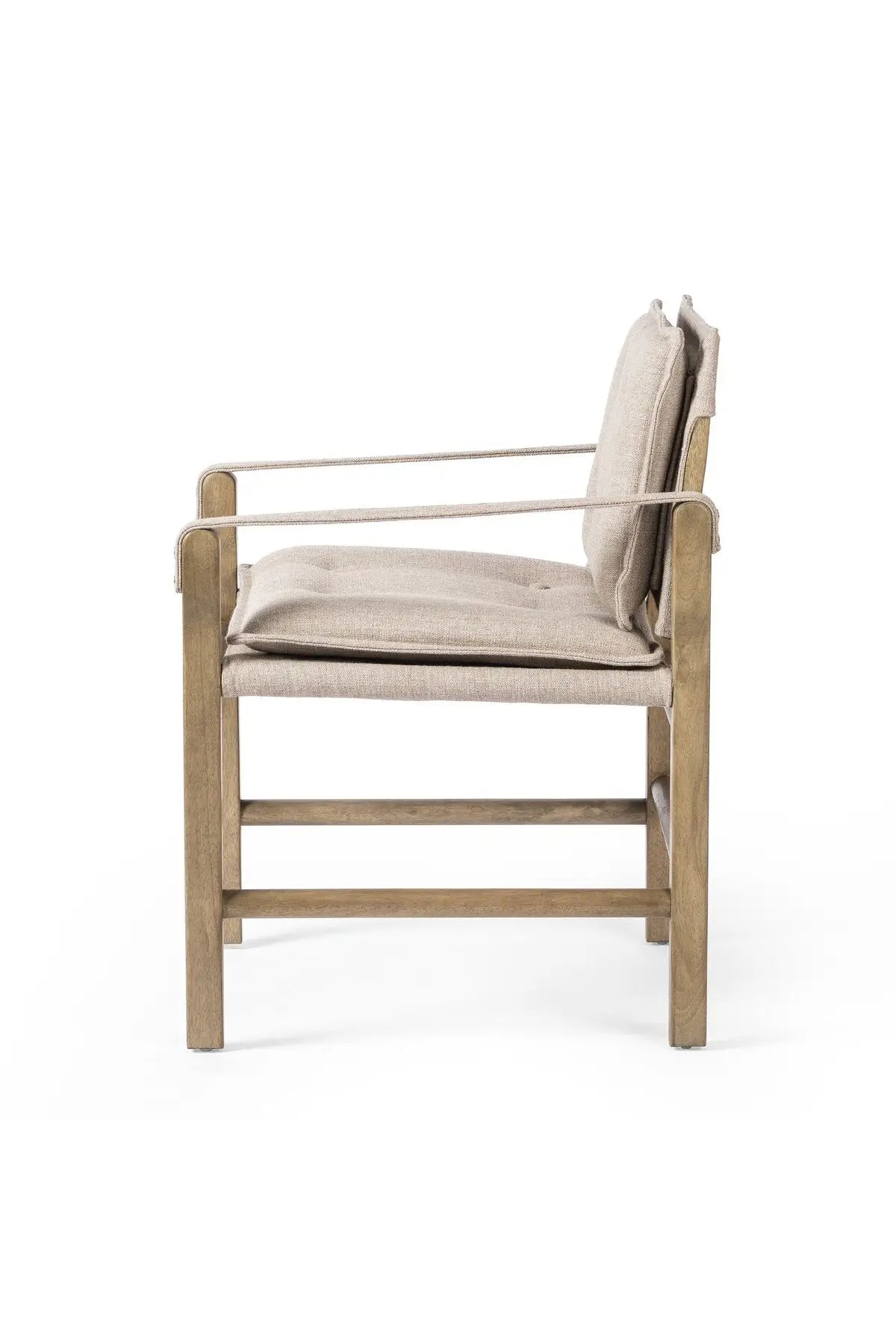 Inspired by a vintage safari-style frame, the Lenz Dining Armchair is defined by the fluid strap arms. Semi-attached cushions in taupe performance fabric, finished with button tufting details. Framed out by warm parawood. Performance fabrics are specially created to withstand spills, stains, high traffic and wear, ensuring long-term comfort and unmatched durability.