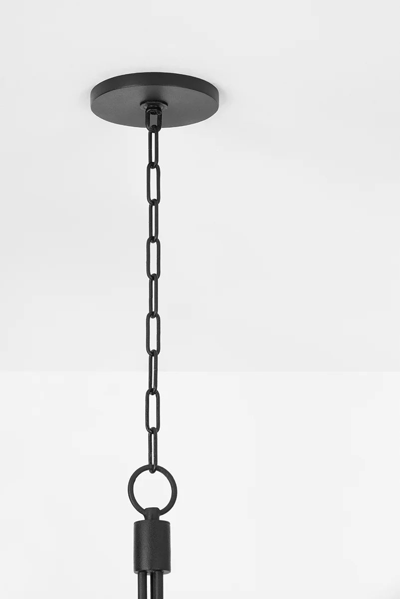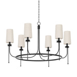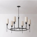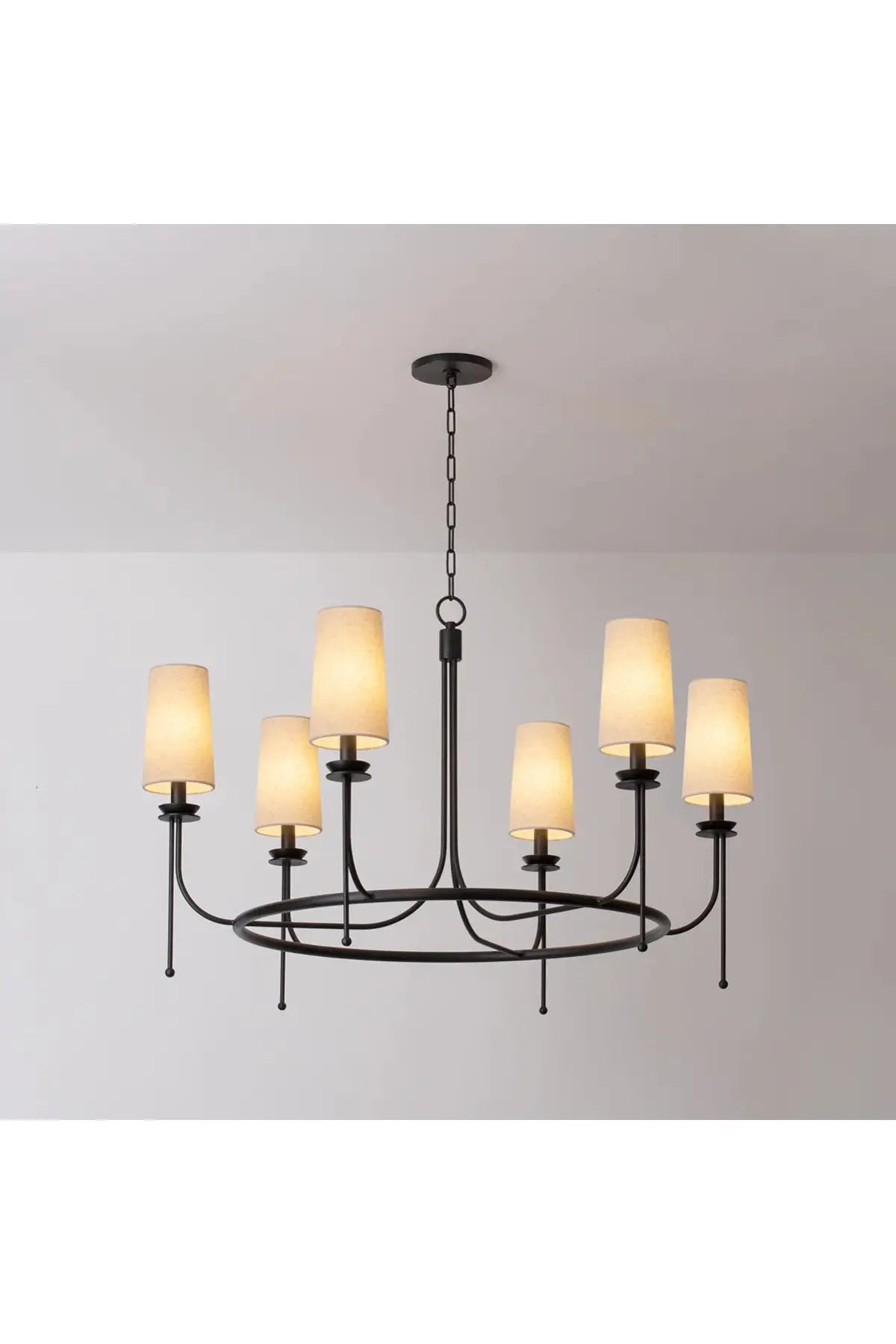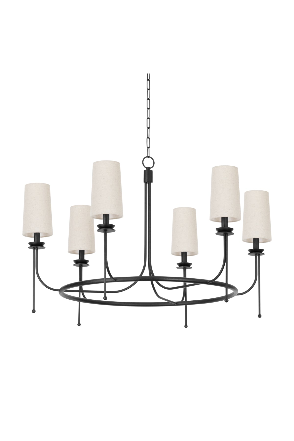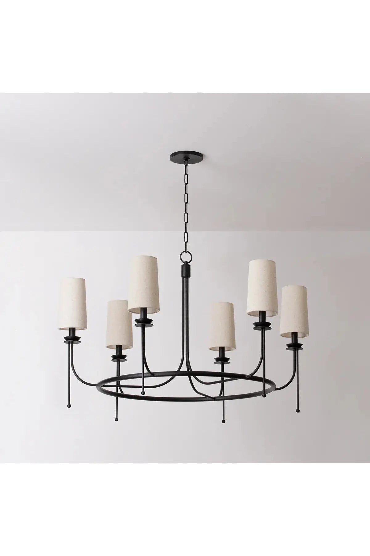 Calder is a celebration of artistry with a silhouette inspired by a vintage candle holder. The graphic, lightweight linework of this family makes the candles appear as if they are floating upwards, drawing the eye towards them. The Forged Iron framework and natural linen shade combination is fresh and uplifting. Bulb(s) not included.