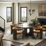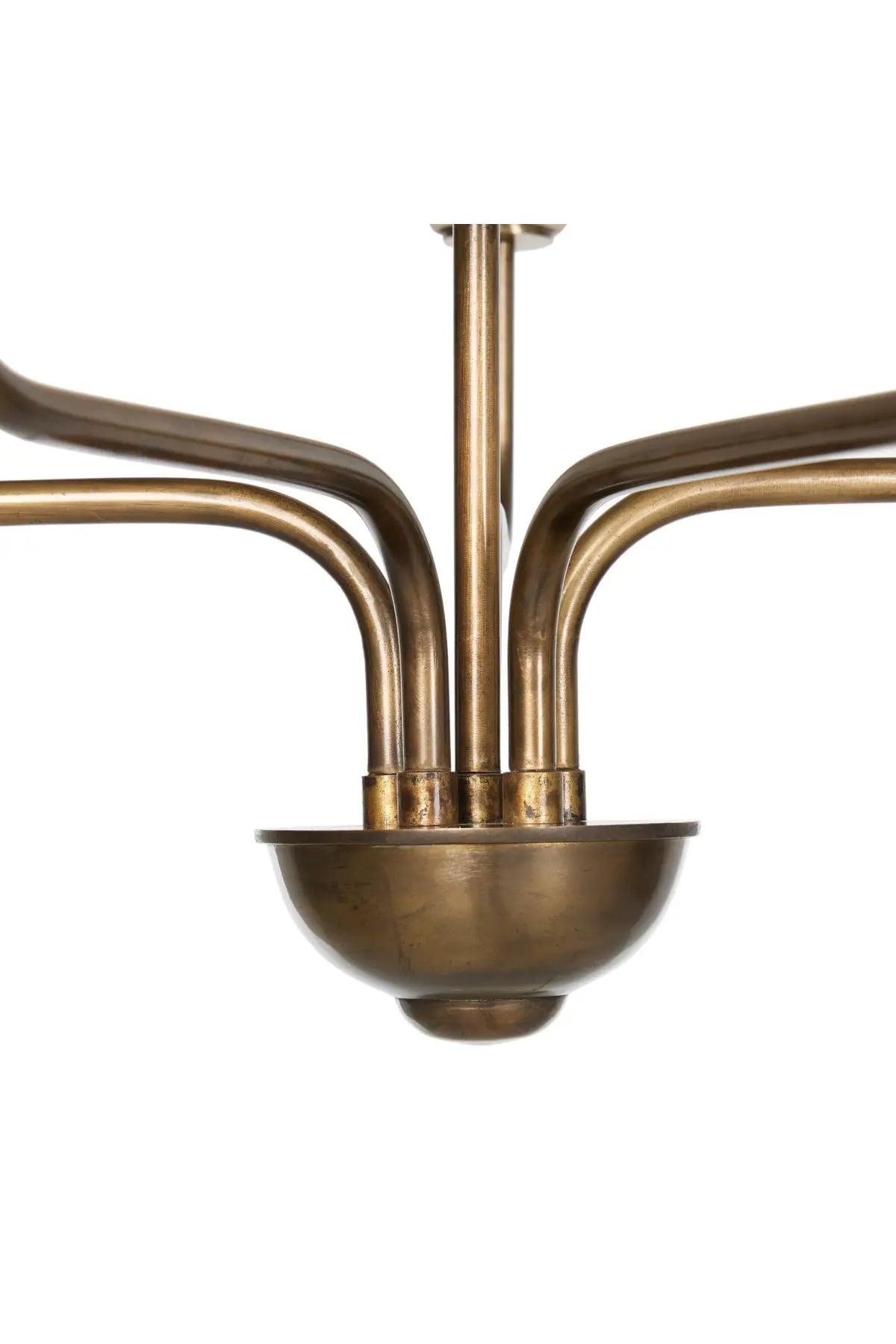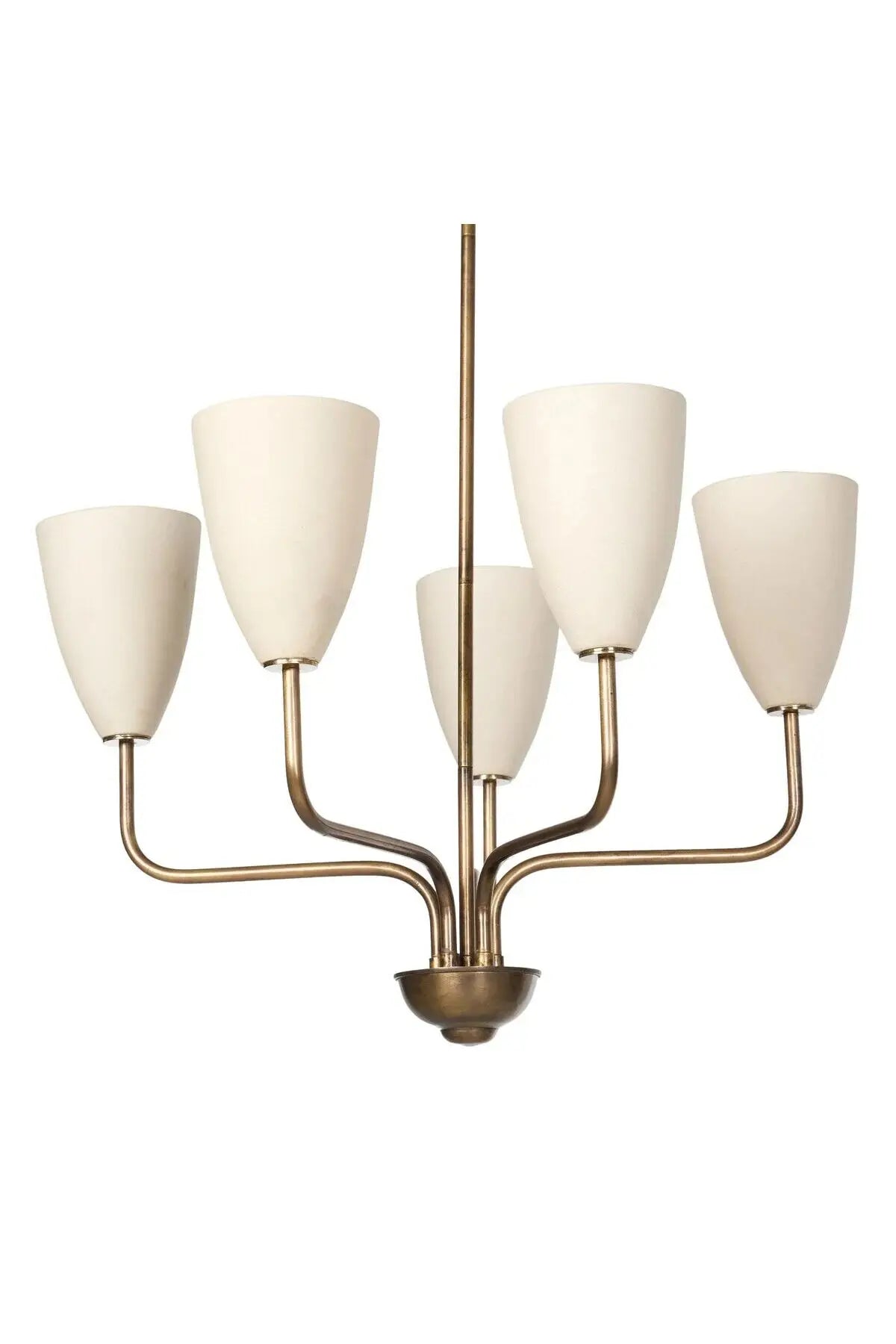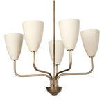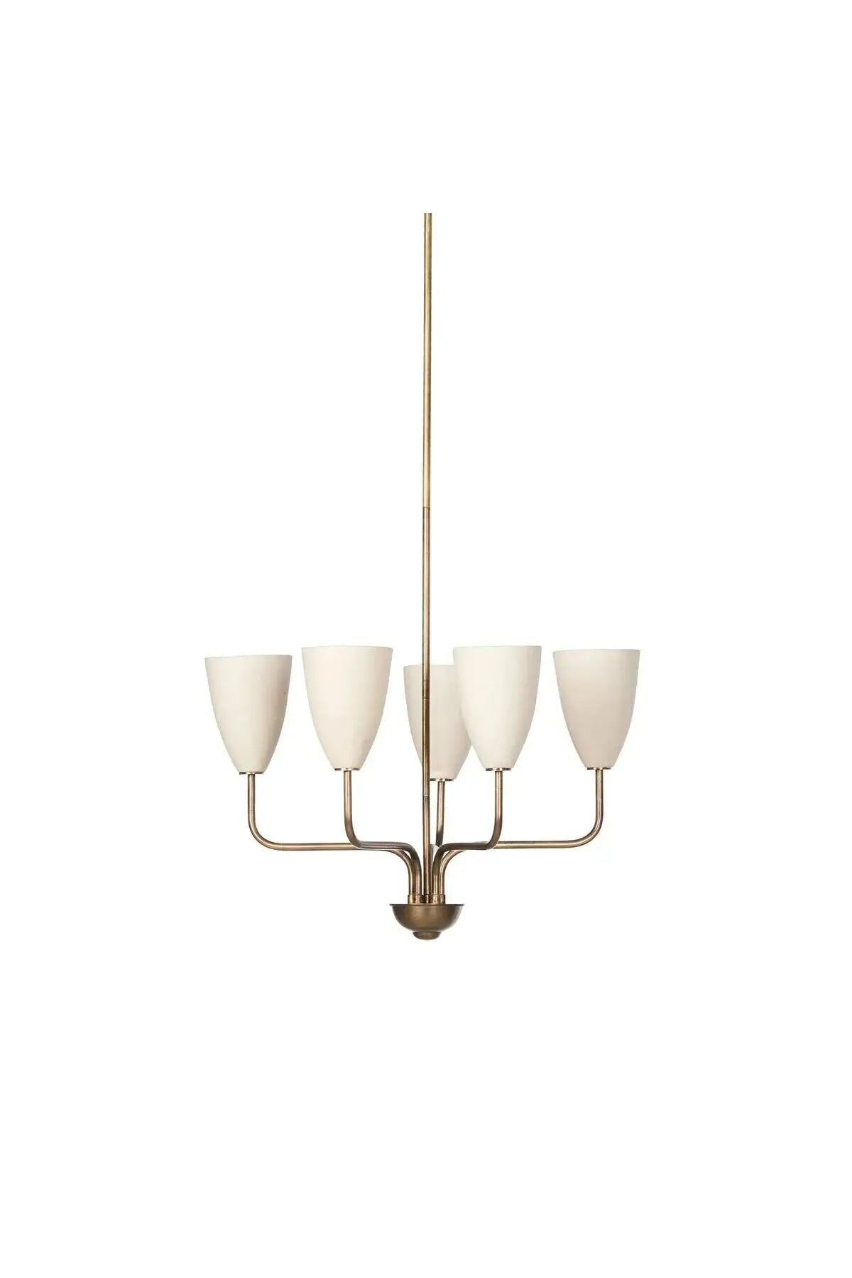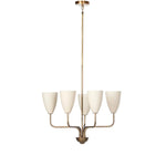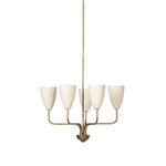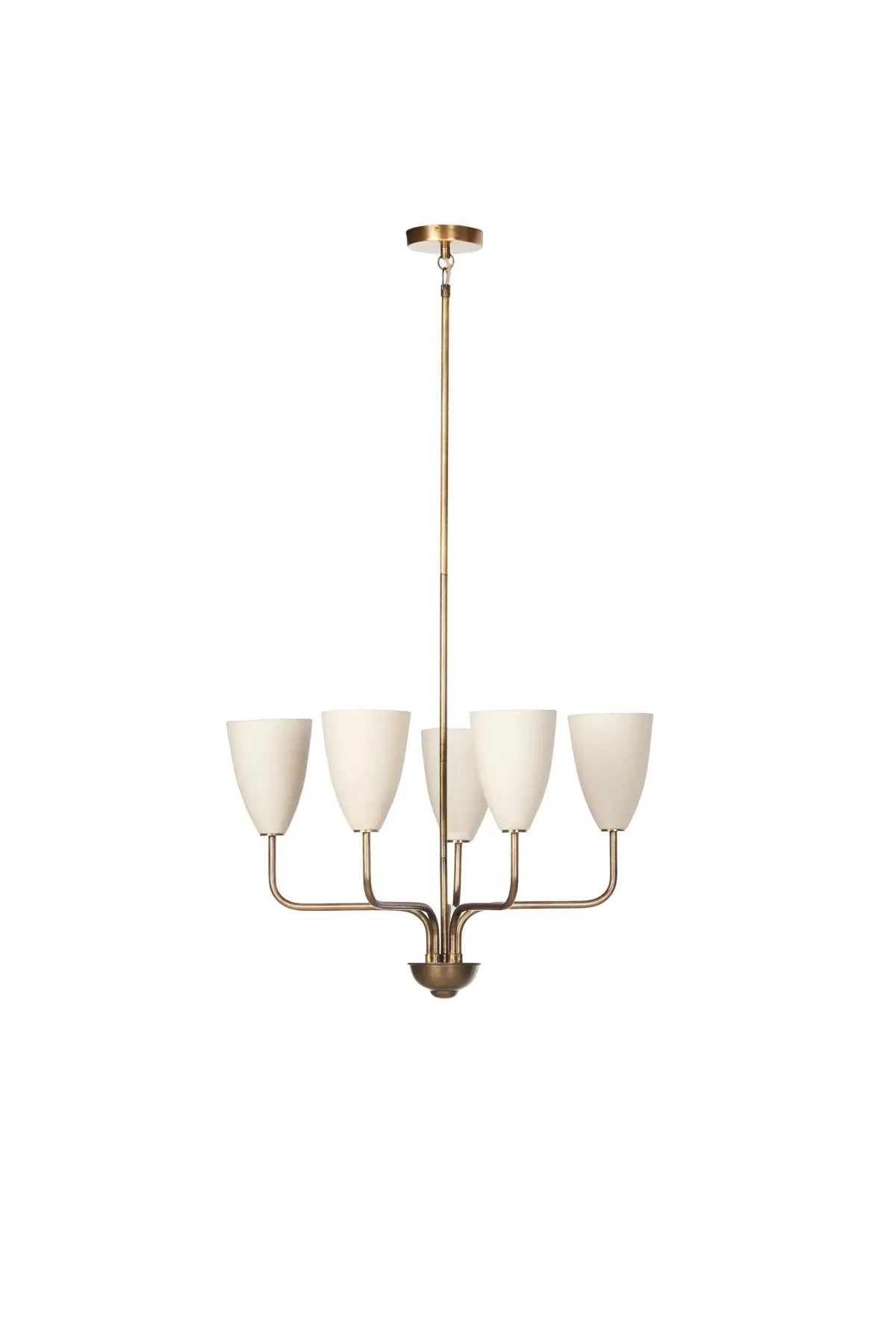 Meet the Jasmine Chandelier. Graceful curves define this chandelier's burnished aged brass arms, joined by a half-circle detail honoring traditional design. Soft tapered shades in speckled cream ceramic add textural interest. Designed to cast a gentle, diffused ambient light, reflecting off ceilings for a warm, inviting glow. Bulb(s) not included.