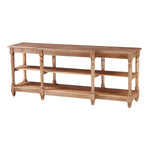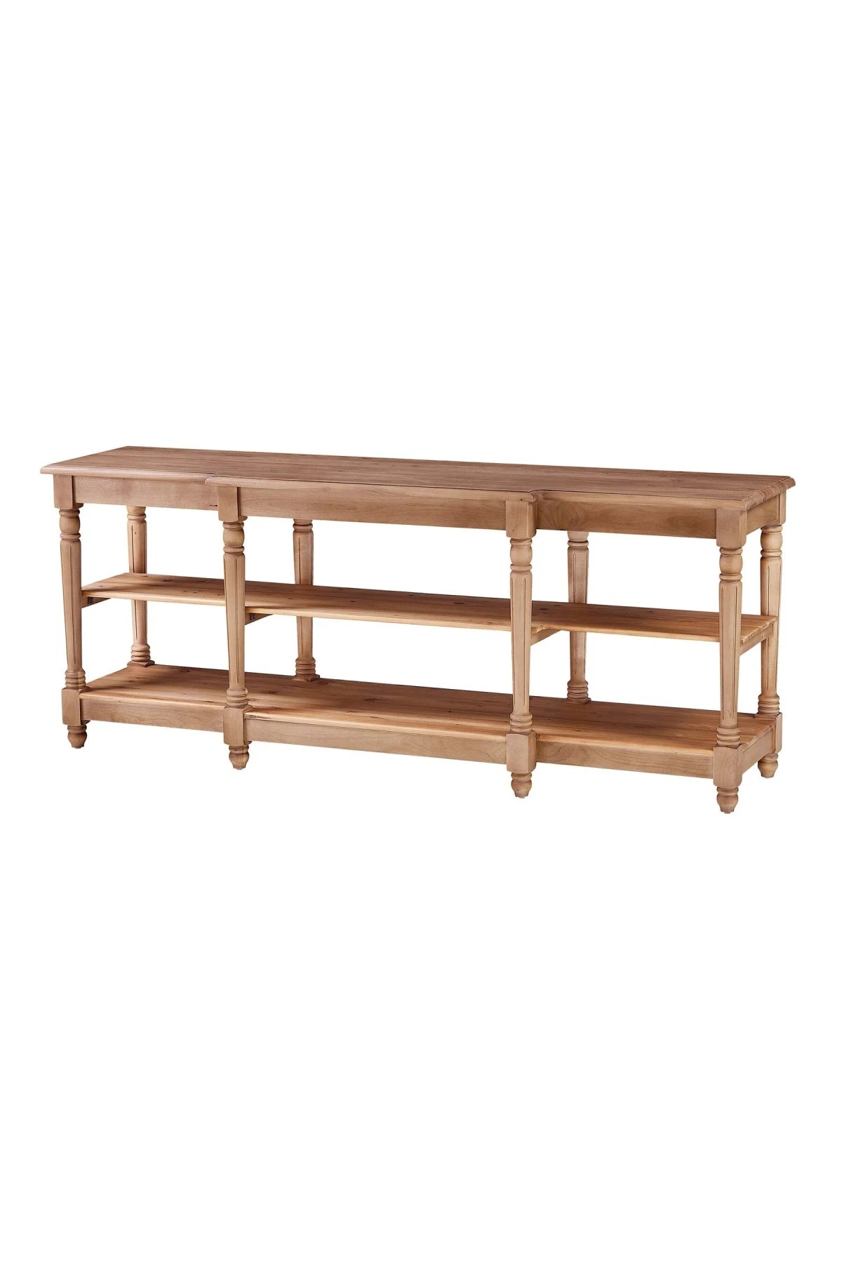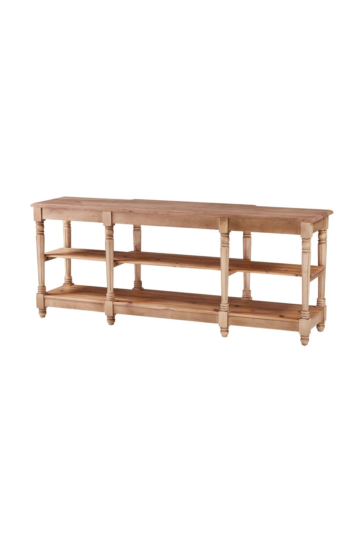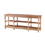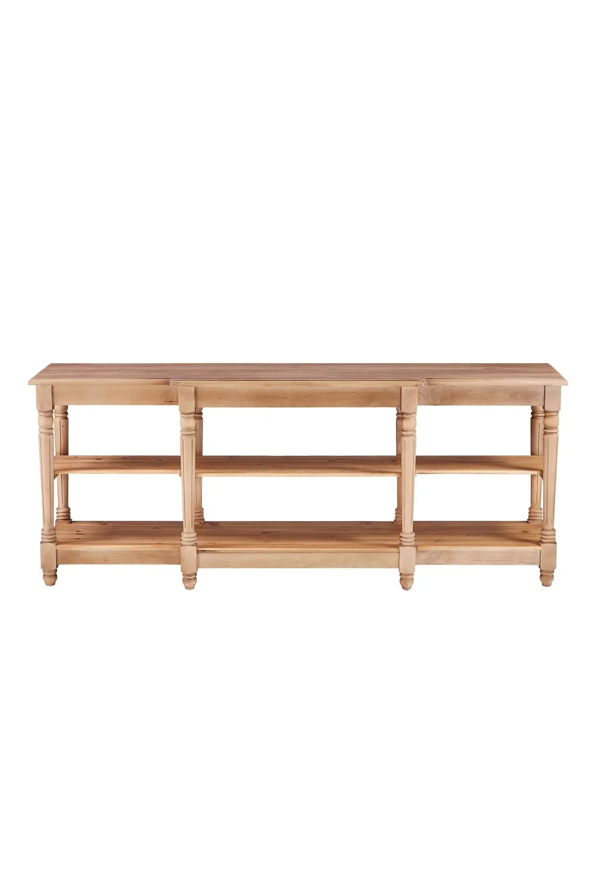 Meet the Archer Console. It showcases a refined blend of reclaimed elm, fir, and birch, highlighting its materials' natural beauty and durability. Its classic farmhouse design features turned legs, gently beveled edges, and a light, natural finish that emphasizes the wood's organic grain. With multiple open shelves, this console offers ample storage and display space, making it both functional and versatile.