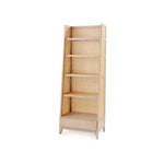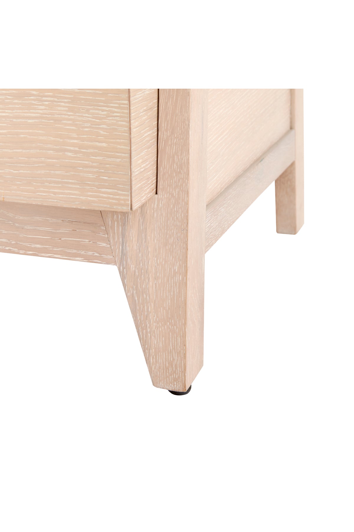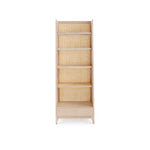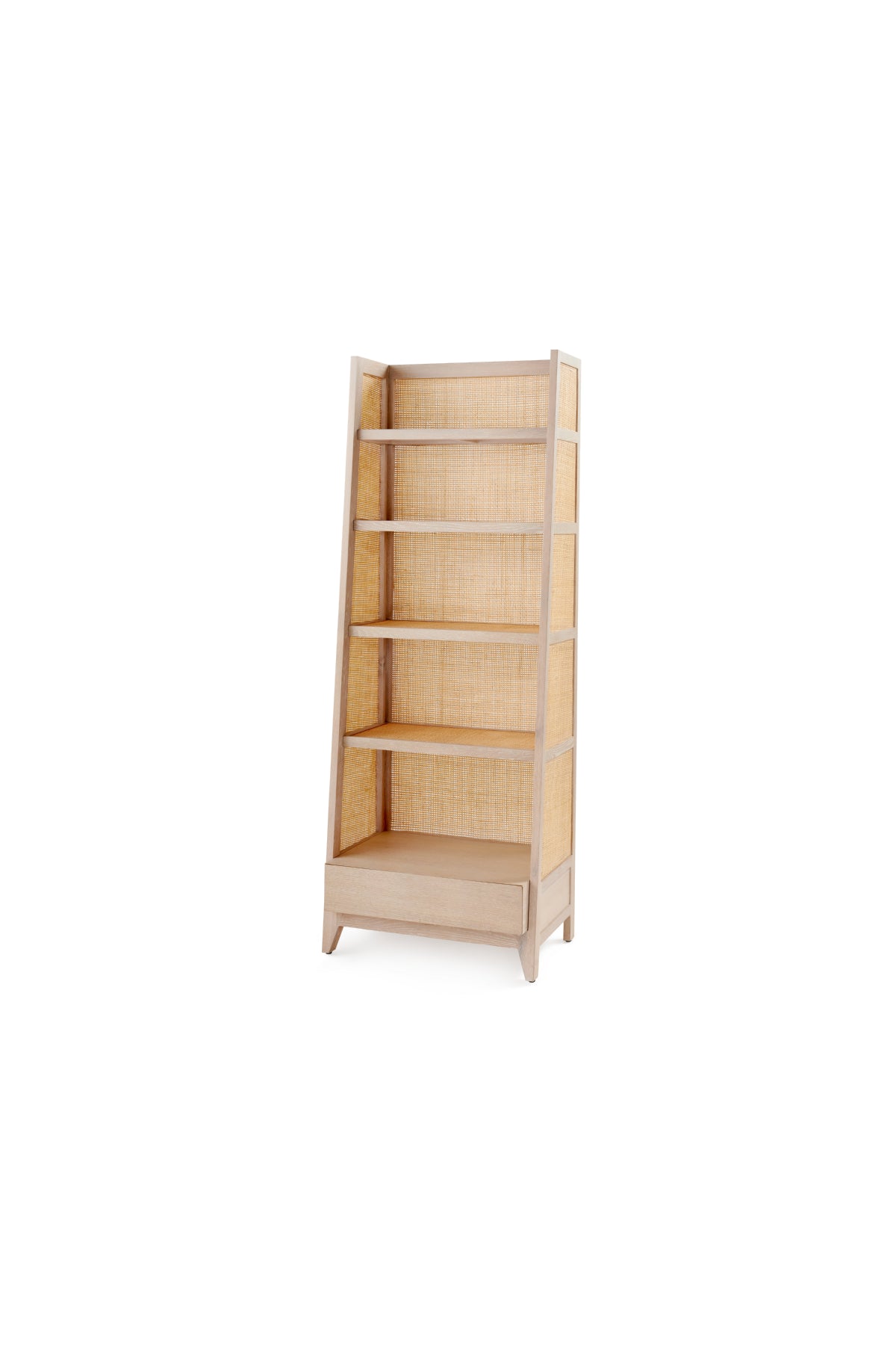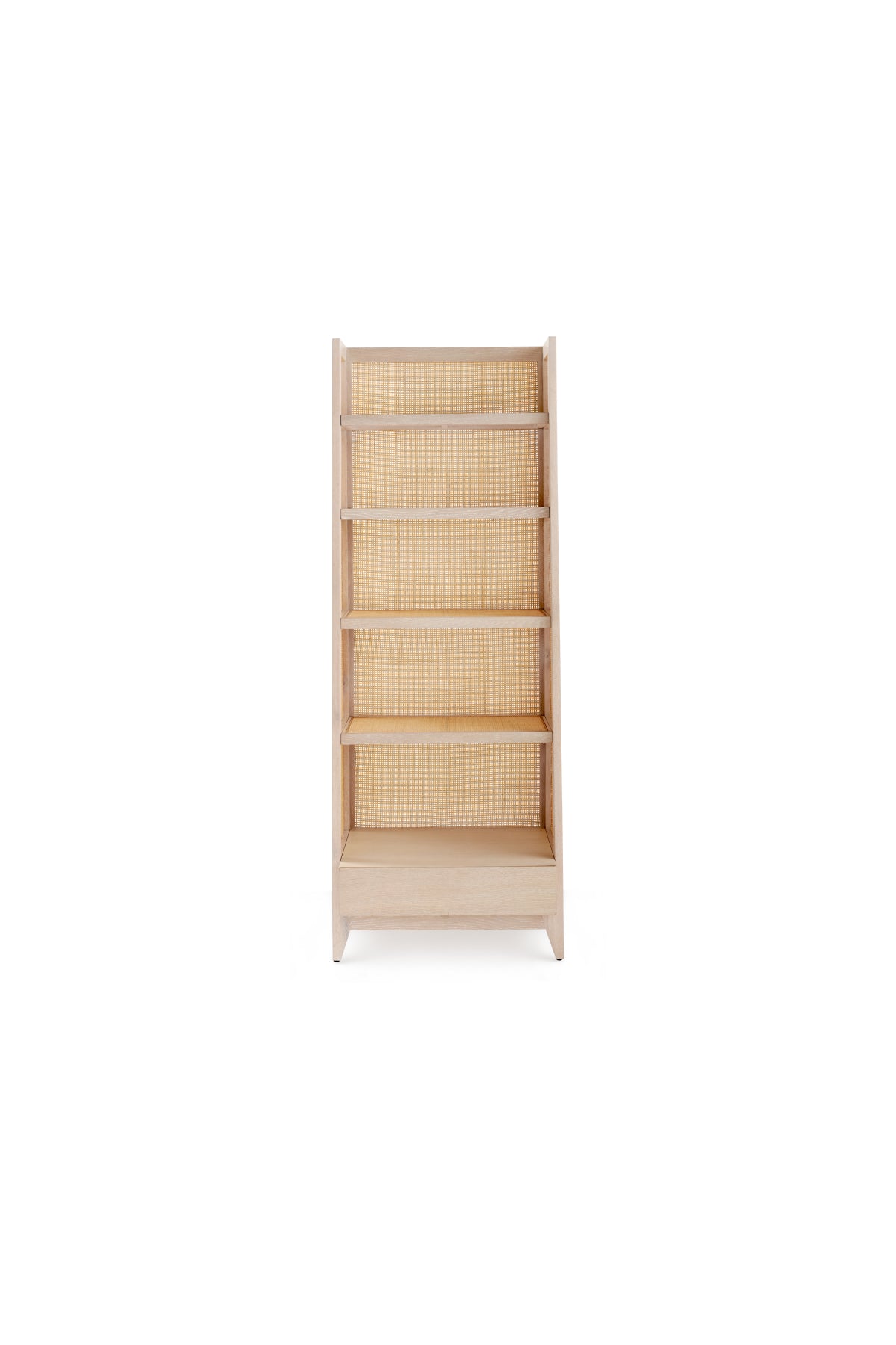 Meet the Evan Etagere. Each piece is comprised of straight grain Bleached Cerused Oak and Bleached Cane Panels. The etagere has four fixed shelves, and one bottom drawer with a veneered interior and soft closing glides. The sides of the unit are slightly angled and tapered.