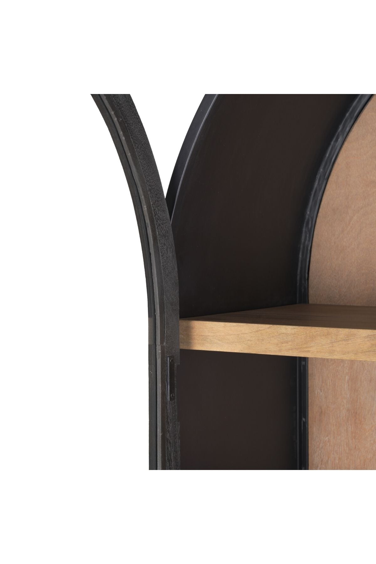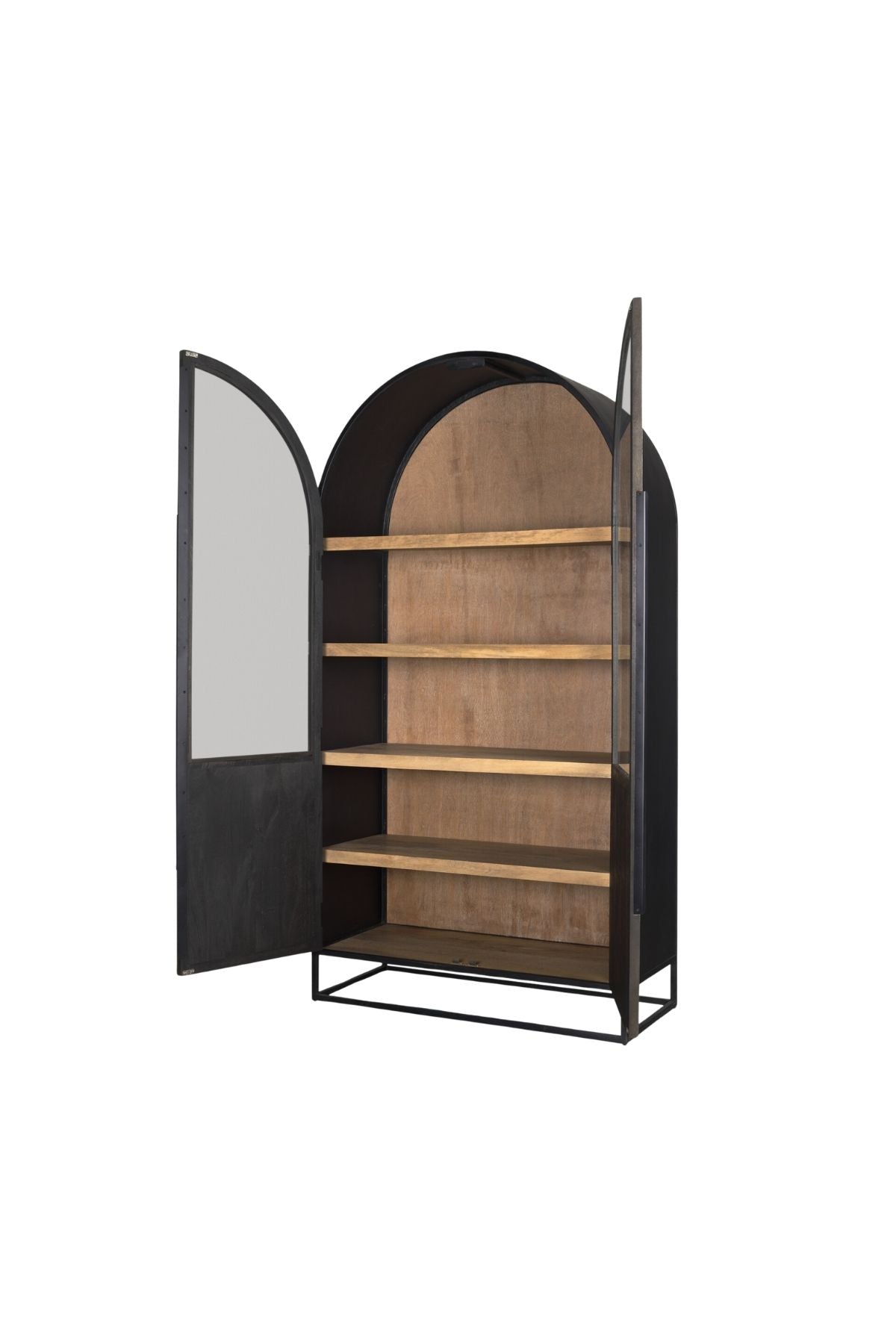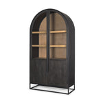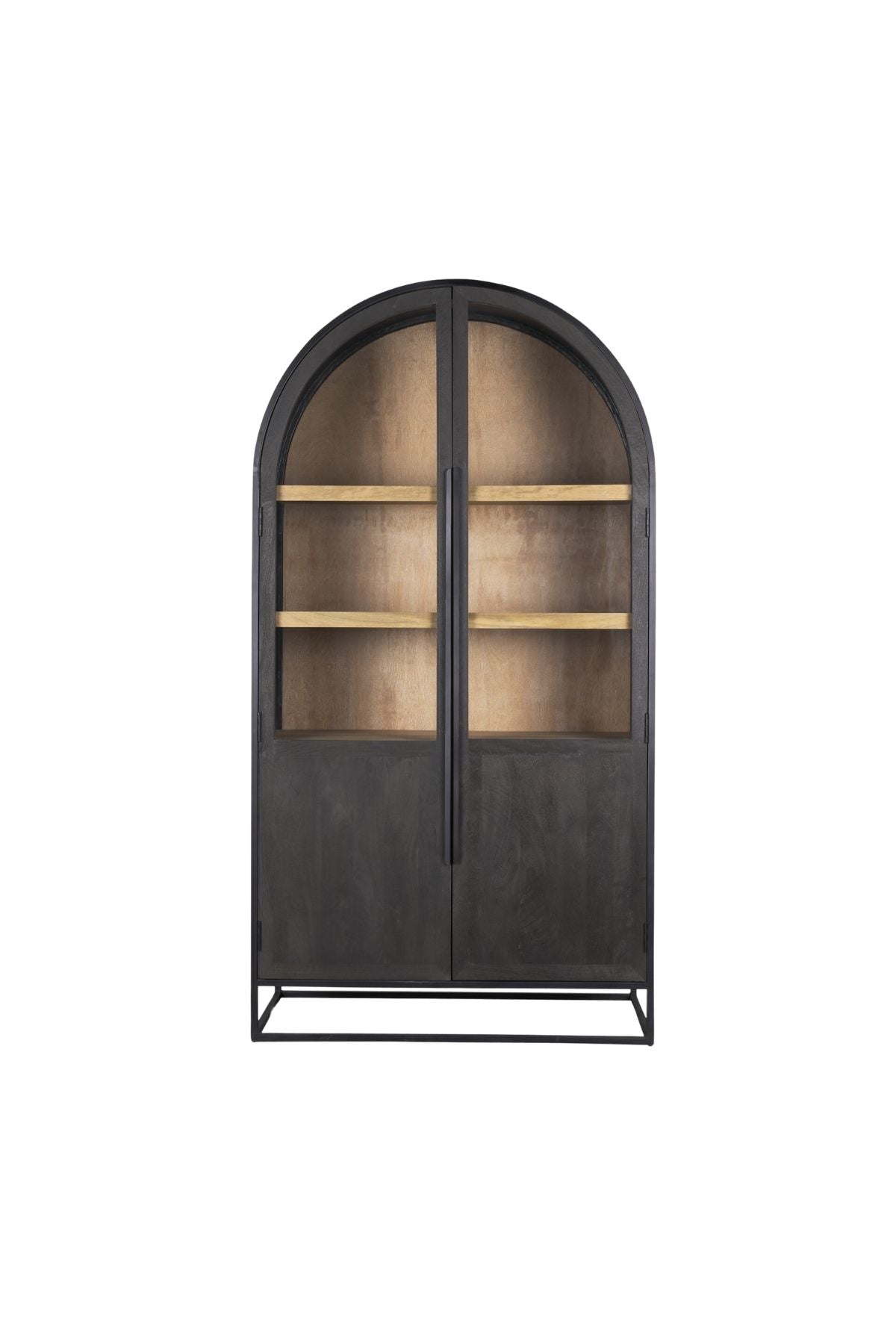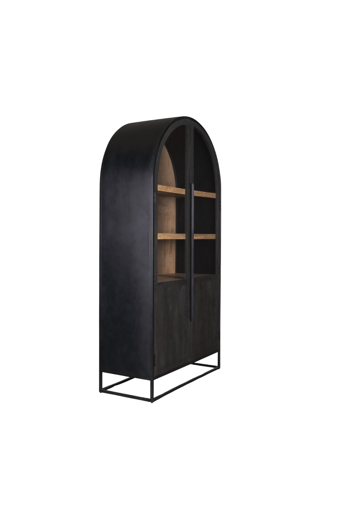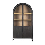 Meet the Sloan Curio Cabinet. This cabinet features a two-toned stunning arched silhouette that is constructed from sturdy black iron, and is fronted by dark, solid mango wood and glass doors.