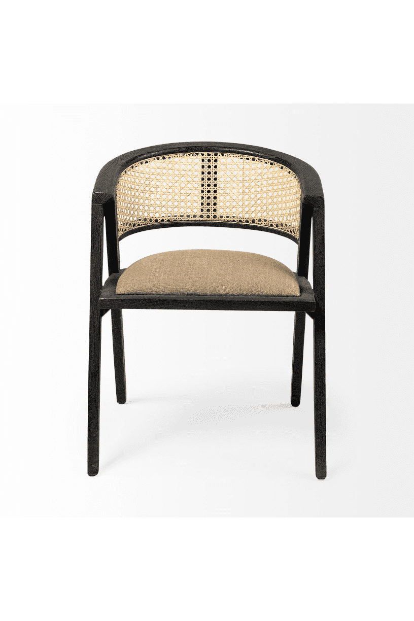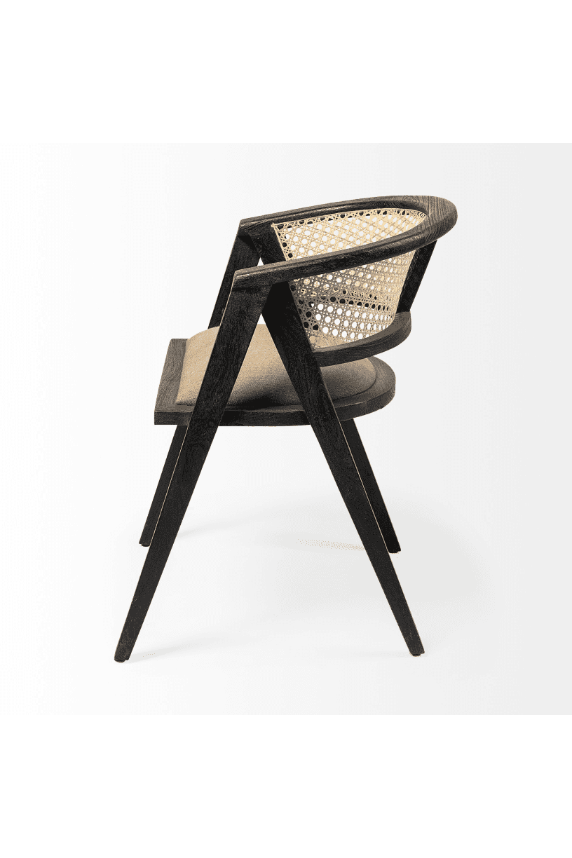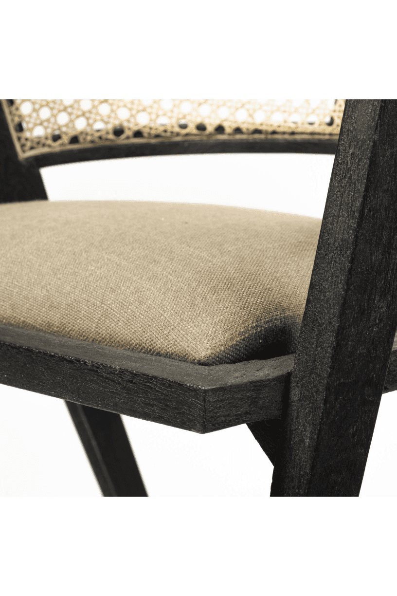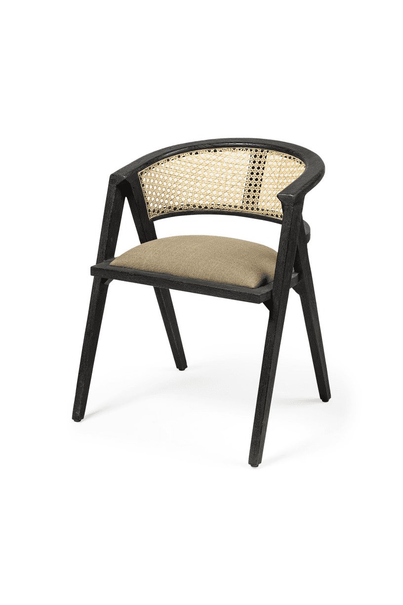 Meet the Tabitha Dining Chair. This stylish dining chair adds a touch of posh to your dining experience. This chair features a sturdy frame with triangular legs, crafted from Indian mango wood and finished in a black tone. It dons a curved cane back and has a padded, linen-wrapped seat to ensure unparalleled comfort.