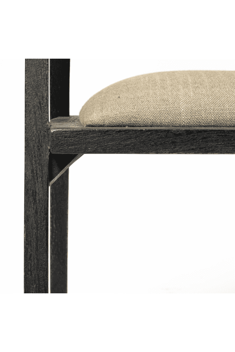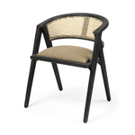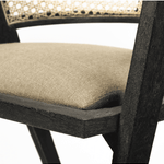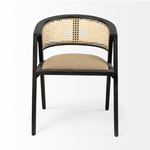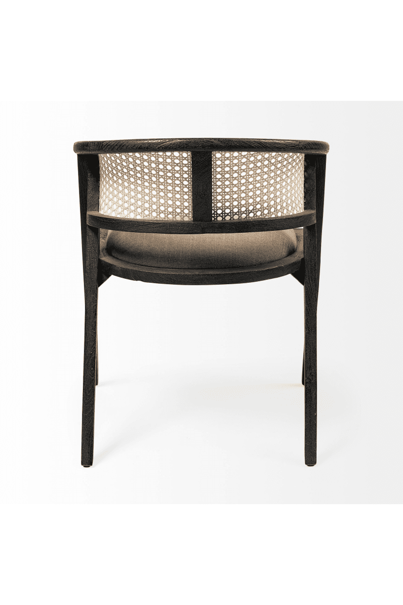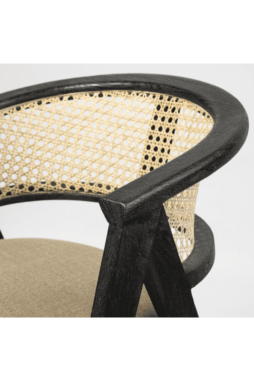 Meet the Tabitha Dining Chair. This stylish dining chair adds a touch of posh to your dining experience. This chair features a sturdy frame with triangular legs, crafted from Indian mango wood and finished in a black tone. It dons a curved cane back and has a padded, linen-wrapped seat to ensure unparalleled comfort.