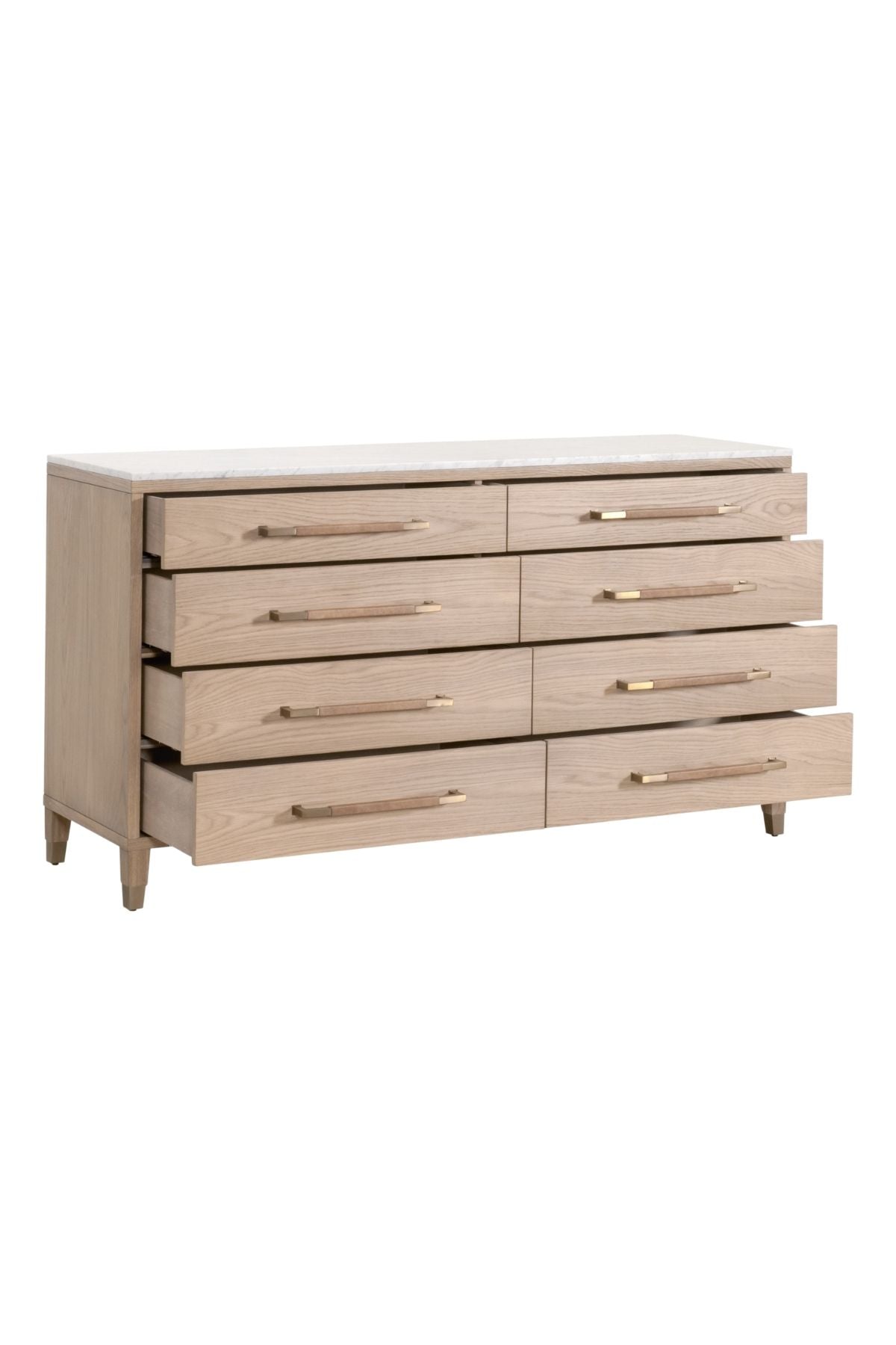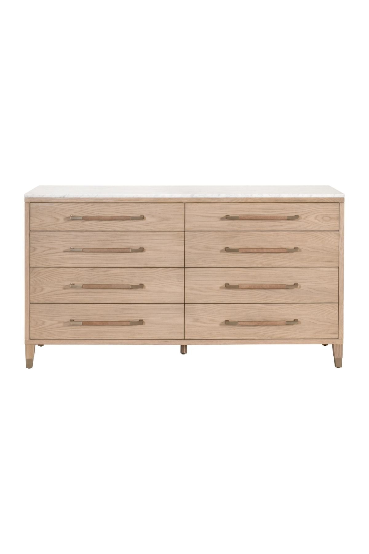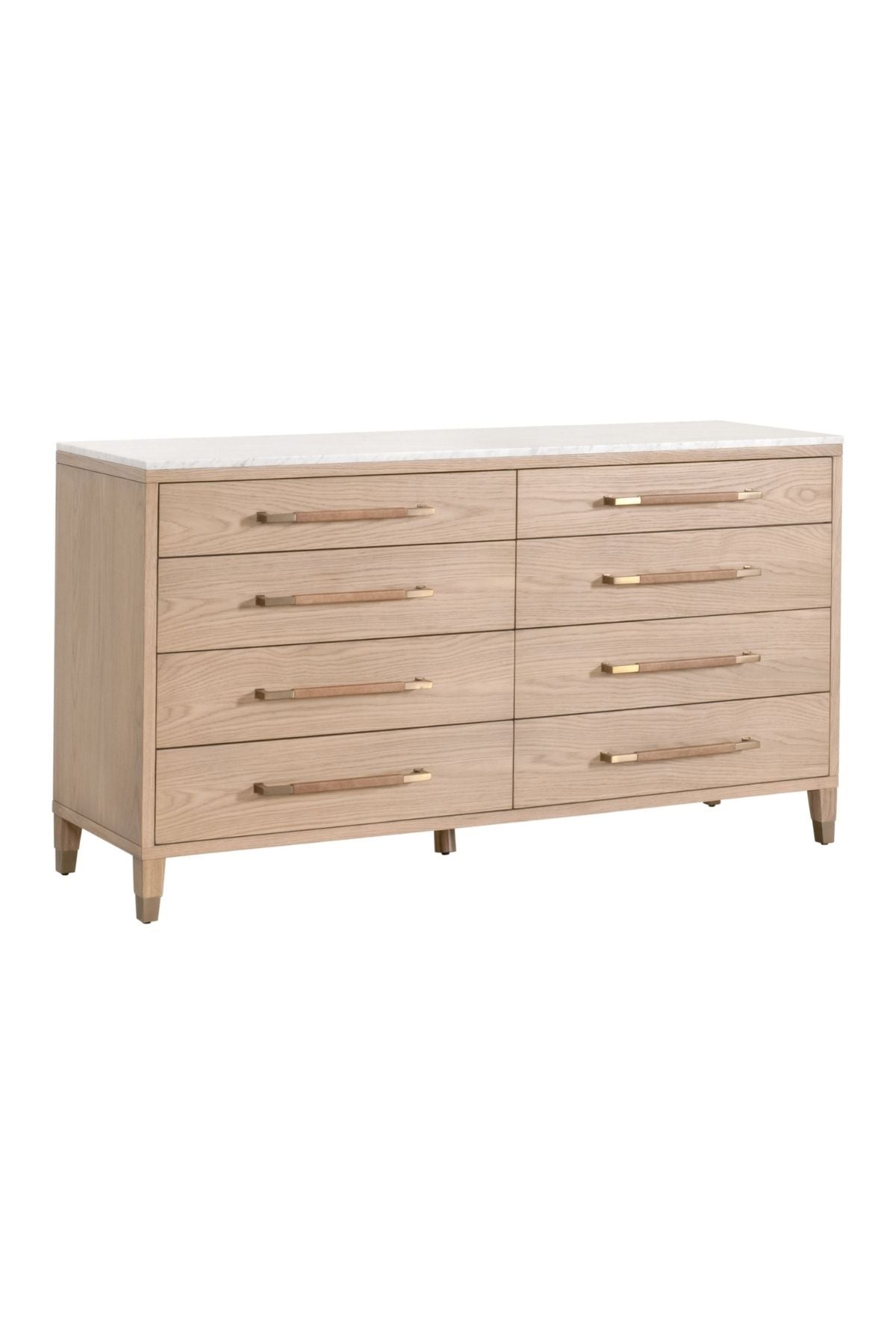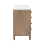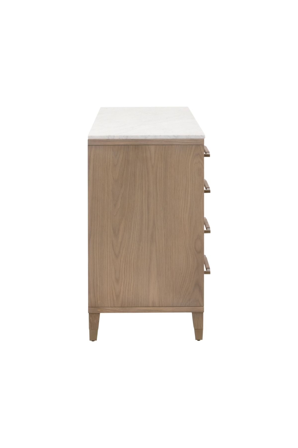 Discover the epitome of sophistication with the Cambria Dresser. Crafted with an exquisite blend of solid oak wood, oak veneer, and Bianco marble, this piece seamlessly bridges traditional and contemporary styles. The natural oak frame exudes warmth, while the white and gray marble top adds light tones and a classy look.