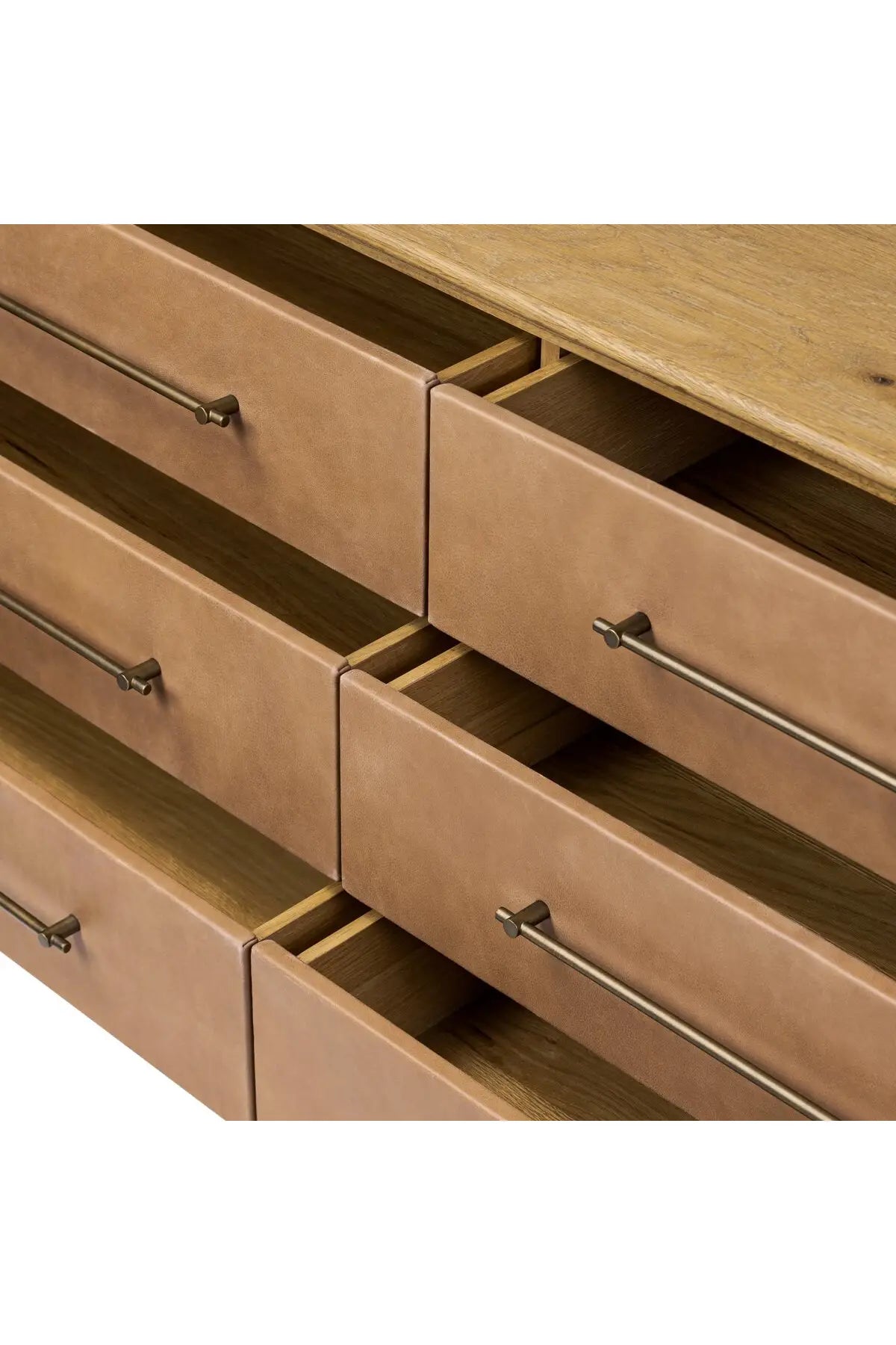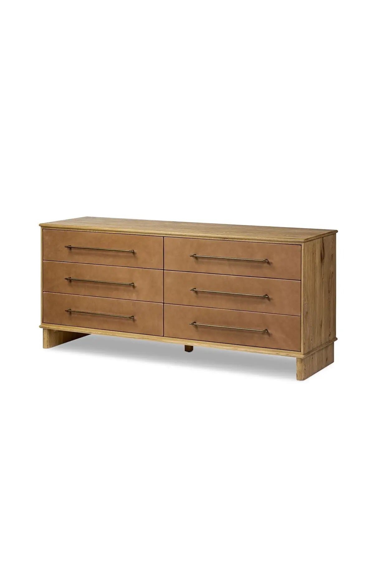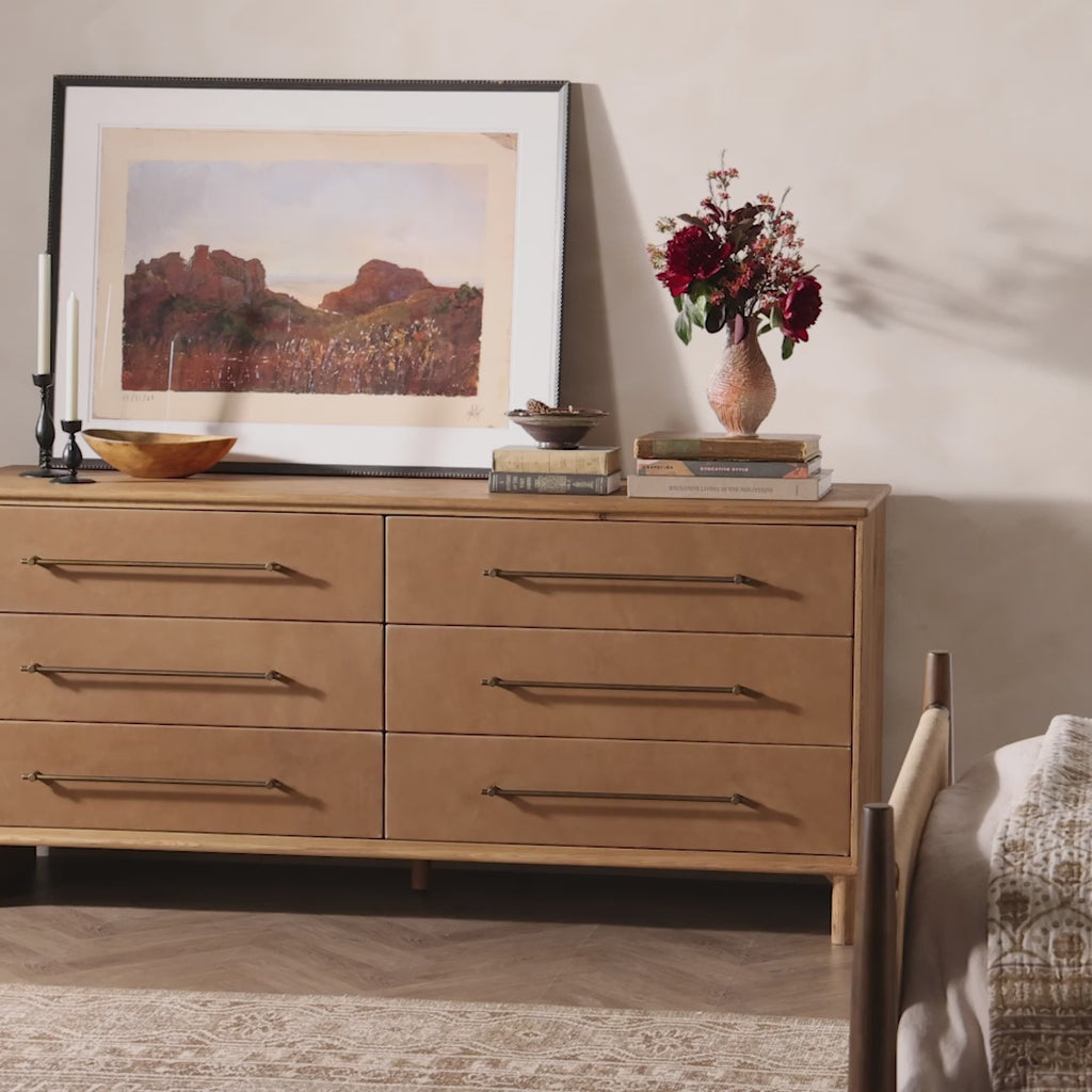 Meet the Stella 6 Drawer Dresser. Bring a Nordic, material-driven look to your bedroom with a six-drawer dresser of grain-rich oak and drawer fronts covered with tan top-grain leather. Finished out with long, linear iron hardware.