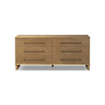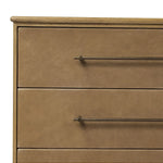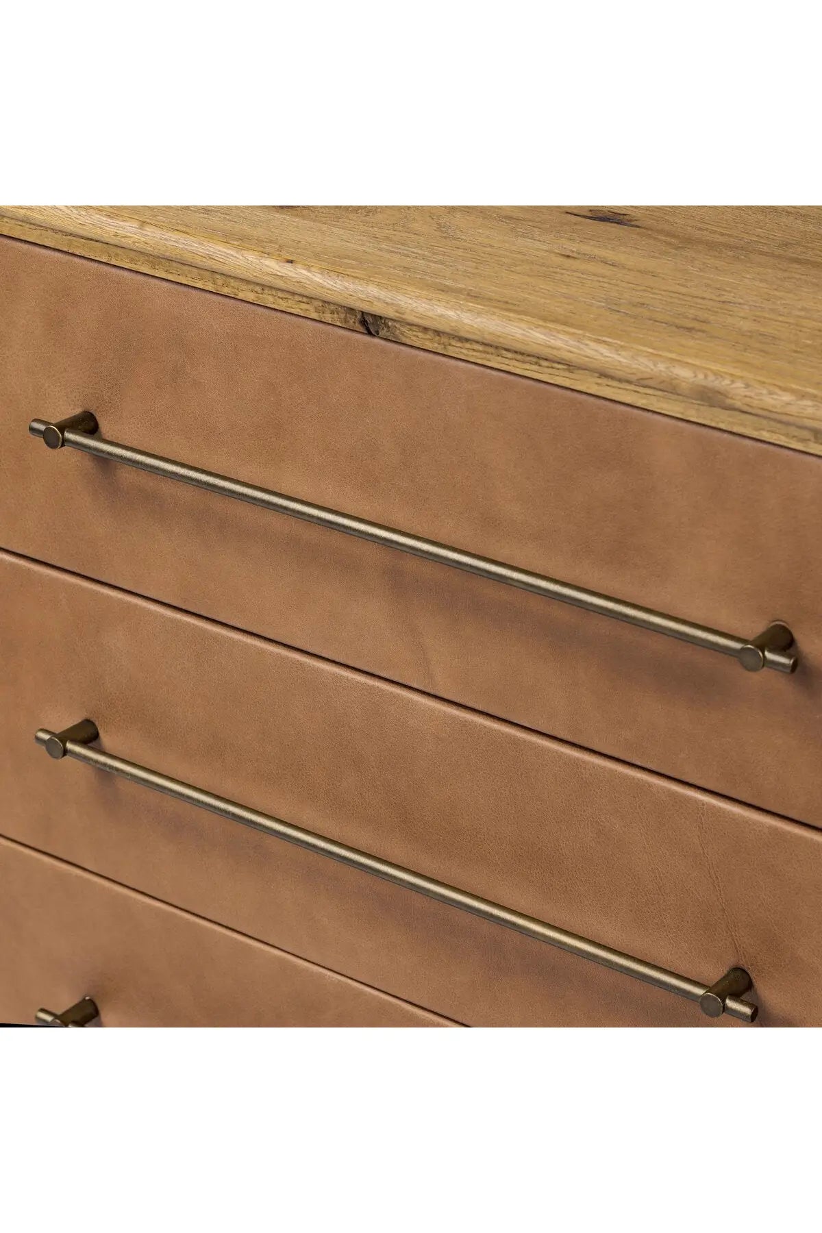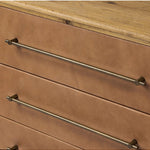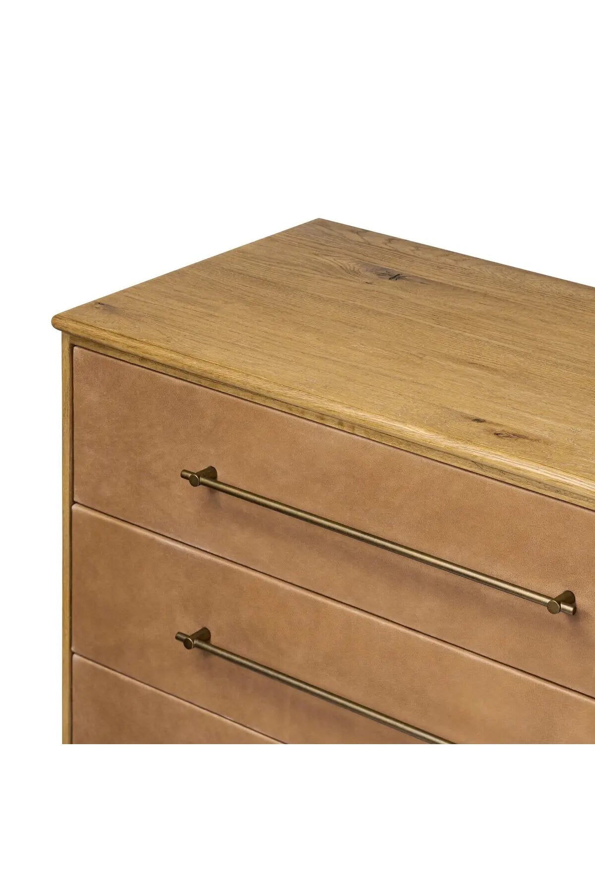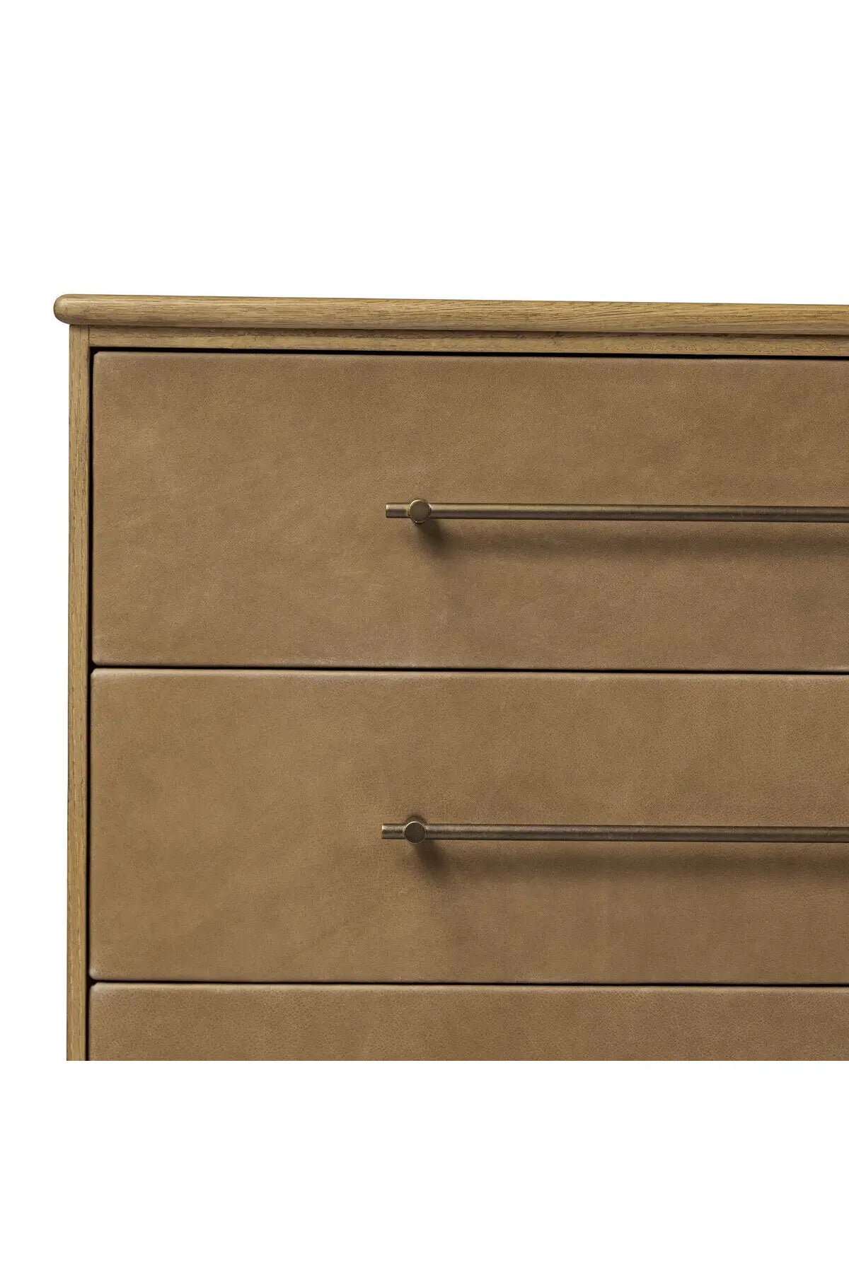 Meet the Stella 6 Drawer Dresser. Bring a Nordic, material-driven look to your bedroom with a six-drawer dresser of grain-rich oak and drawer fronts covered with tan top-grain leather. Finished out with long, linear iron hardware.