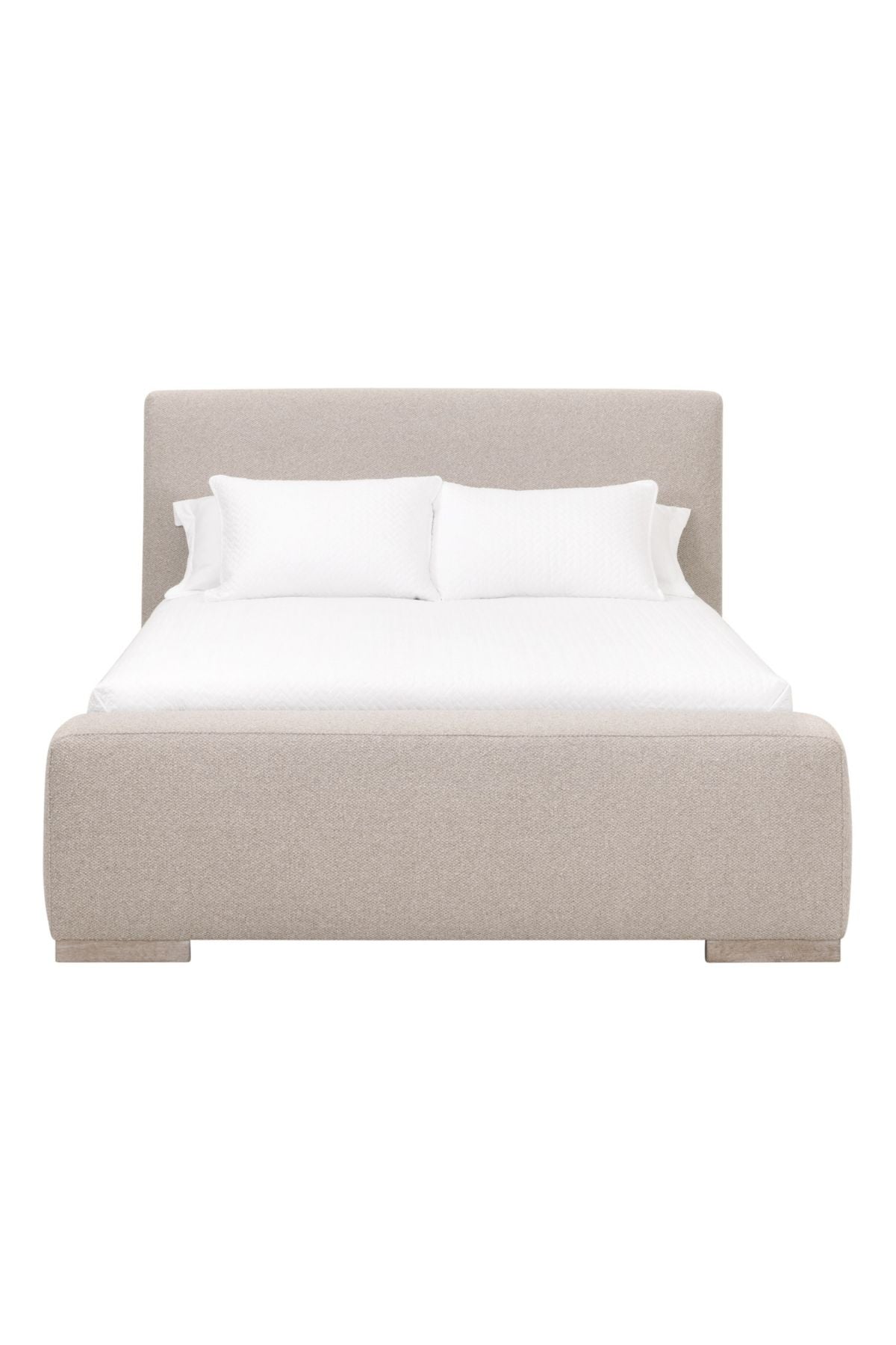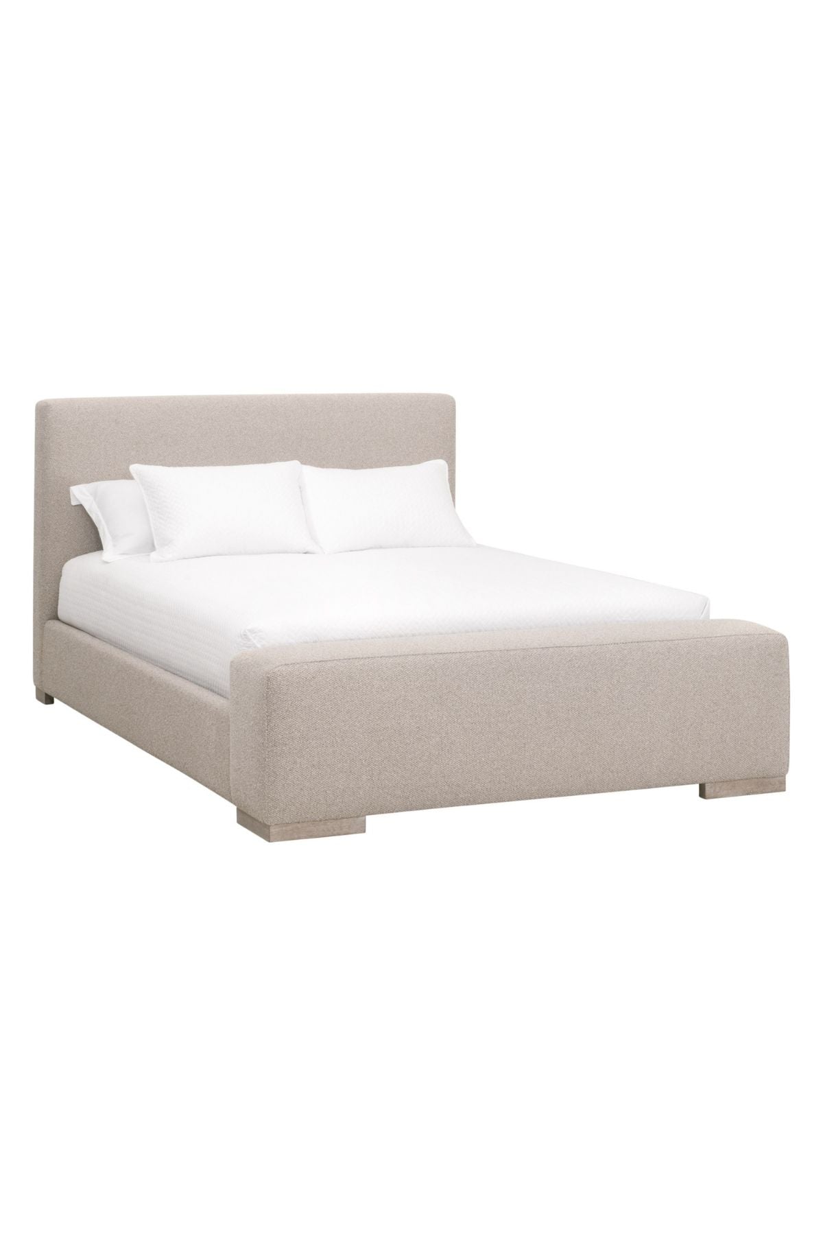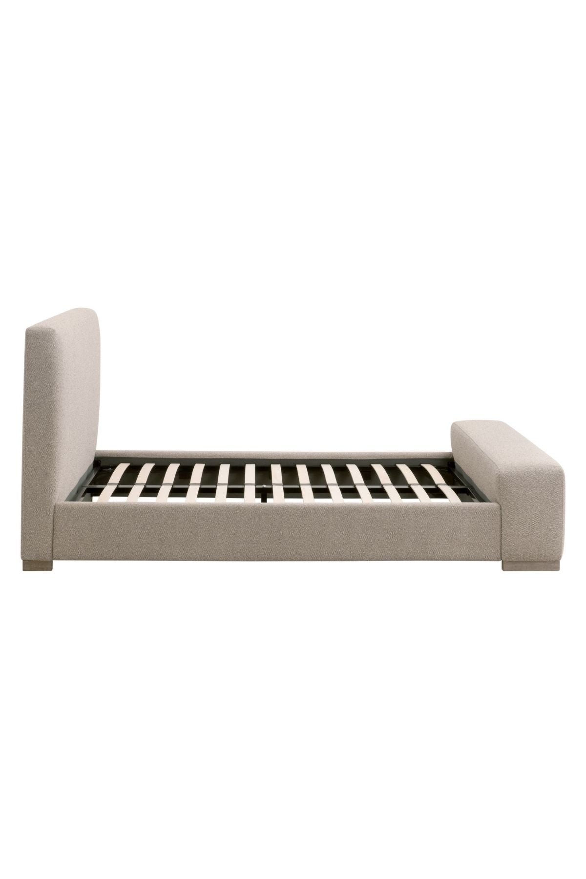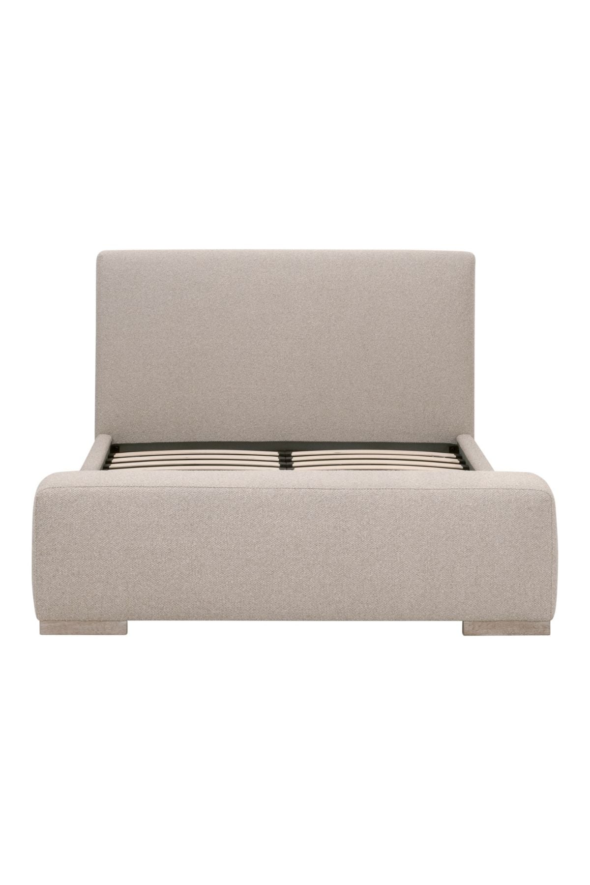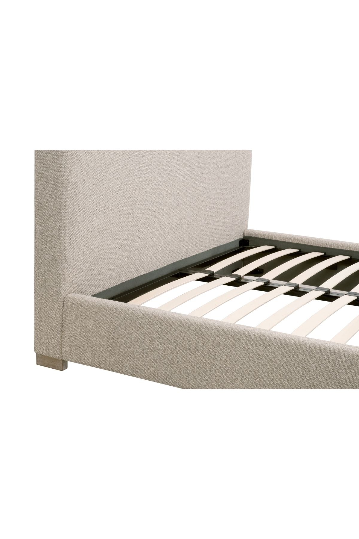 The Warren Bed exudes modern elegance with its clean lines and fully upholstered frame in a soft, natural gray fabric. Its low-profile design is complemented by a plush, padded headboard, offering both style and comfort. Slats included.