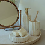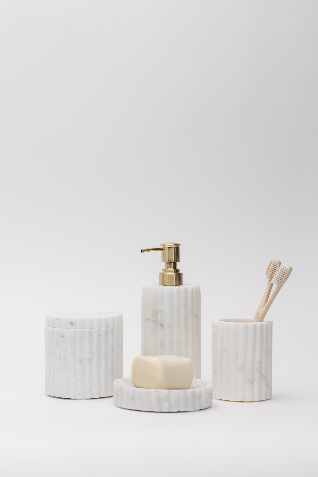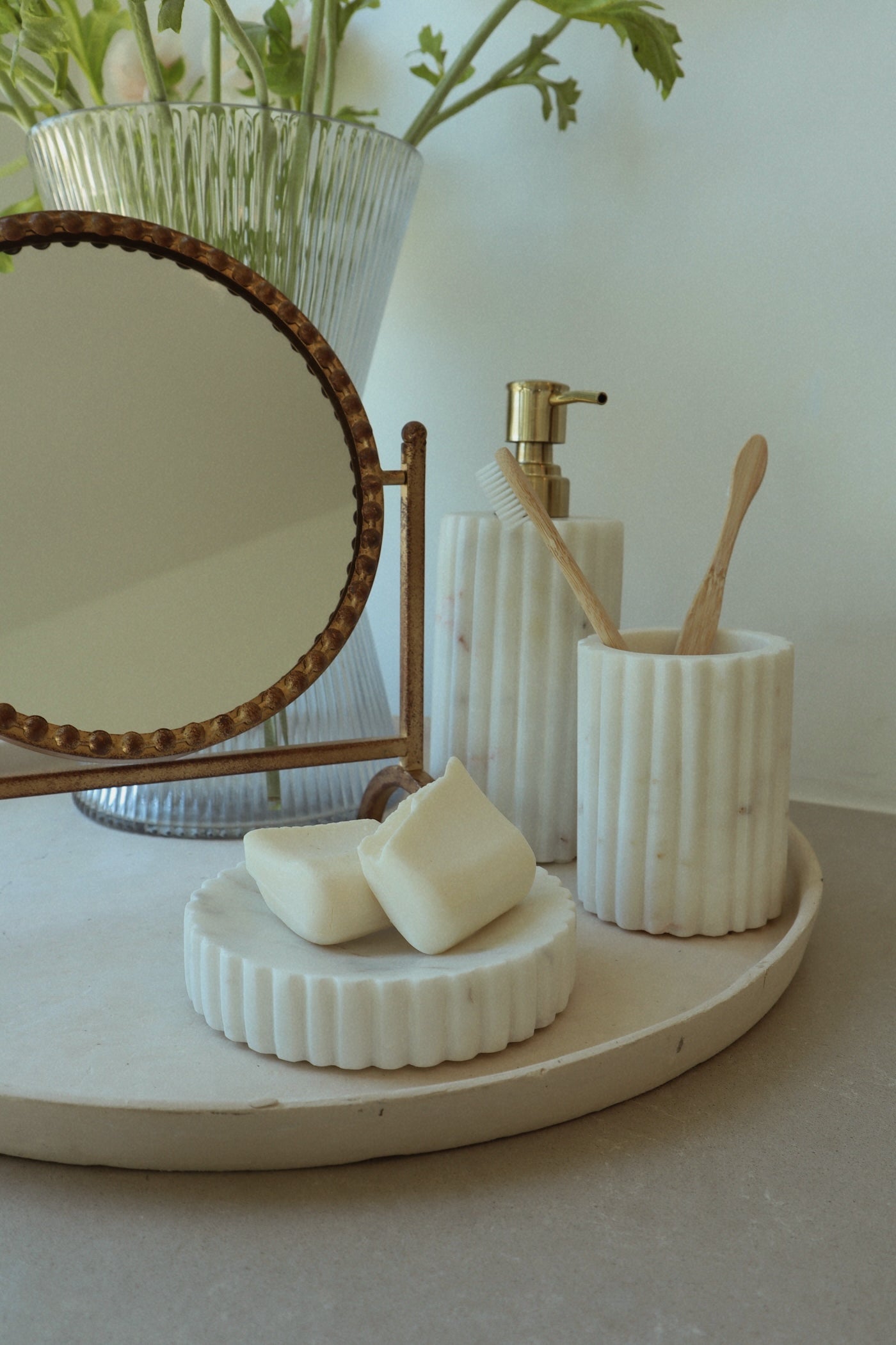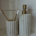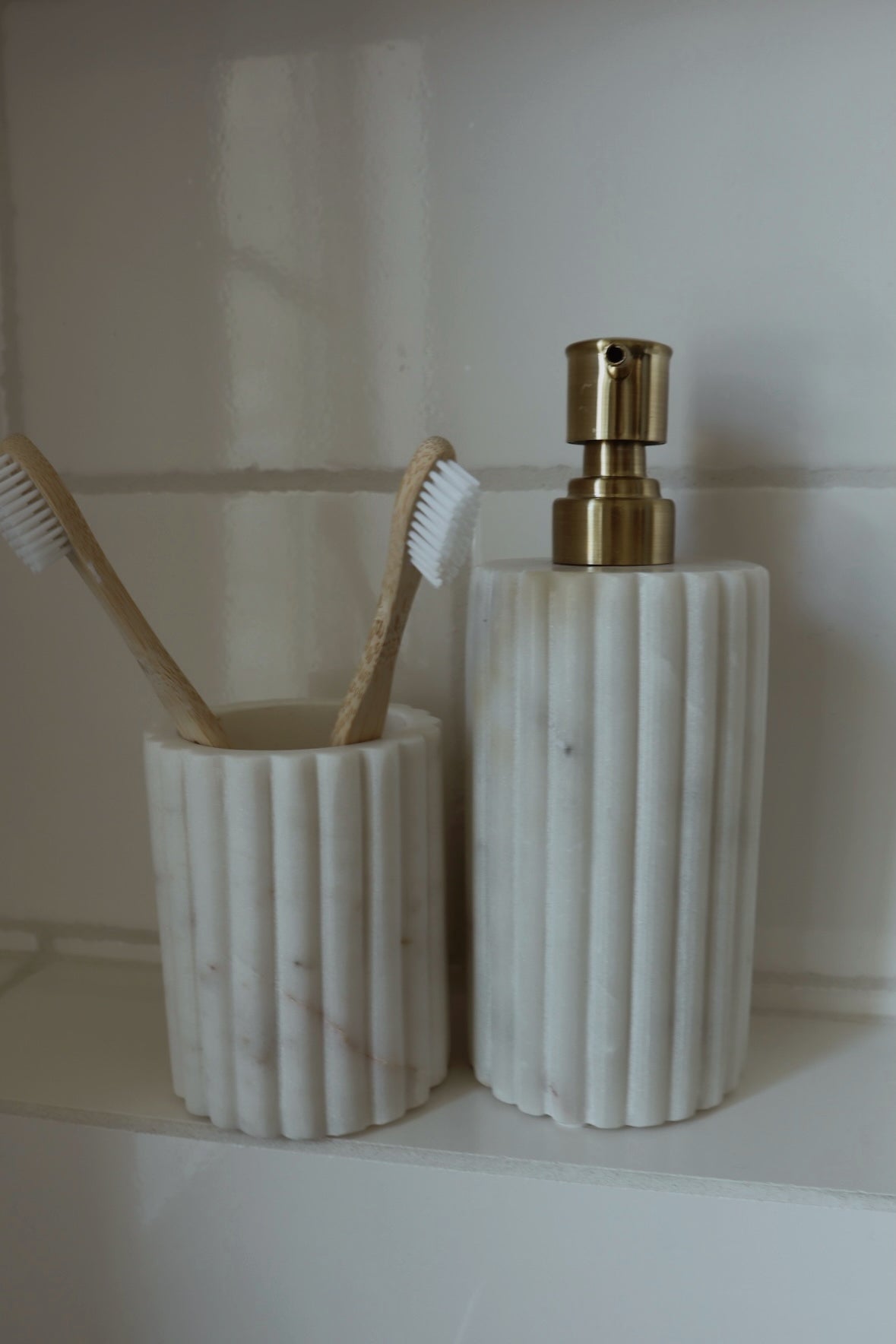 Charming scallop edge detail and timeless sleek white marble - we just can't get enough of the Blossom Scallop Pump! Perfect for use in a bathroom or kitchen and adds the perfect touch of luxe to your space. We love styling these as a set but they look just as great on their own!