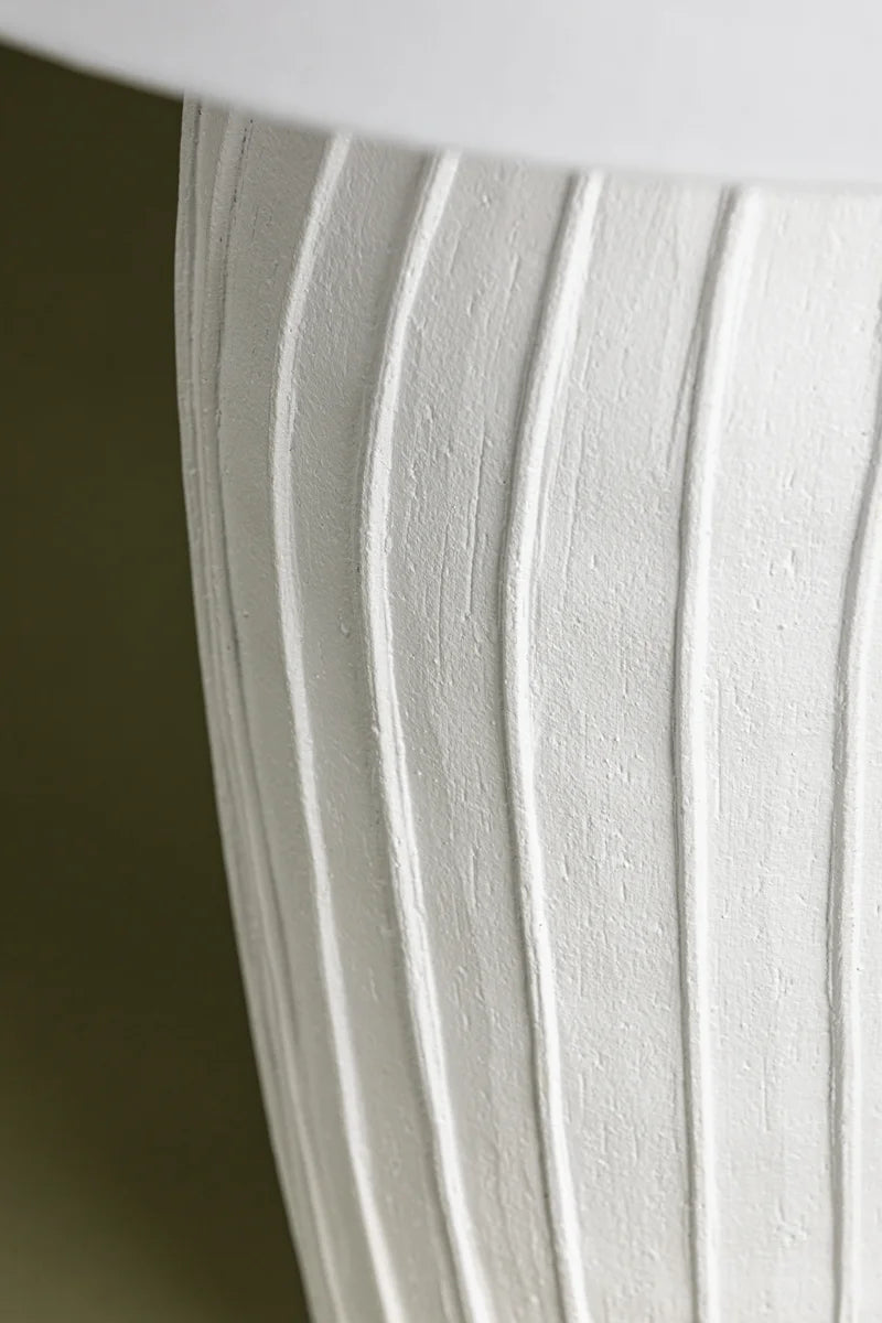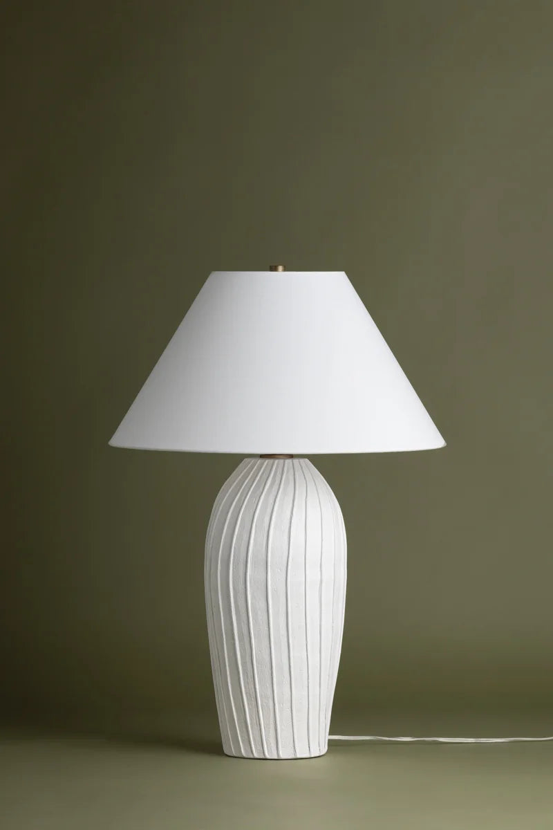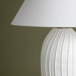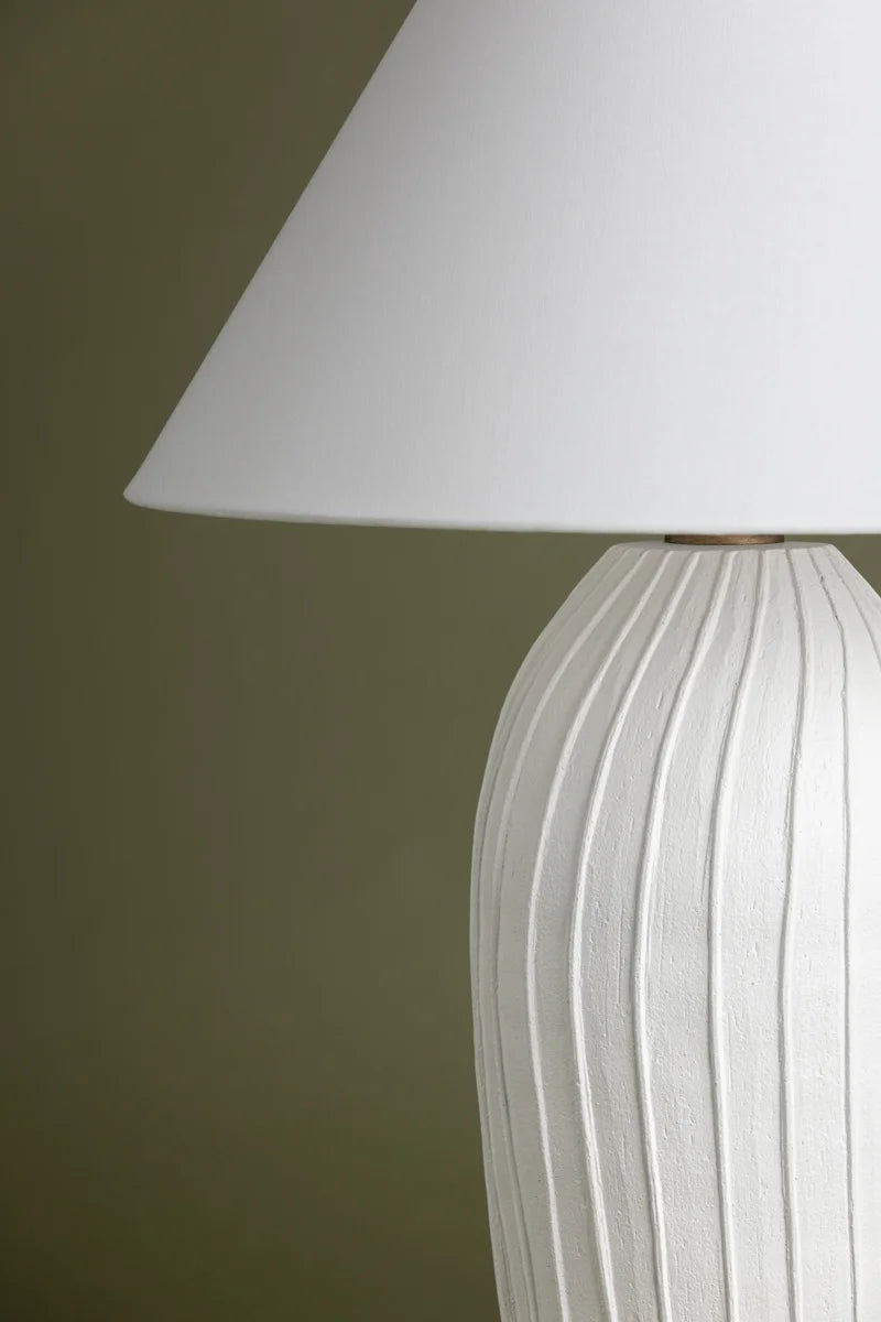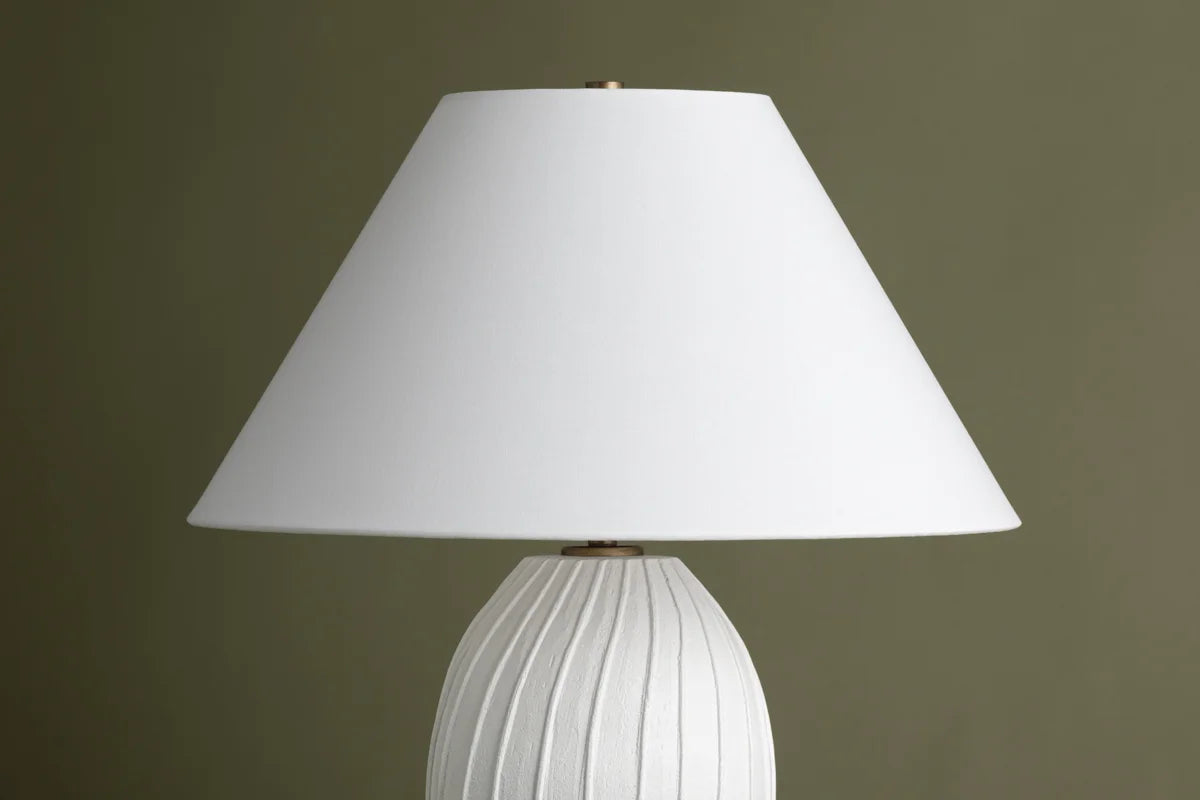 Meet the Deacon Lamp. Pleat-like folds ripple down the hand-sculpted deacon, lending this ceramic table lamp its artisanal charm. The base's chalky white finish is complemented by a crisp natural linen shade, adding to the minimalist appearance. Place Deacon Lamp on a table, desk, or bedside for artistic yet approachable illumination. Bulb(s) not included.