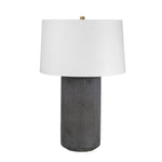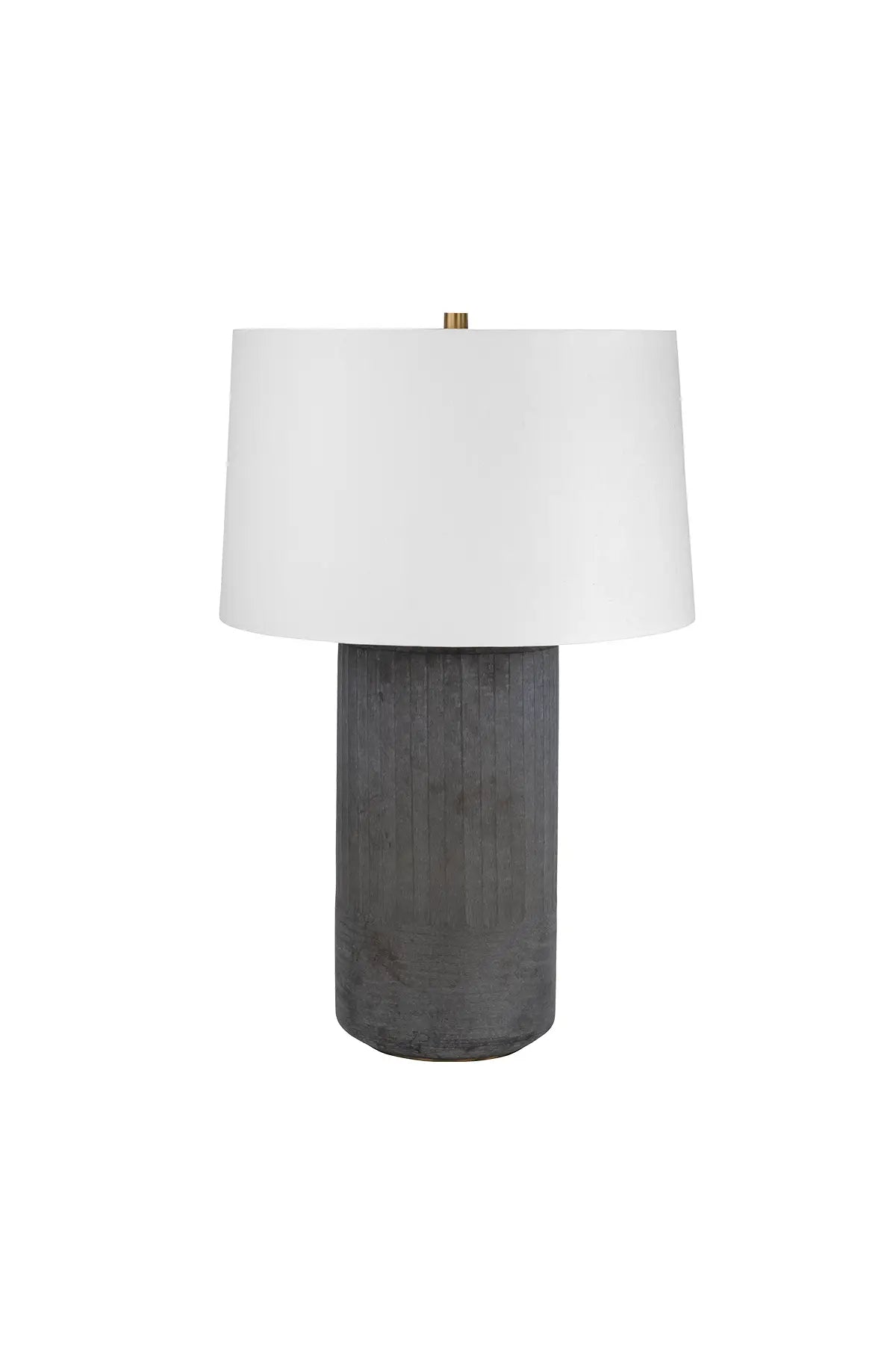 The minimalist silhouette of the Greyson Table Lamp is elevated through the use of traditional Indian cut glass techniques. The cylindrical glass base features a dark, moody palette with intricate faceting that adds subtle texture. Topped with a large white linen shade, this sophisticated staple is designed to subtly enhance any room. Bulb(s) not included. Due to the one-of-a-kind nature of the medium, exact colors and patterns may vary slightly from the image shown.
