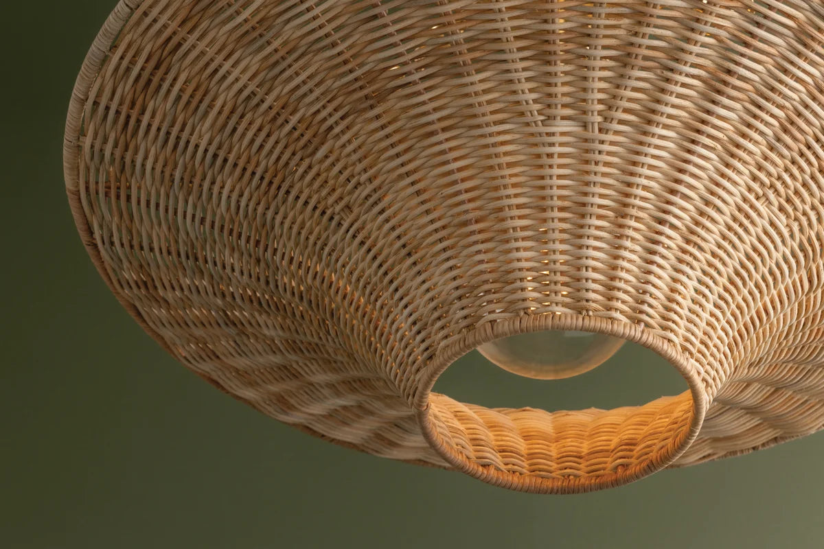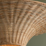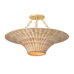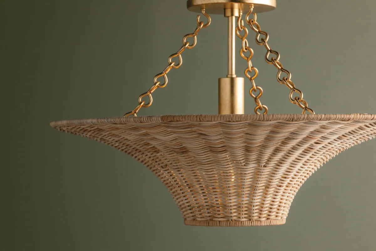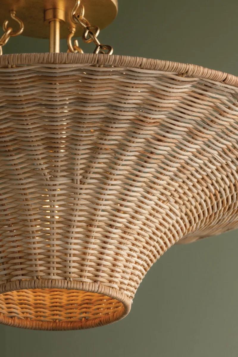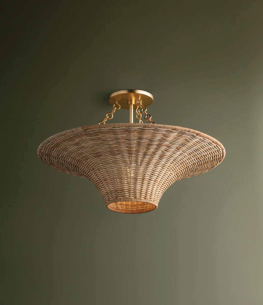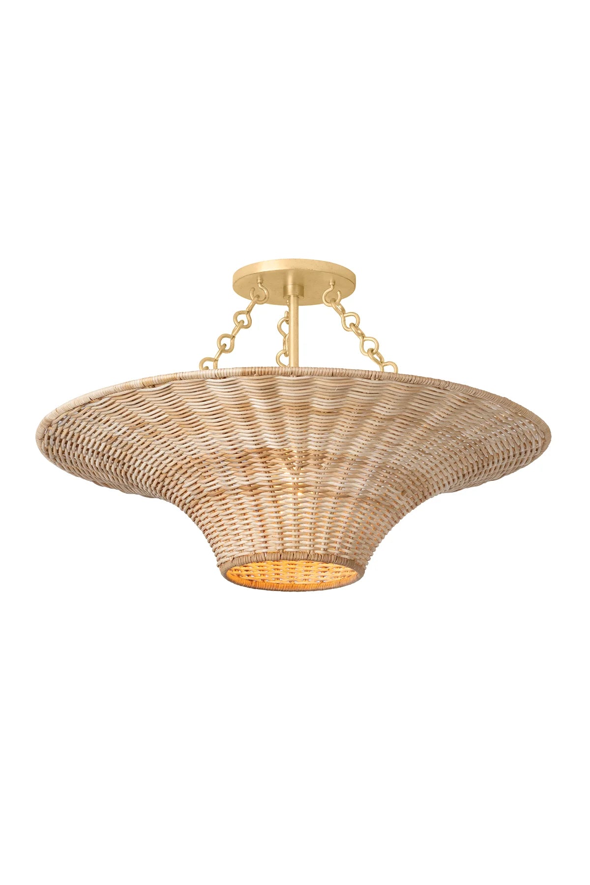 Meet the Ketan Semi Flush Mount. Hand-woven from natural wicker, the inverted trumpet shape of this semi-flush emits both up and downlighting, with the exposed bulb casting a powerful beam. Completing the fixture's fresh appearance is a simple chain and canopy cast in Vintage Gold Leaf. Bulb(s) not included.