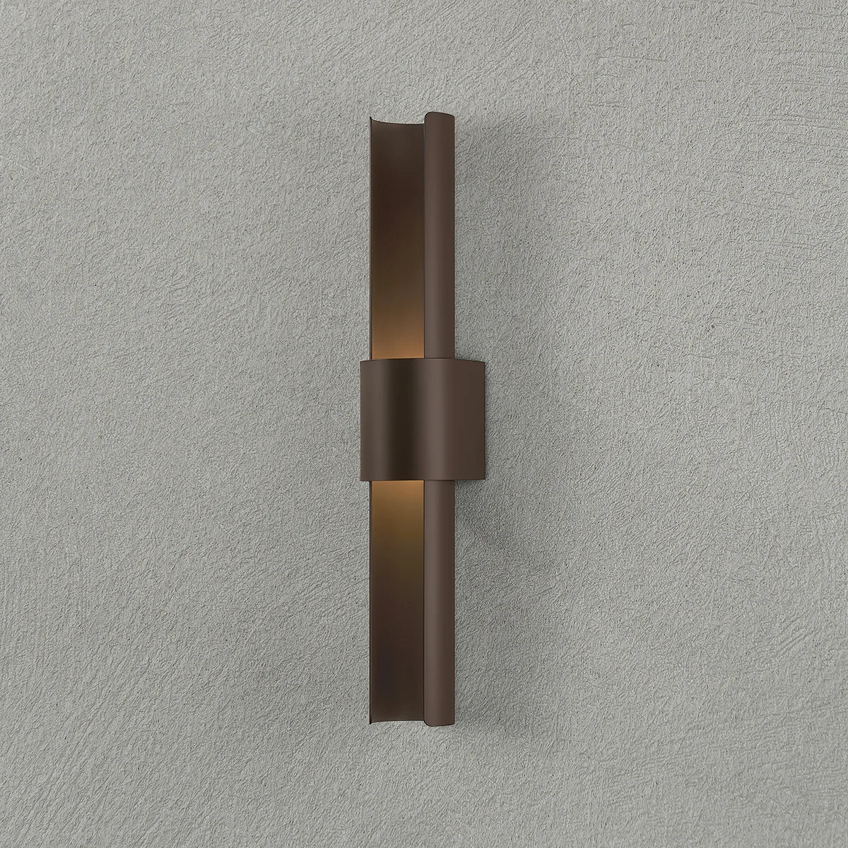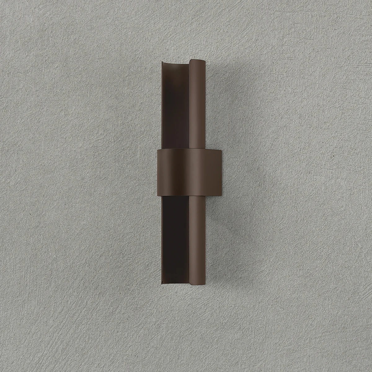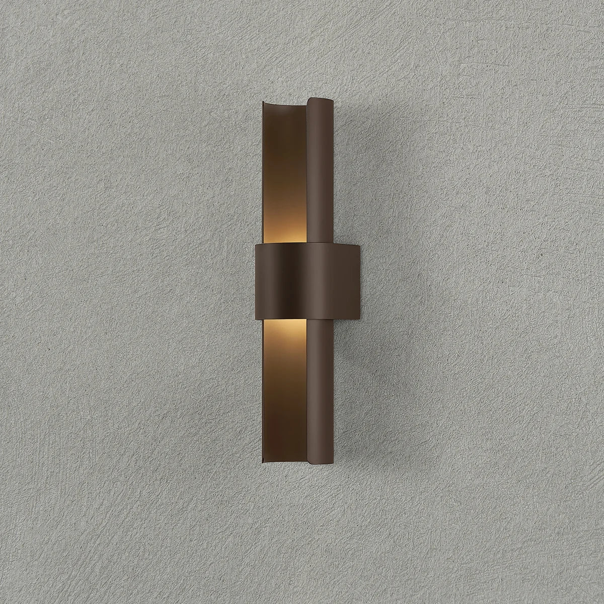 Meet the Ossian Outdoor Sconce. An industrial-modern sconce with graphic appeal, Ossian combines smooth curves and an allover Bronze materiality to create an edgy exterior staple. Its tubular shape creates a unique C-shaped channel that is intersected by a wide belt at the center, concealing the light source. As the channel fills with light, this graphic sconce casts an ambient glow around an outside area.
