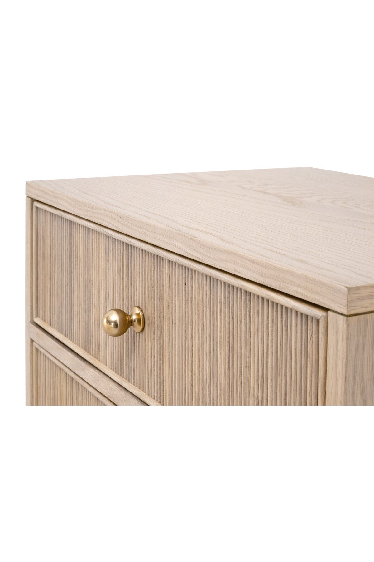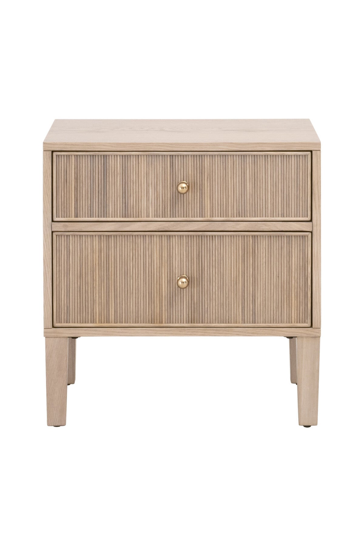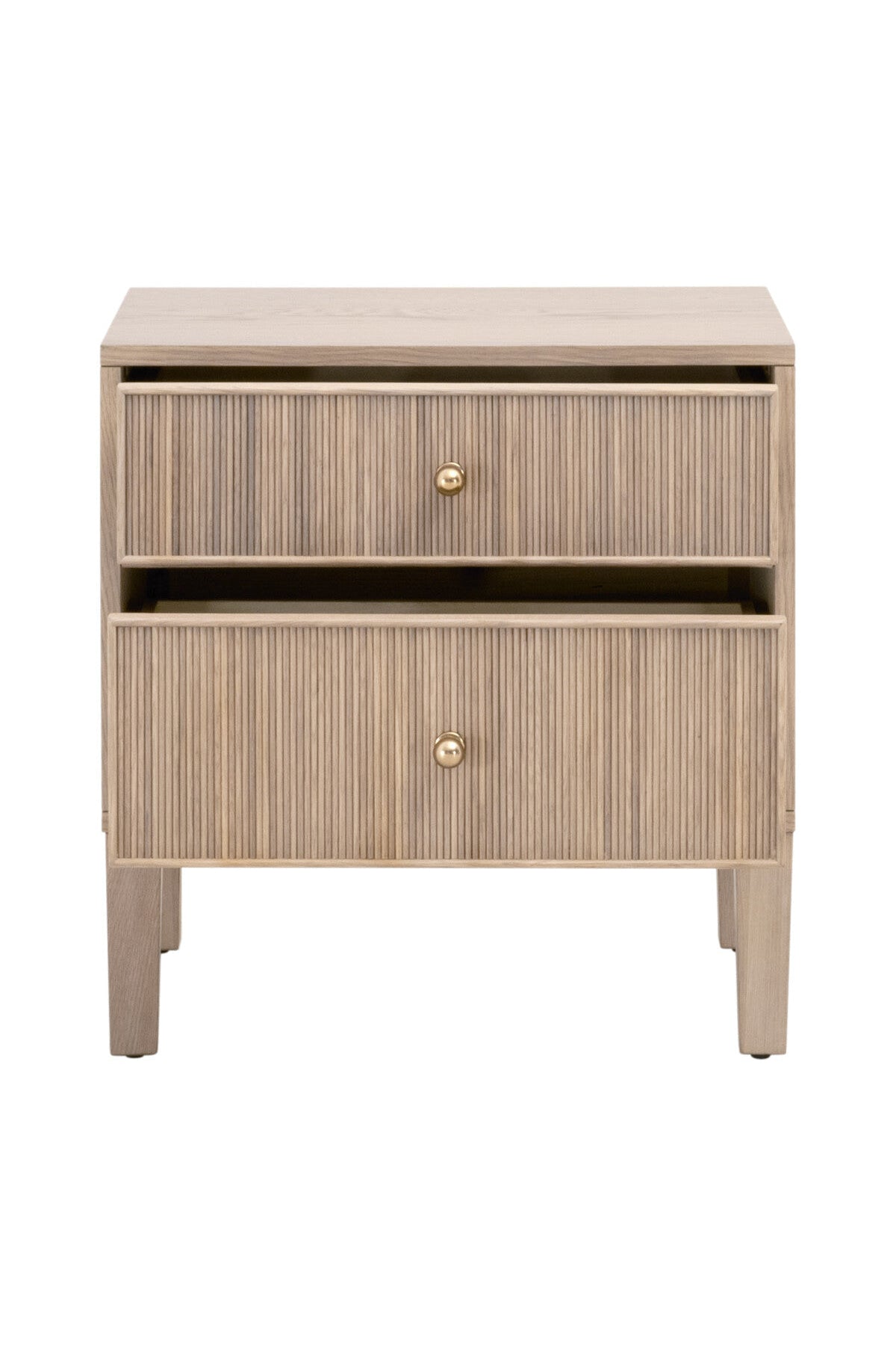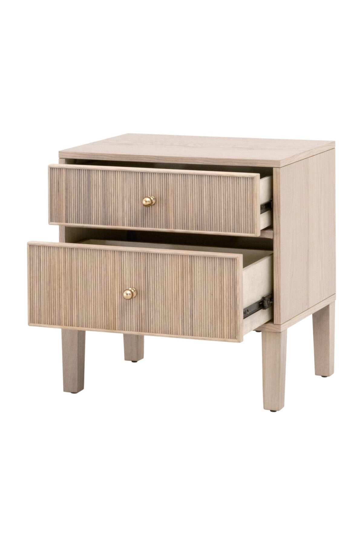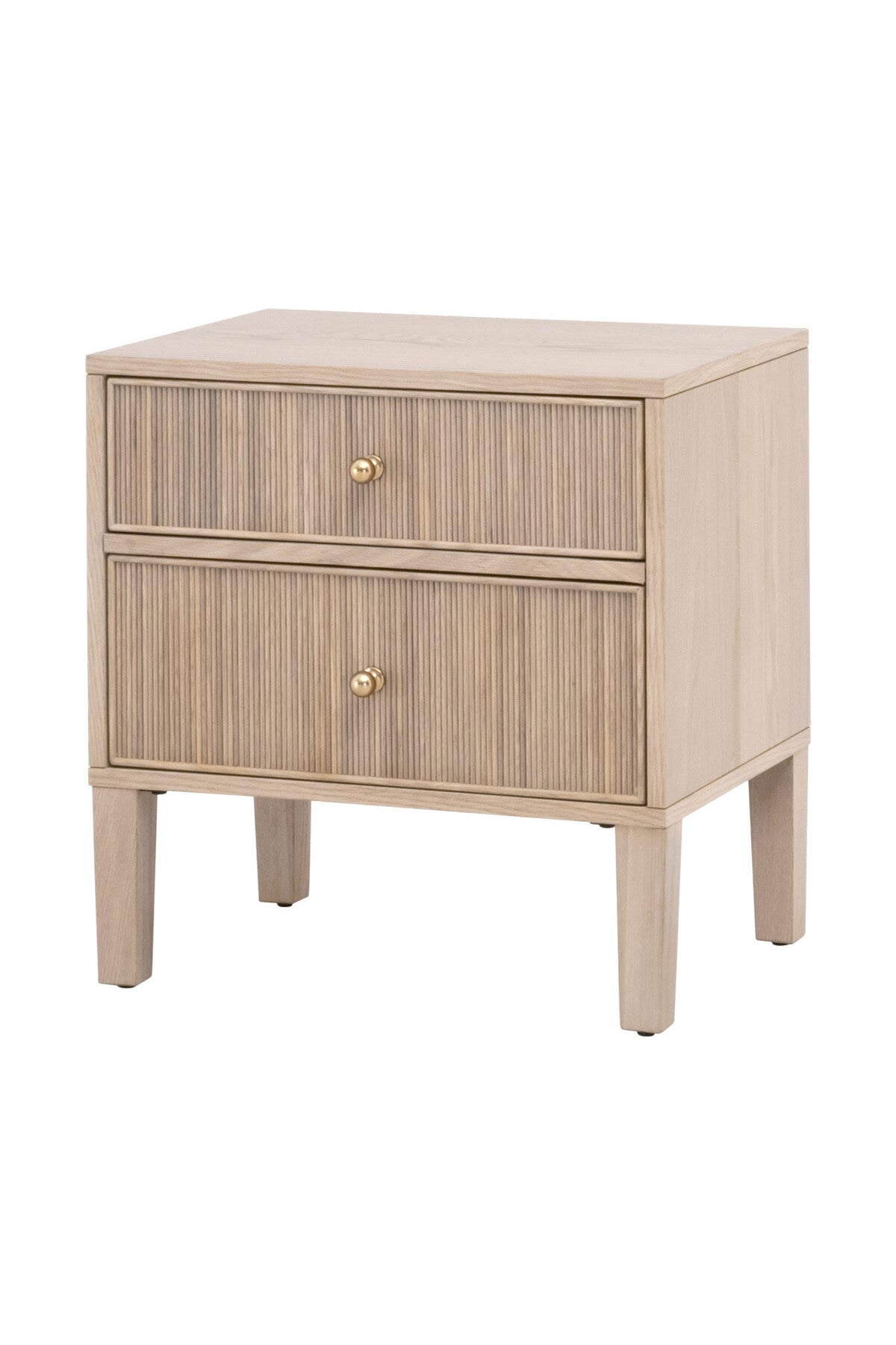 Enhance your bedroom with the Highland Nightstand, featuring a fluted wood drawer front, solid iron drawer knobs, and a felt-lined top drawer for added luxury. The dual 3/4 undermounted, soft-close metal drawer glides and dovetail joinery ensure durability, while the KD leg construction adds a touch of expert craftsmanship.