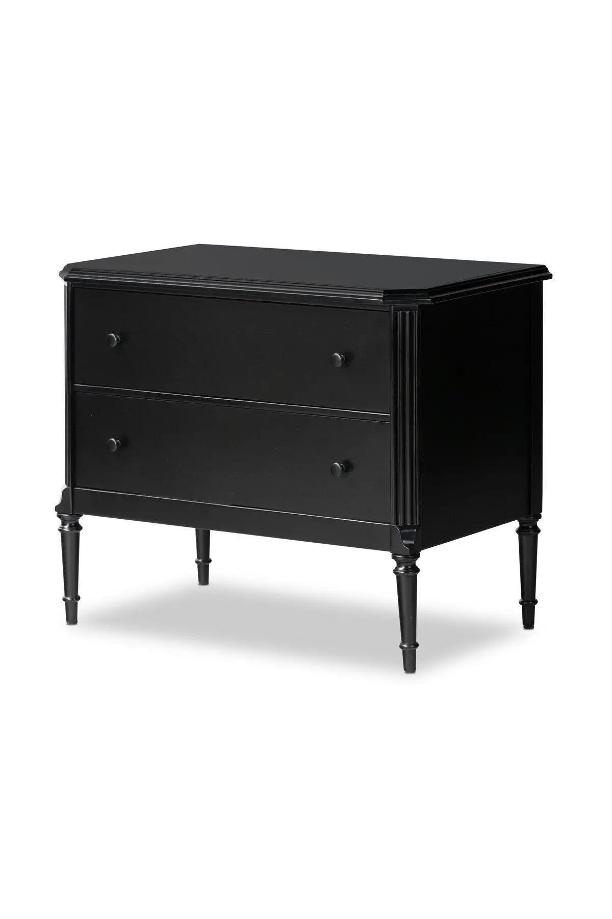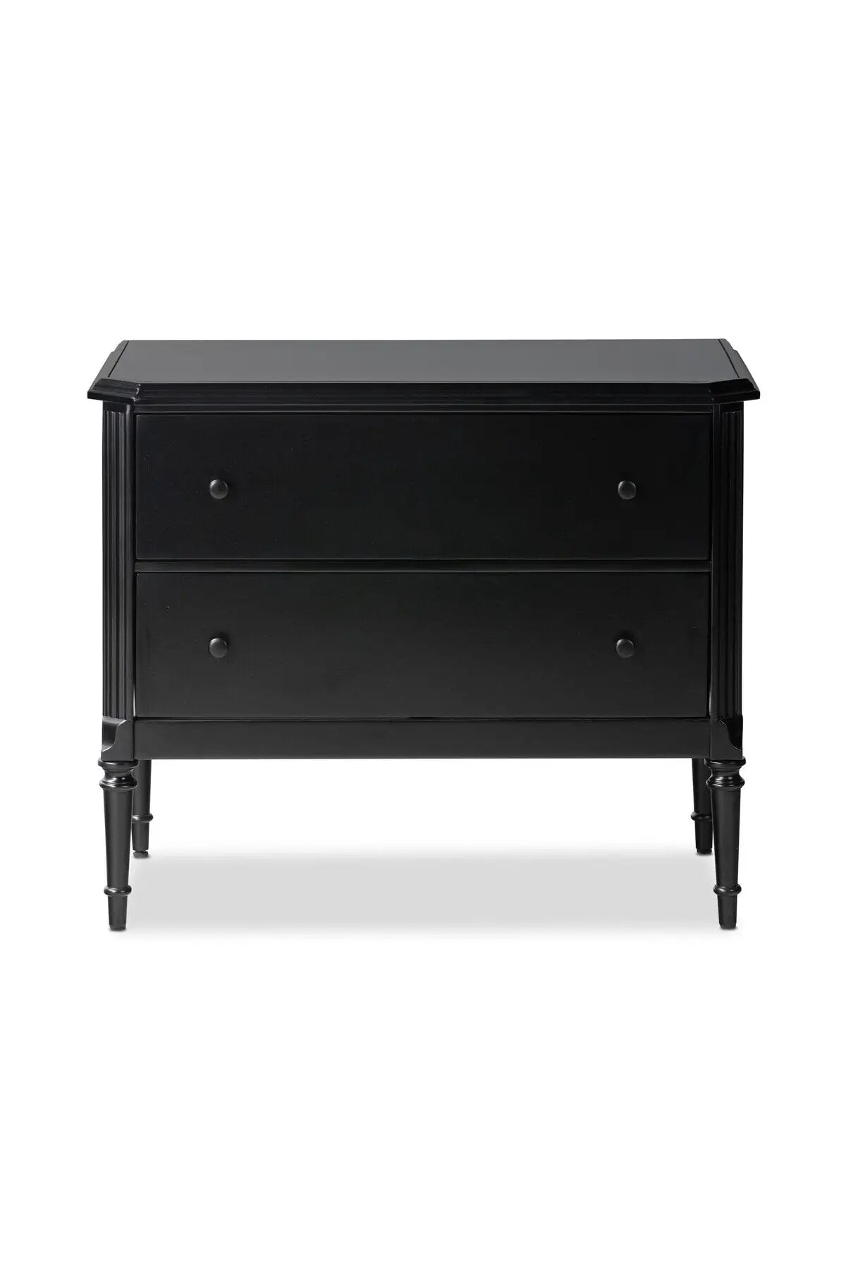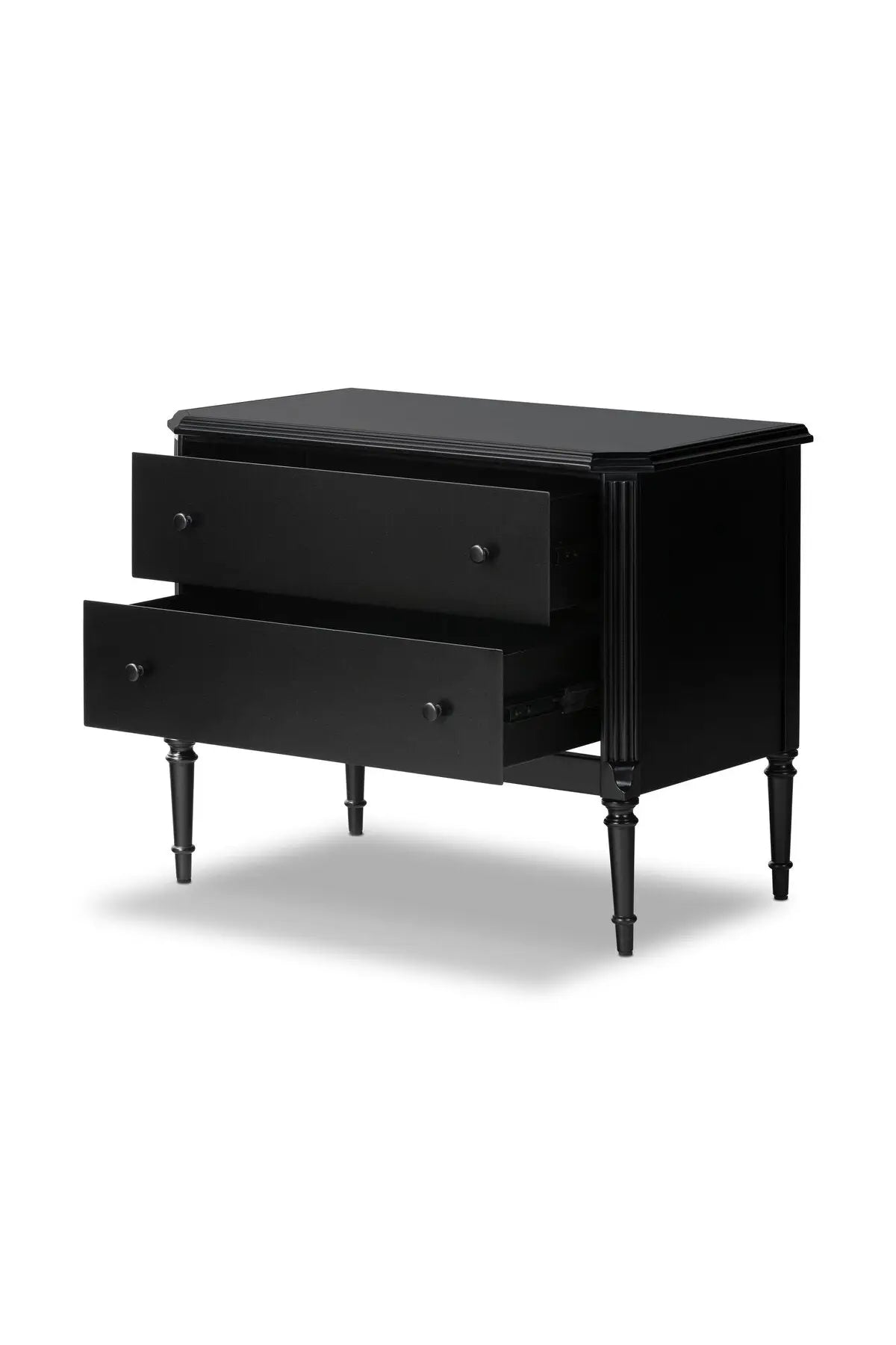 Meet the Lendon Nightstand. This French-inspired full-on metal nightstand features turned leg detailing, classic moulding along the edges and an ogee edging on top. Drawers open and close on smooth side-mount metal glides. Crafted from iron in a matte black.
