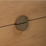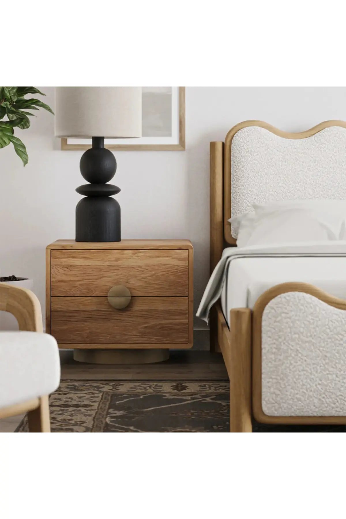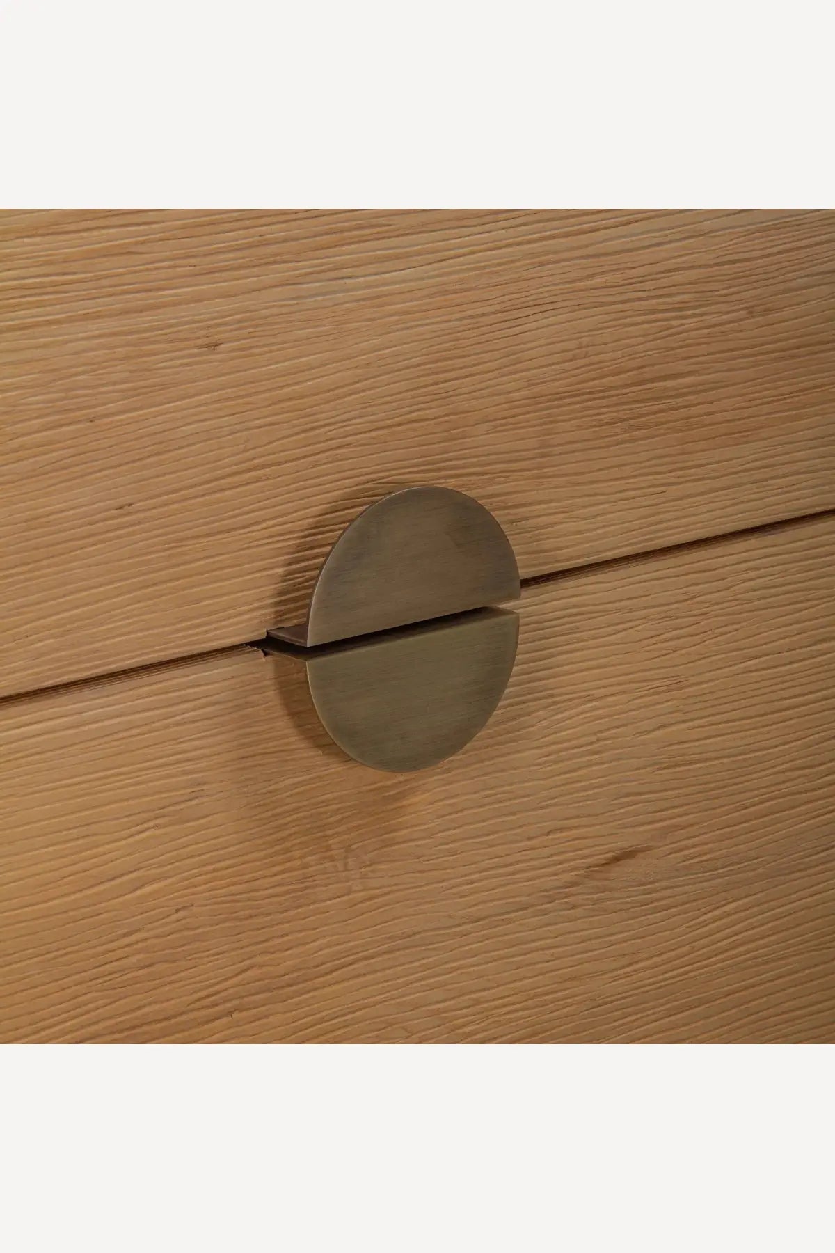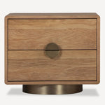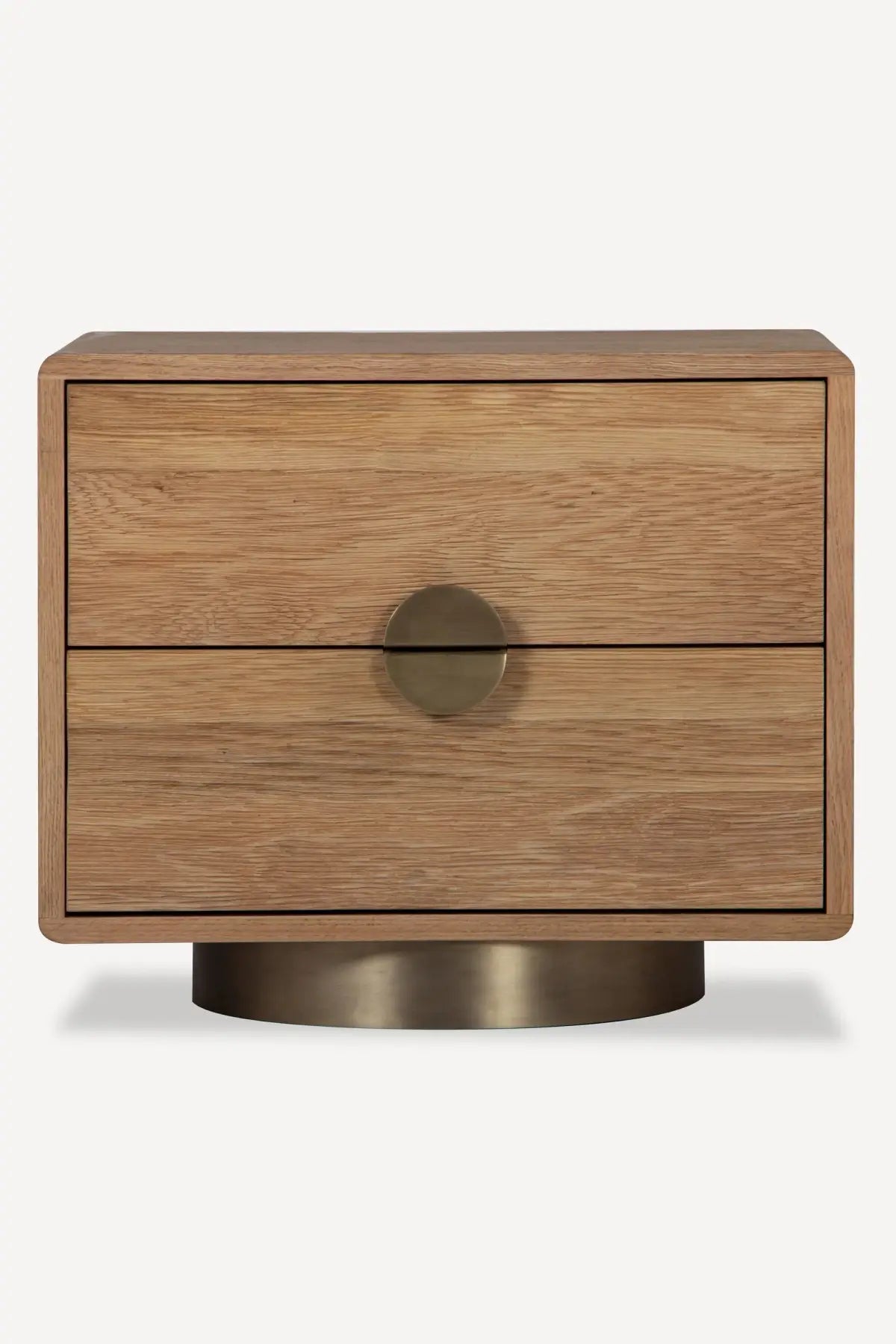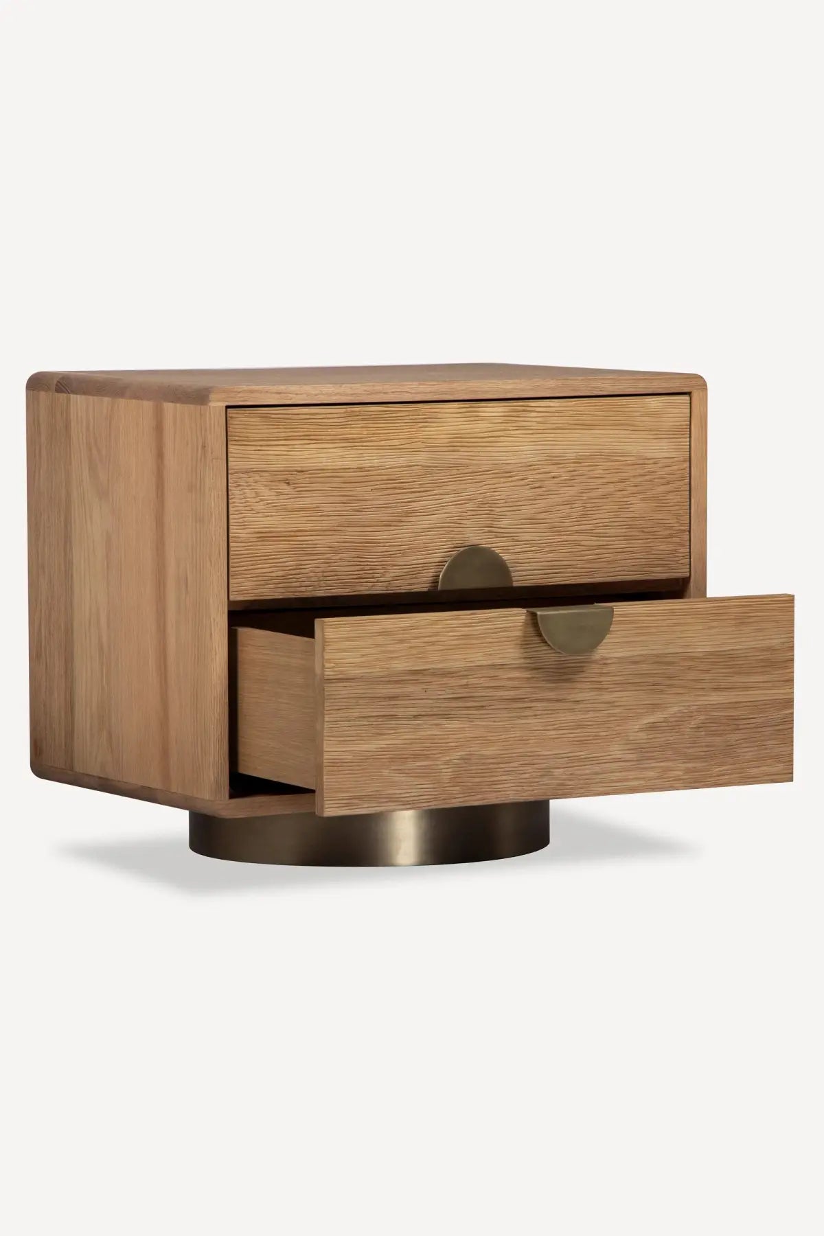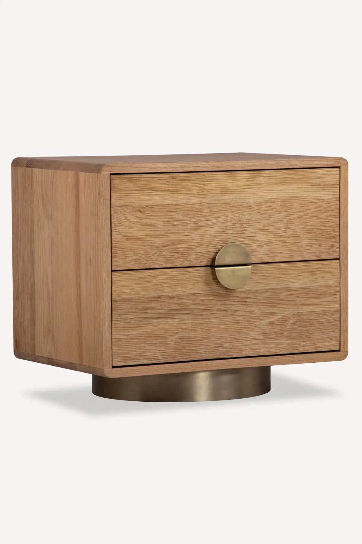 An elevated storage solution, the Podium Nightstand features textural, hand carved drawer fronts, framed by solid, FSC certified oak cases. Custom brass drawer pull hardware and rounded brass plinth bases completes this one of a kind design.