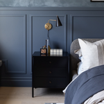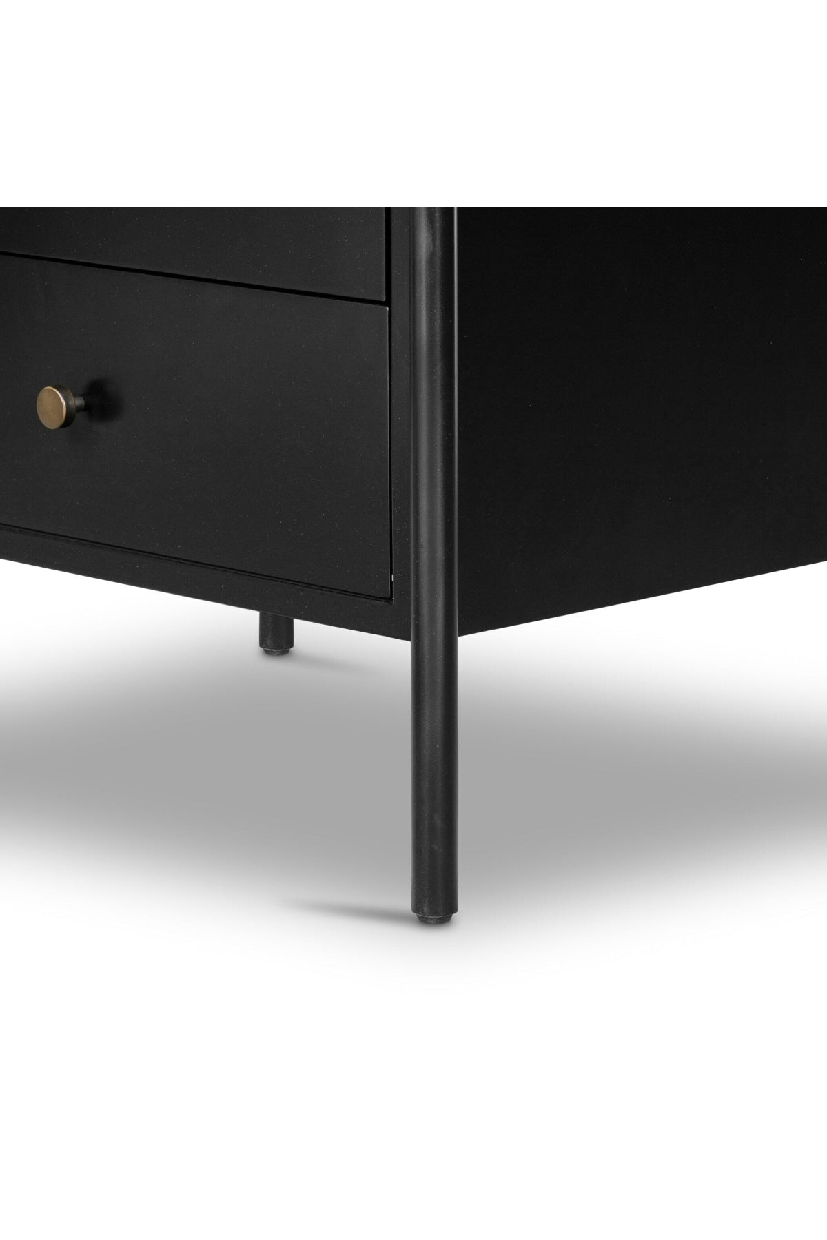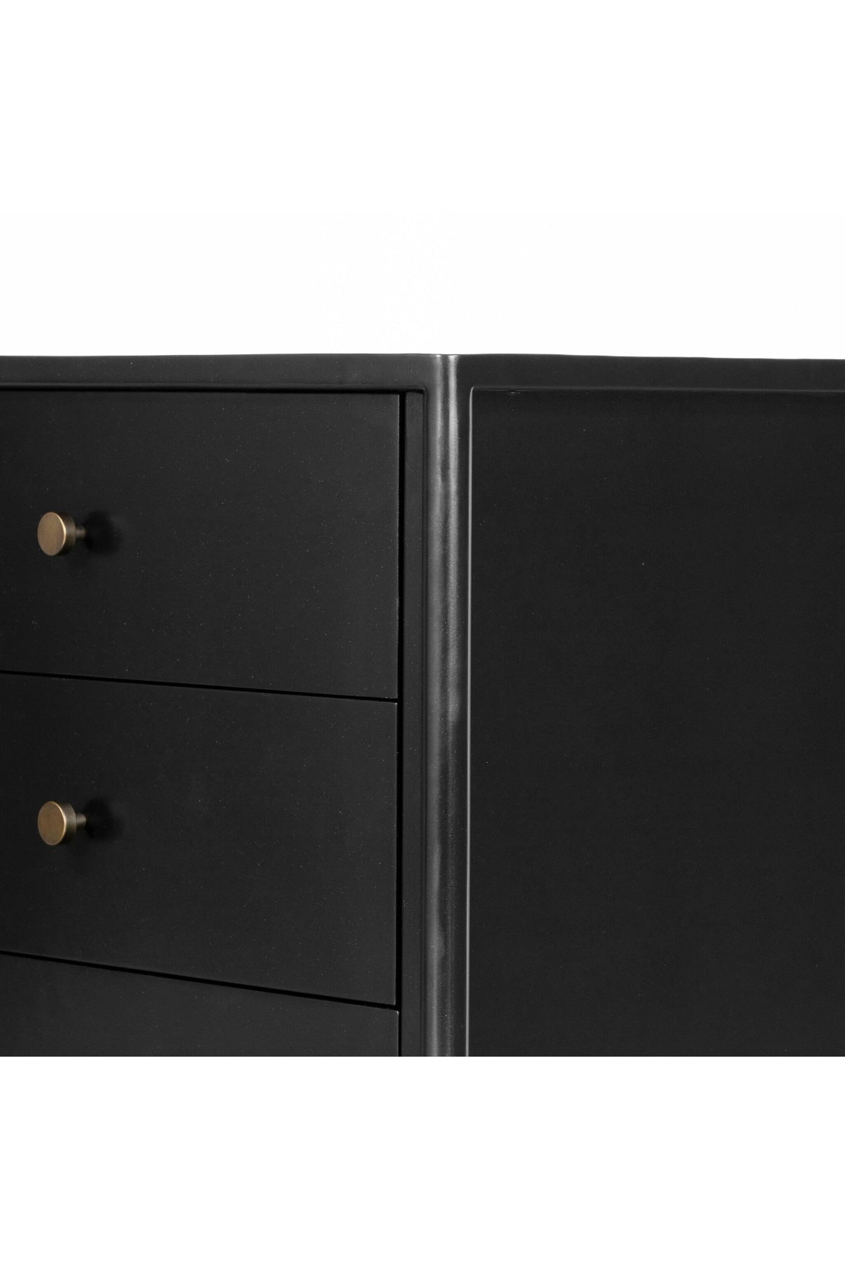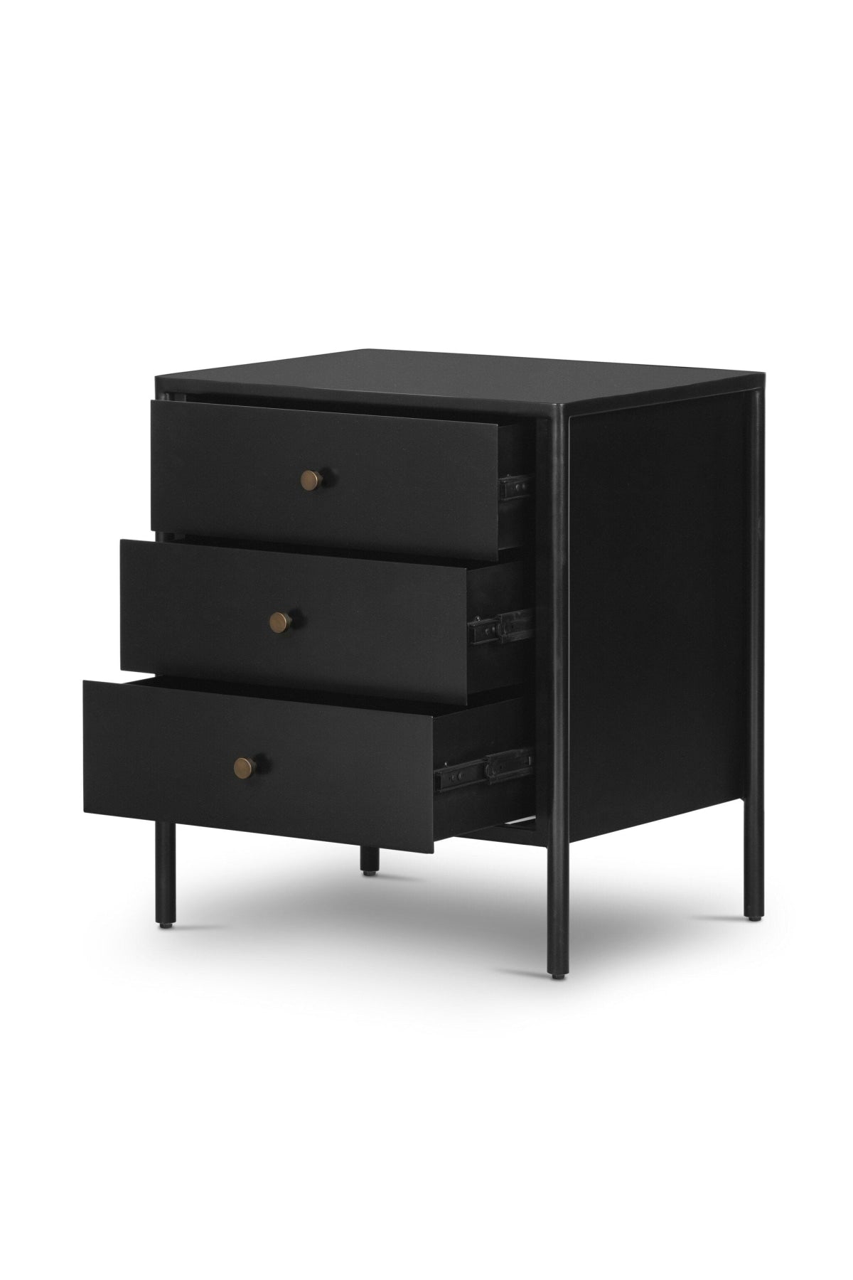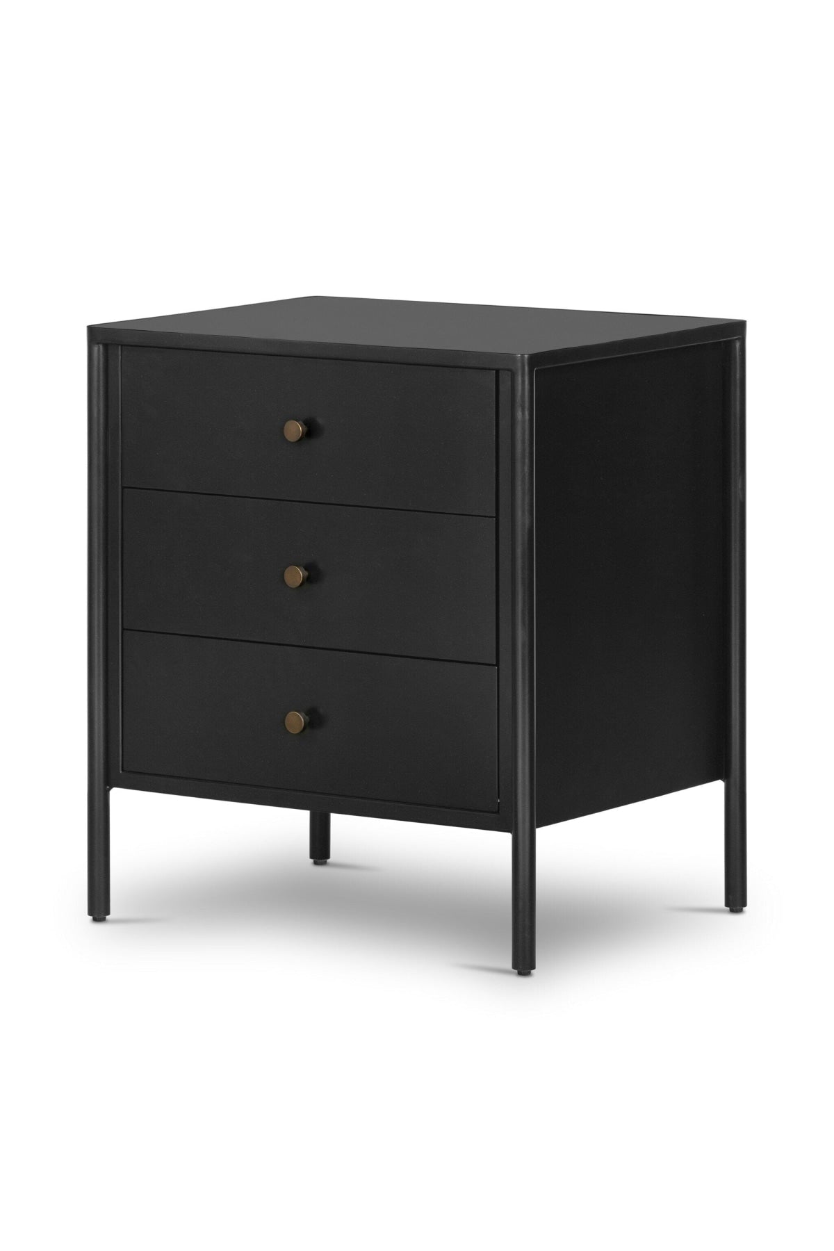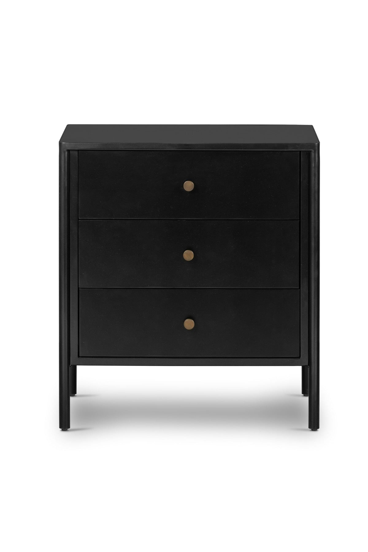 Meet the Soto Nightstand. Bring a clean, beautifully industrial look to the bedroom with a three-drawer dresser made from black-finished iron, featuring bronzed iron hardware.