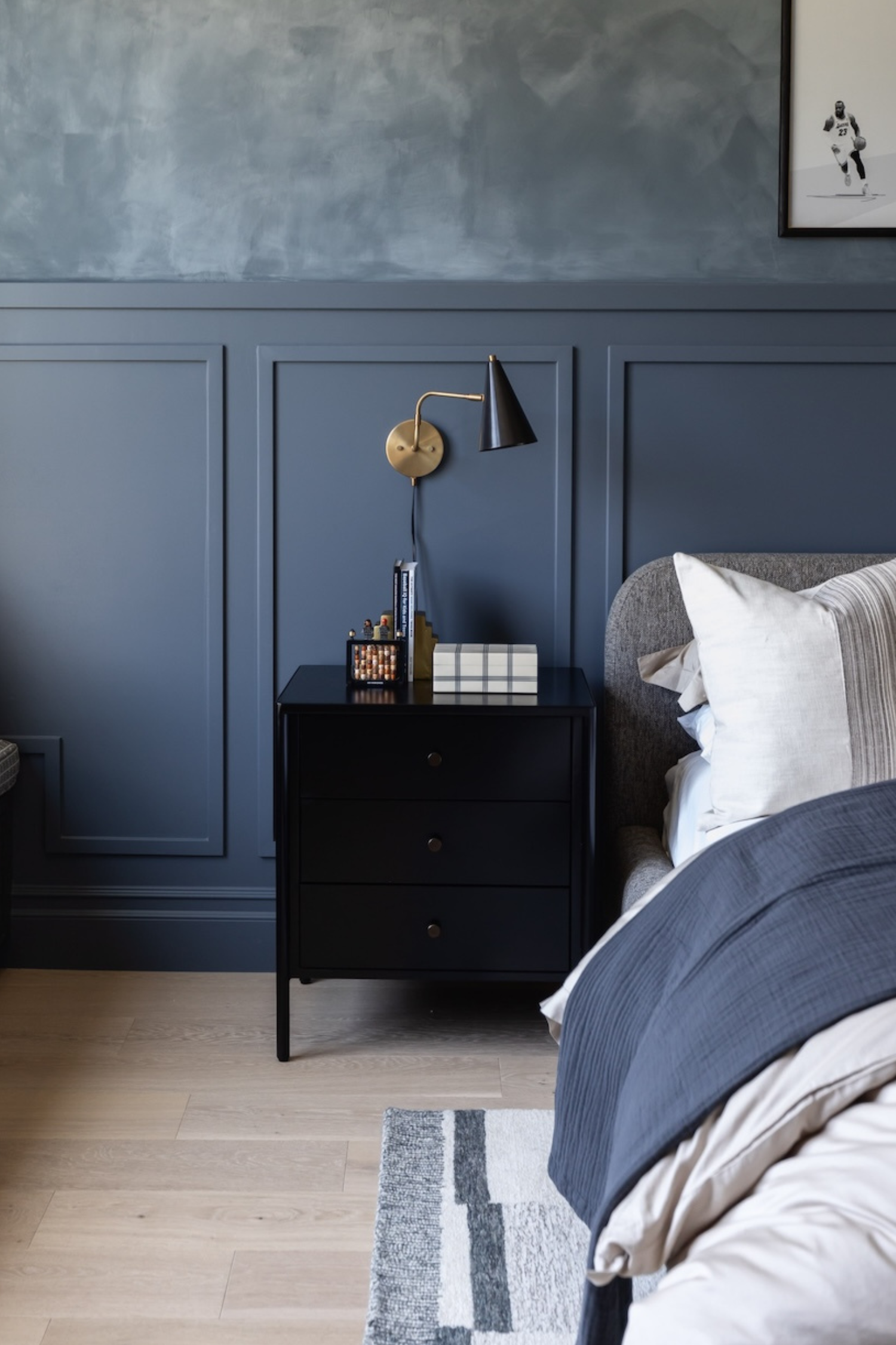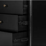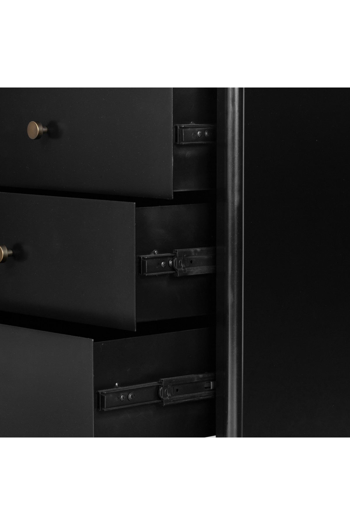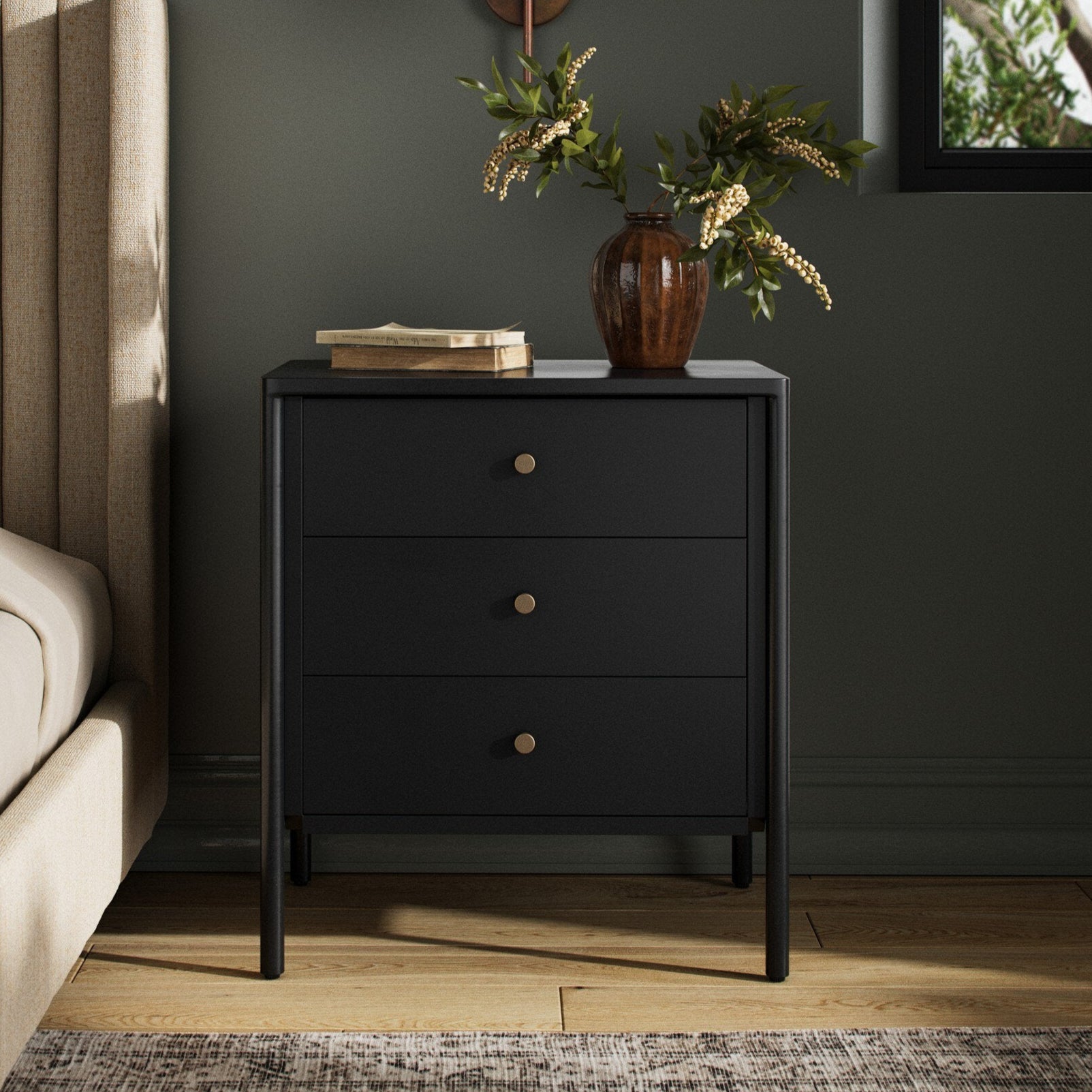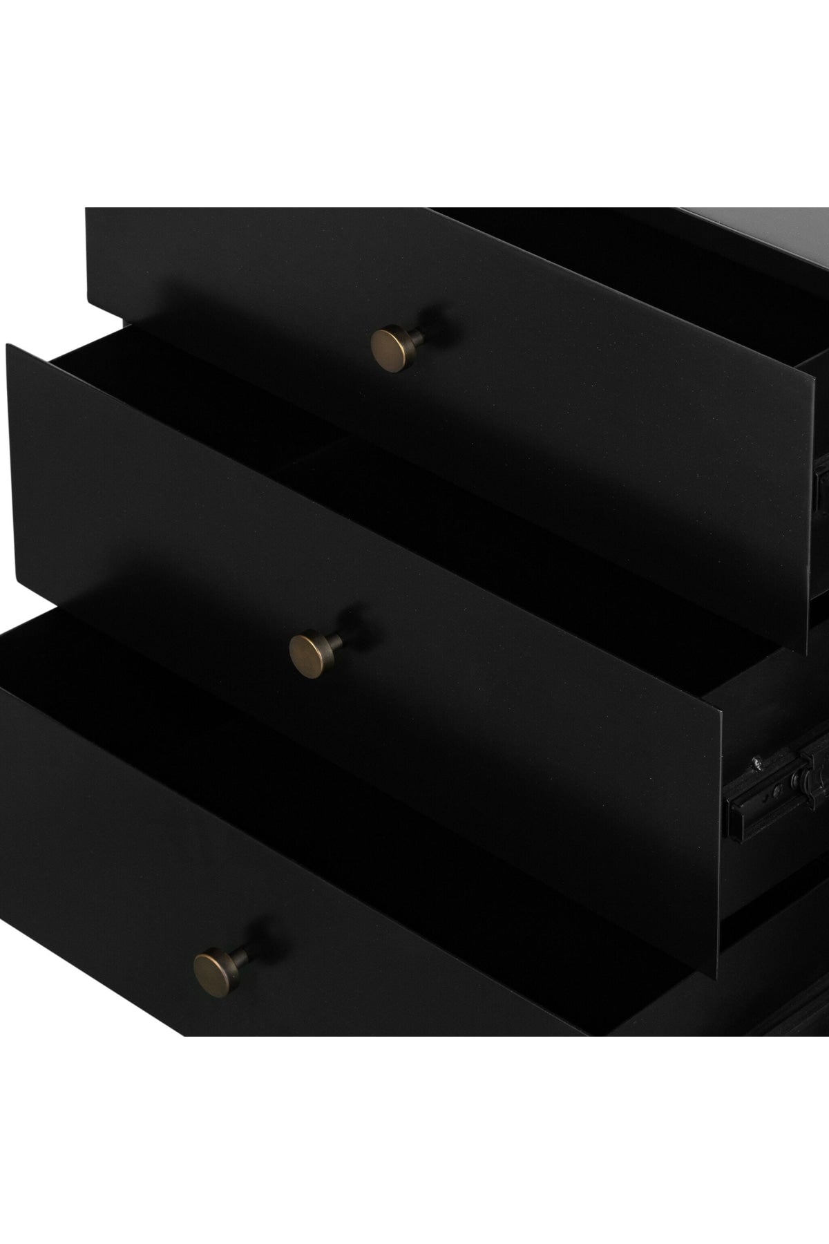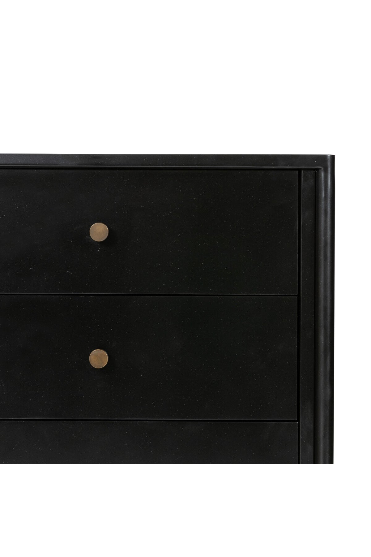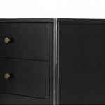 Meet the Soto Nightstand. Bring a clean, beautifully industrial look to the bedroom with a three-drawer dresser made from black-finished iron, featuring bronzed iron hardware.