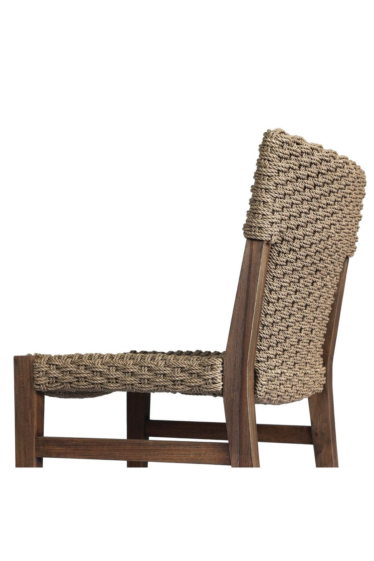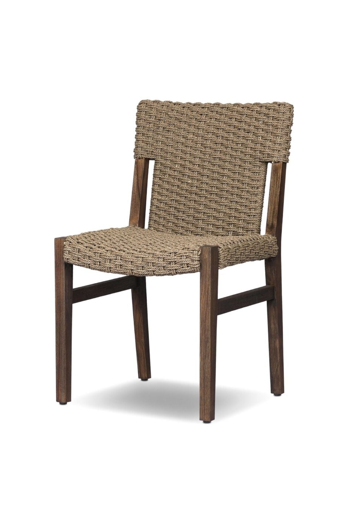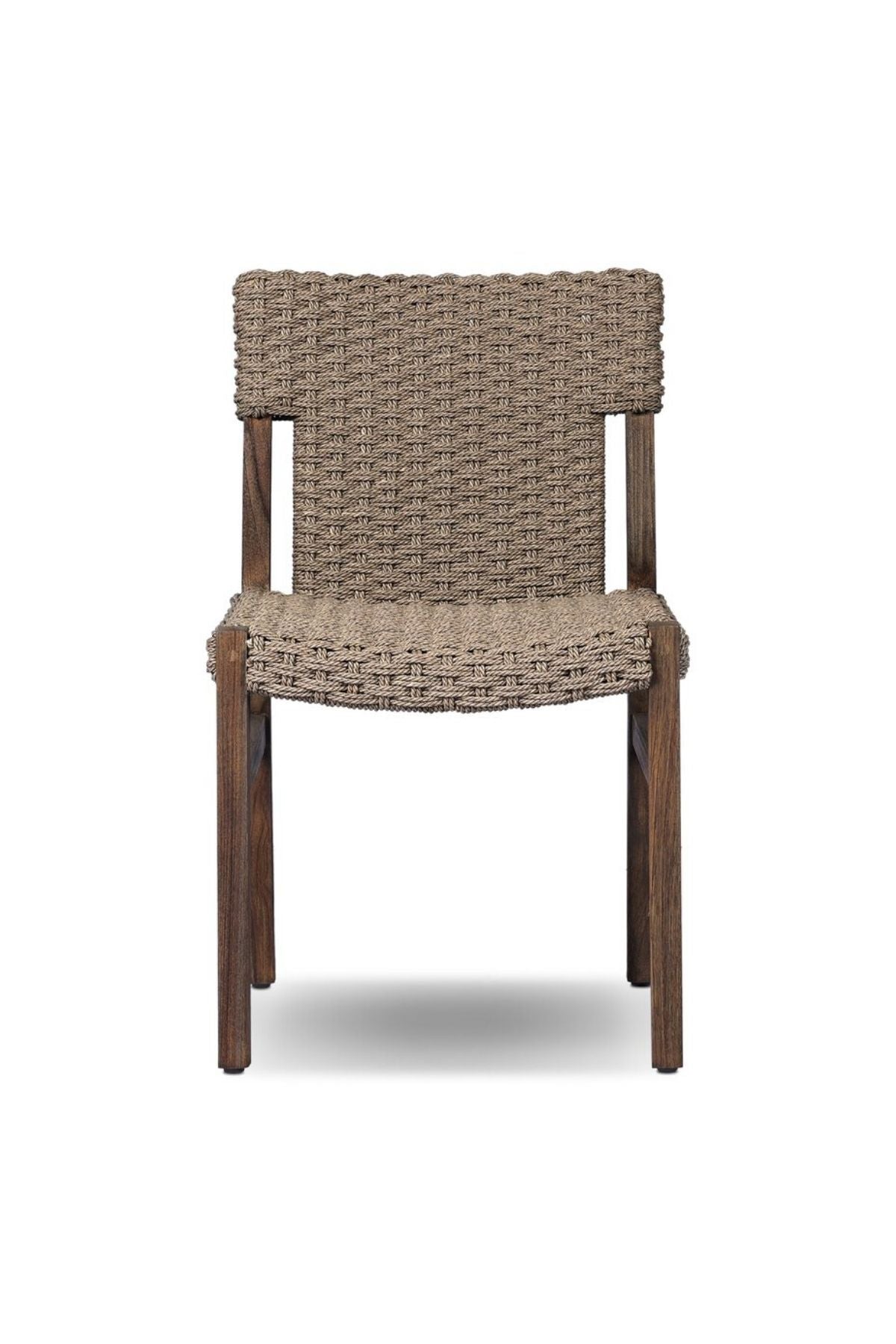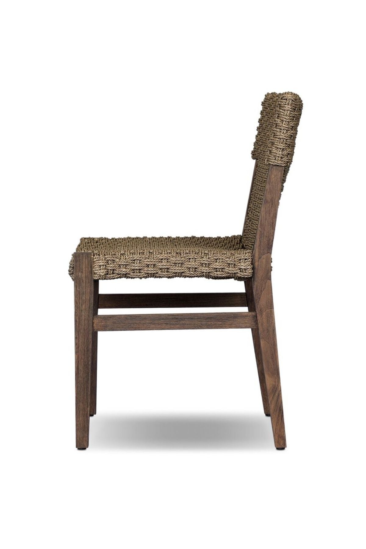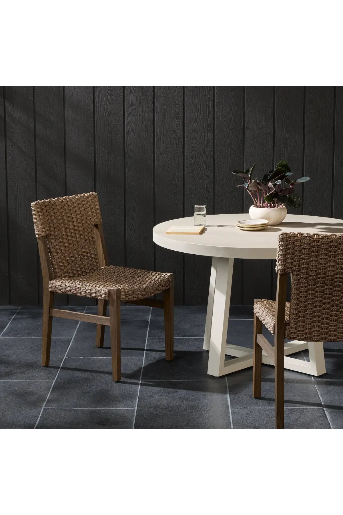 Meet the Cromwell Outdoor Dining Chair. Add texture to your outdoor space with a Nordic-inspired dining chair. A subtle sling seat of all-weather wicker crafts a chunky weave, all framed out by FSC®-certified teak. Cover or store indoors during inclement weather and when not in use.