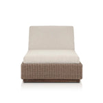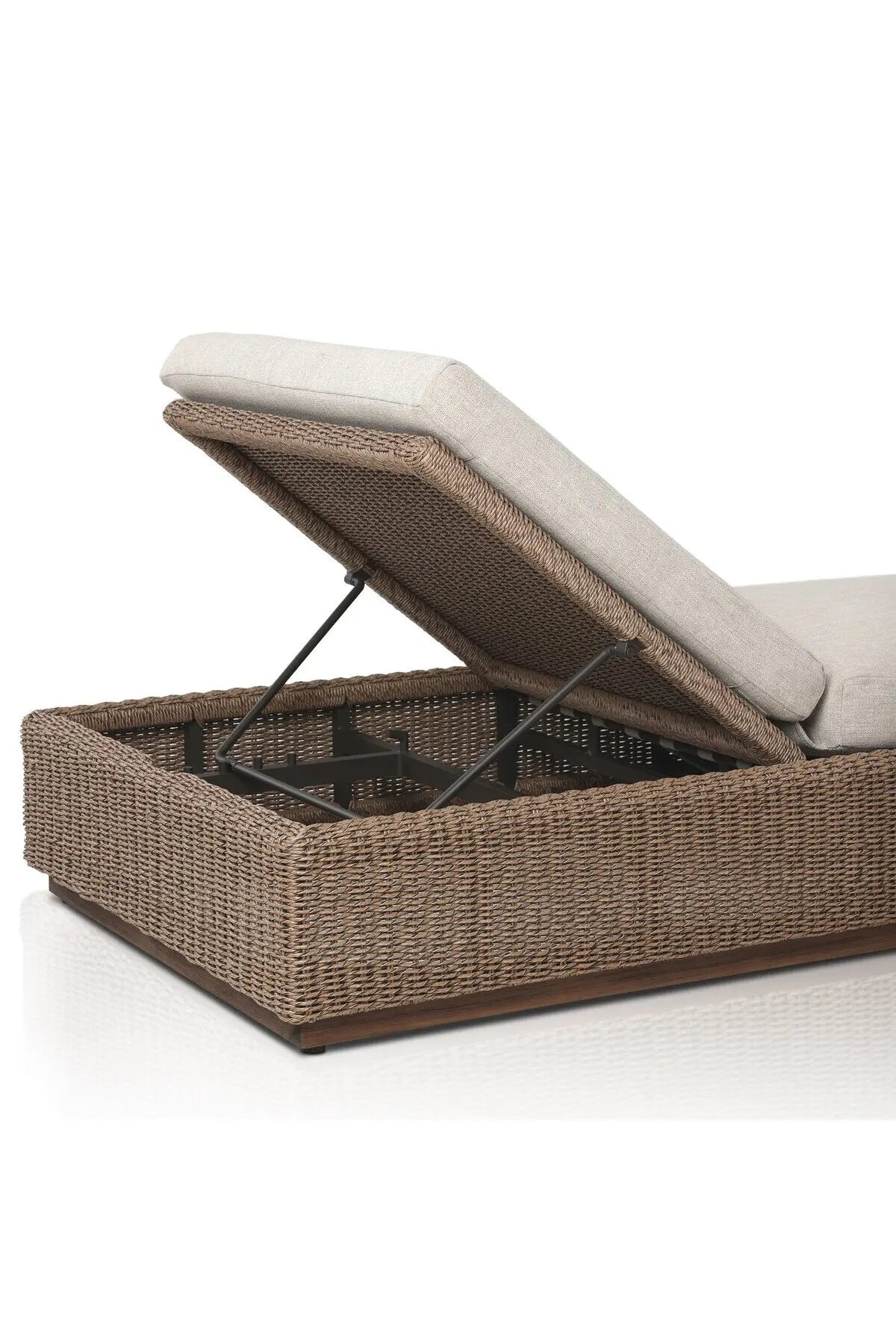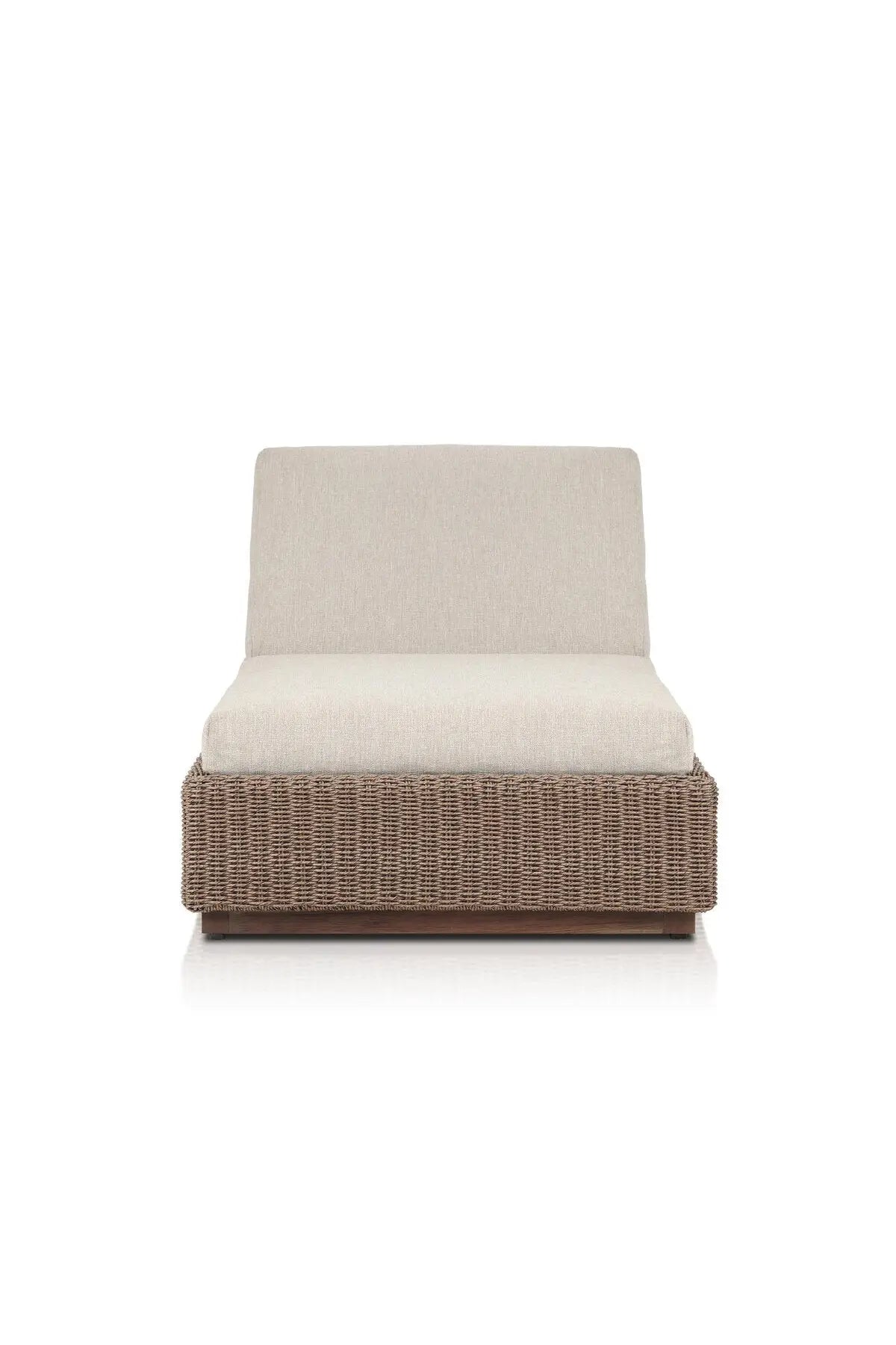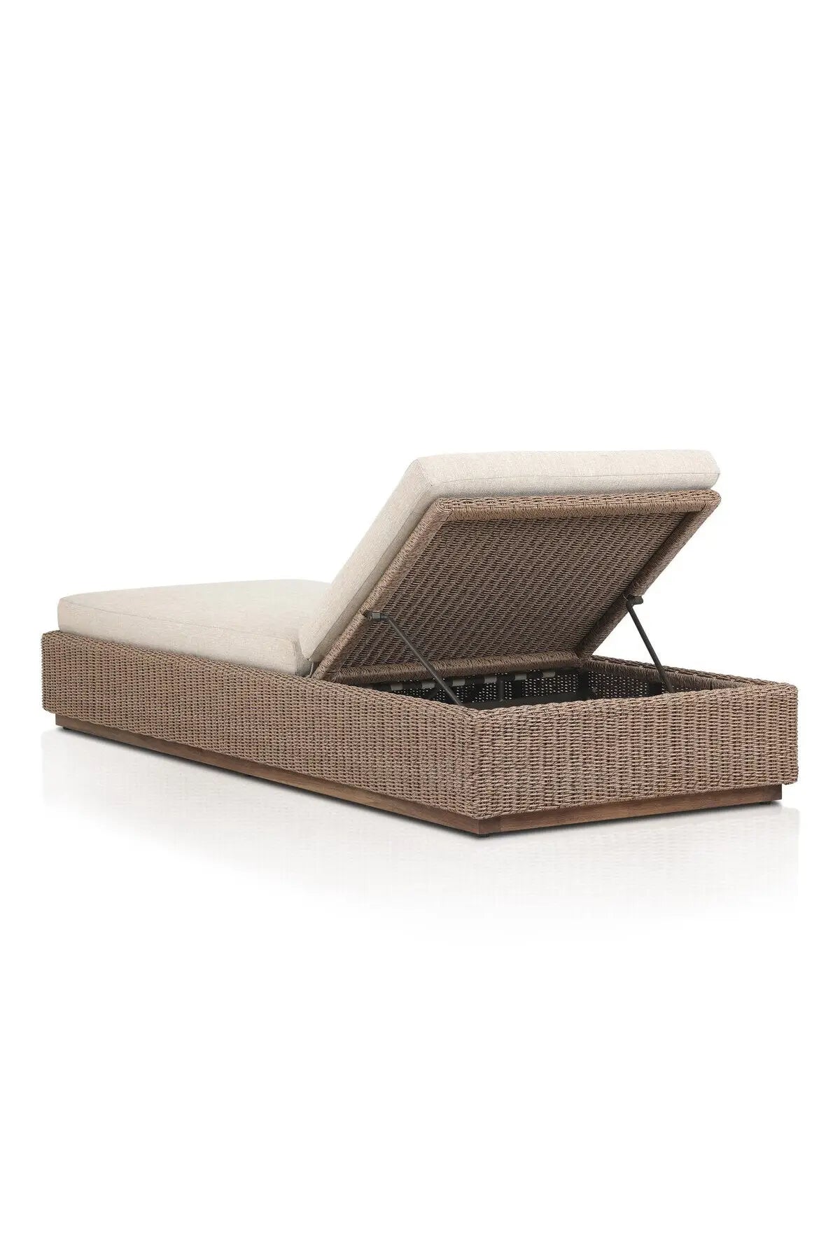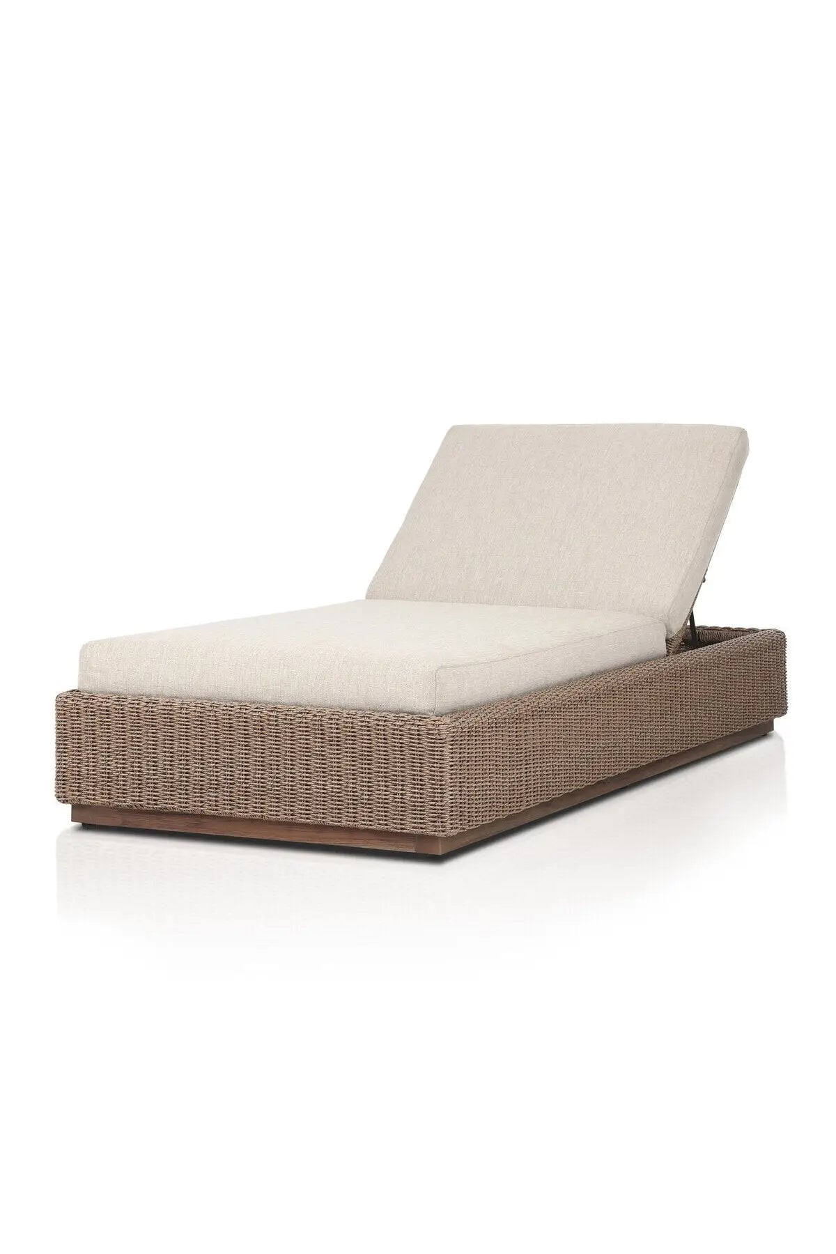 Meet the Lorelei Outdoor Chaise. A slim, stylish profile invites outdoor lounging. The woven box base frames durable, outdoor-friendly cushioning in soft buff. An adjustable back offers personalized comfort, while the wooden plinth elevates the sleek design. Cover or store indoors during inclement weather and when not in use.