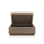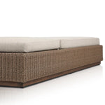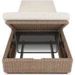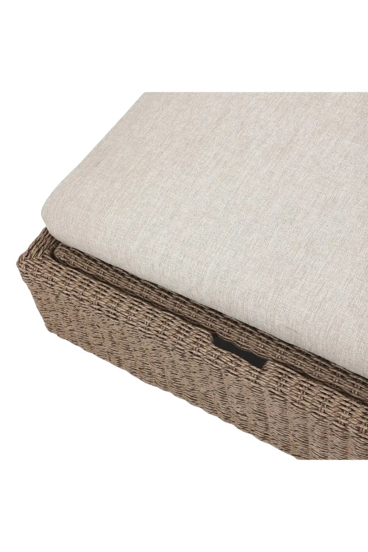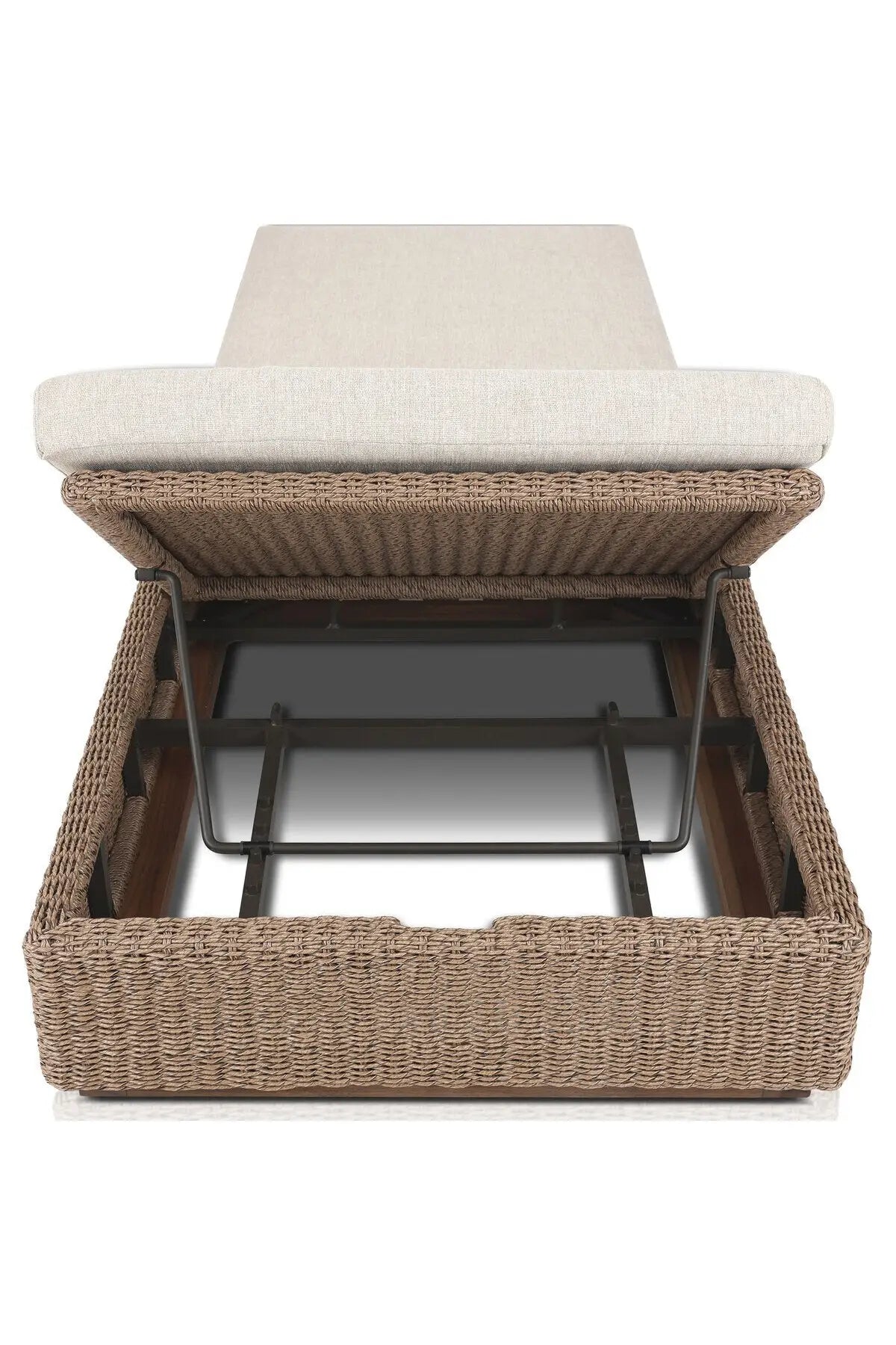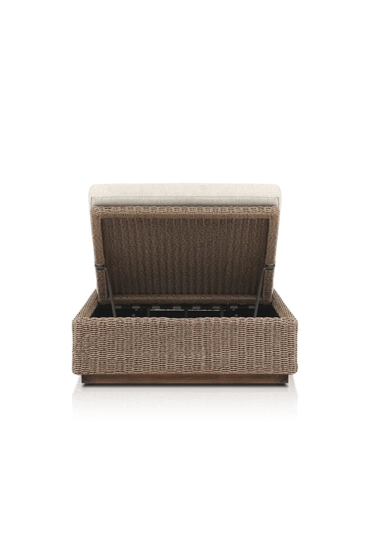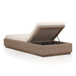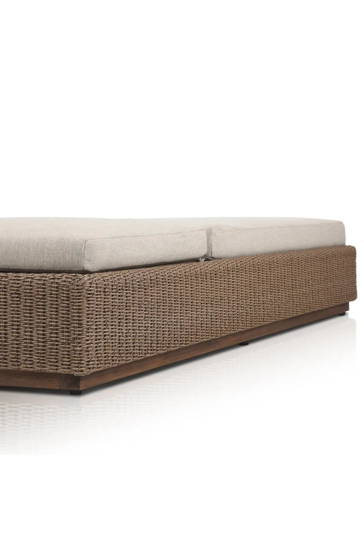 Meet the Lorelei Outdoor Chaise. A slim, stylish profile invites outdoor lounging. The woven box base frames durable, outdoor-friendly cushioning in soft buff. An adjustable back offers personalized comfort, while the wooden plinth elevates the sleek design. Cover or store indoors during inclement weather and when not in use.