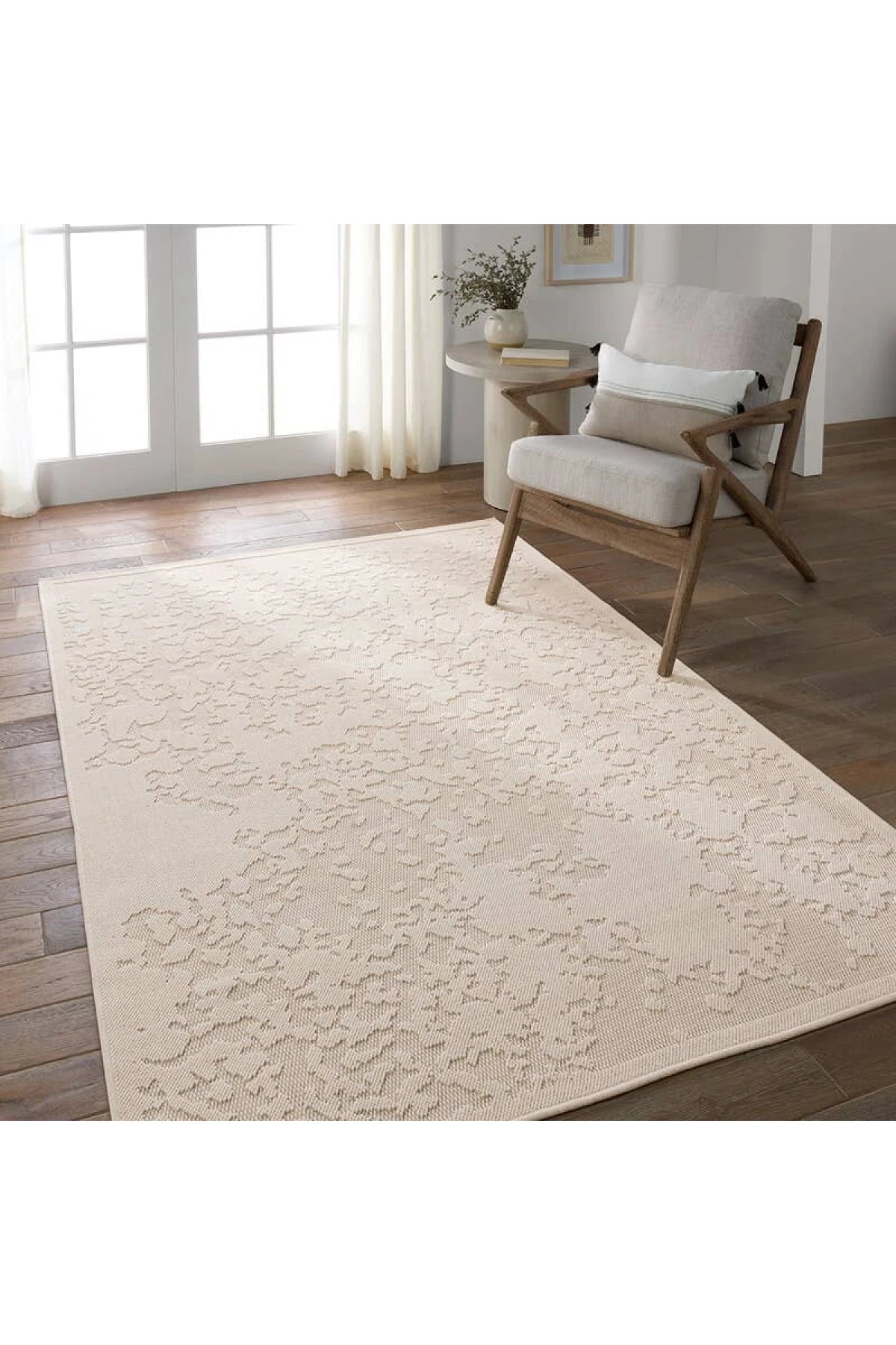 Meet the Continuum Rug - Style 3. This Rug offers a durable sisal-inspired design with a soft geometric pattern. Made from stain- and water-resistant polypropylene, it’s perfect for busy indoor or outdoor spaces.. Samples are modeled at our North Scottsdale/Phoenix location.