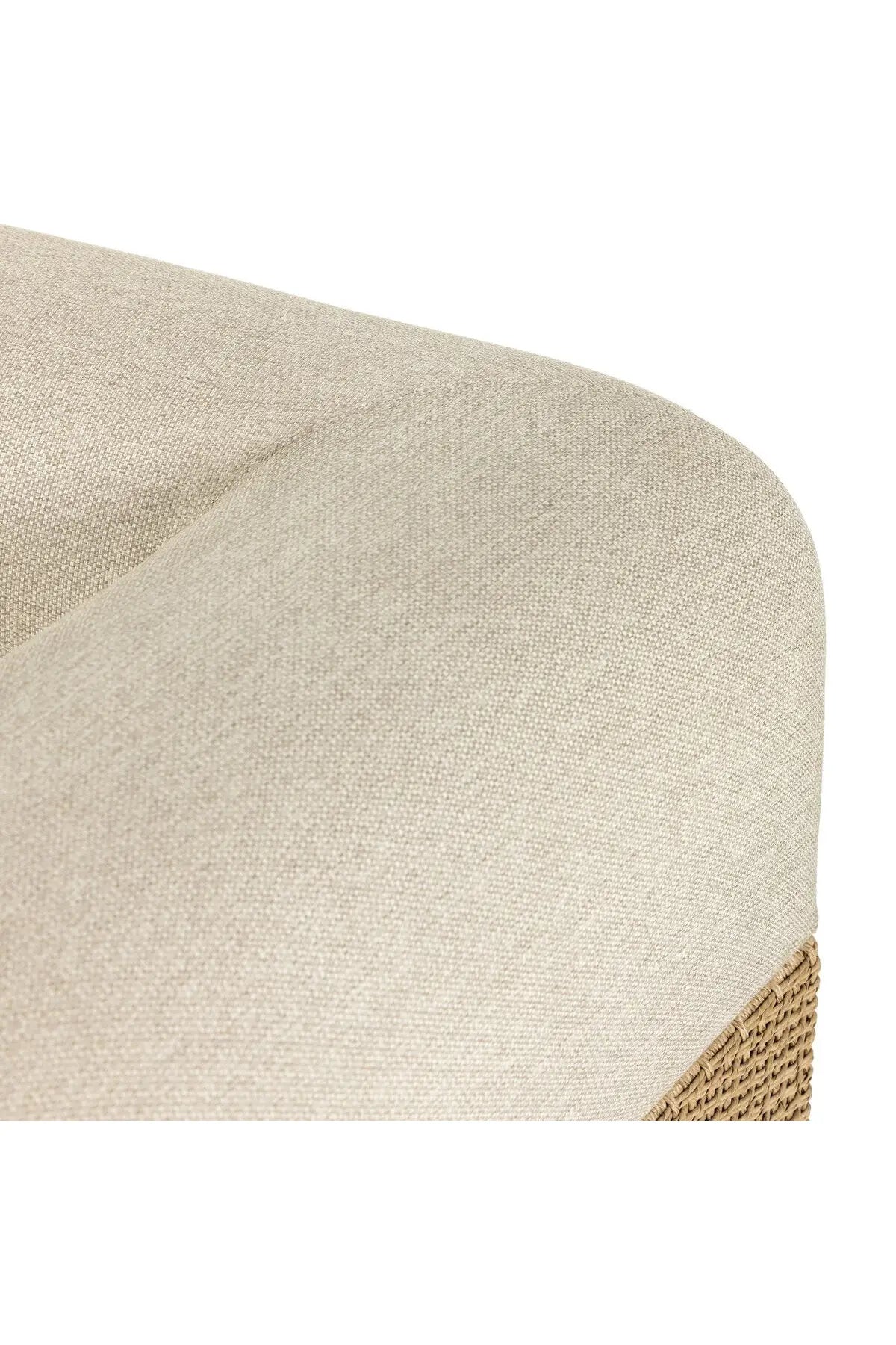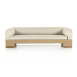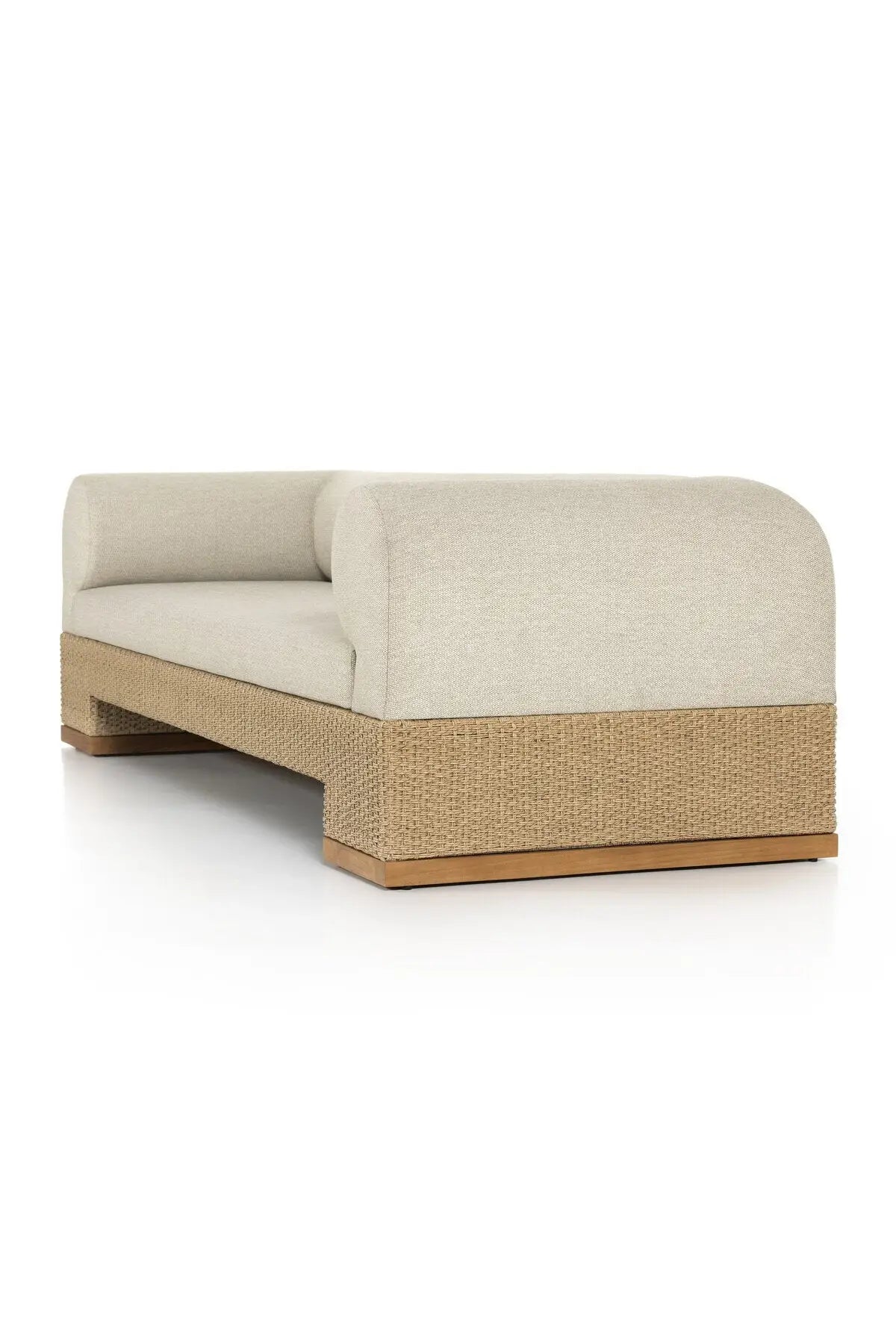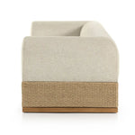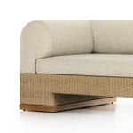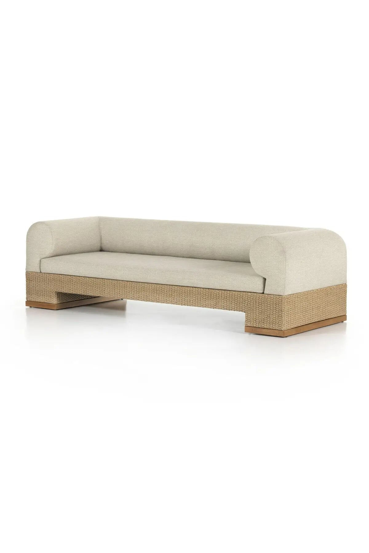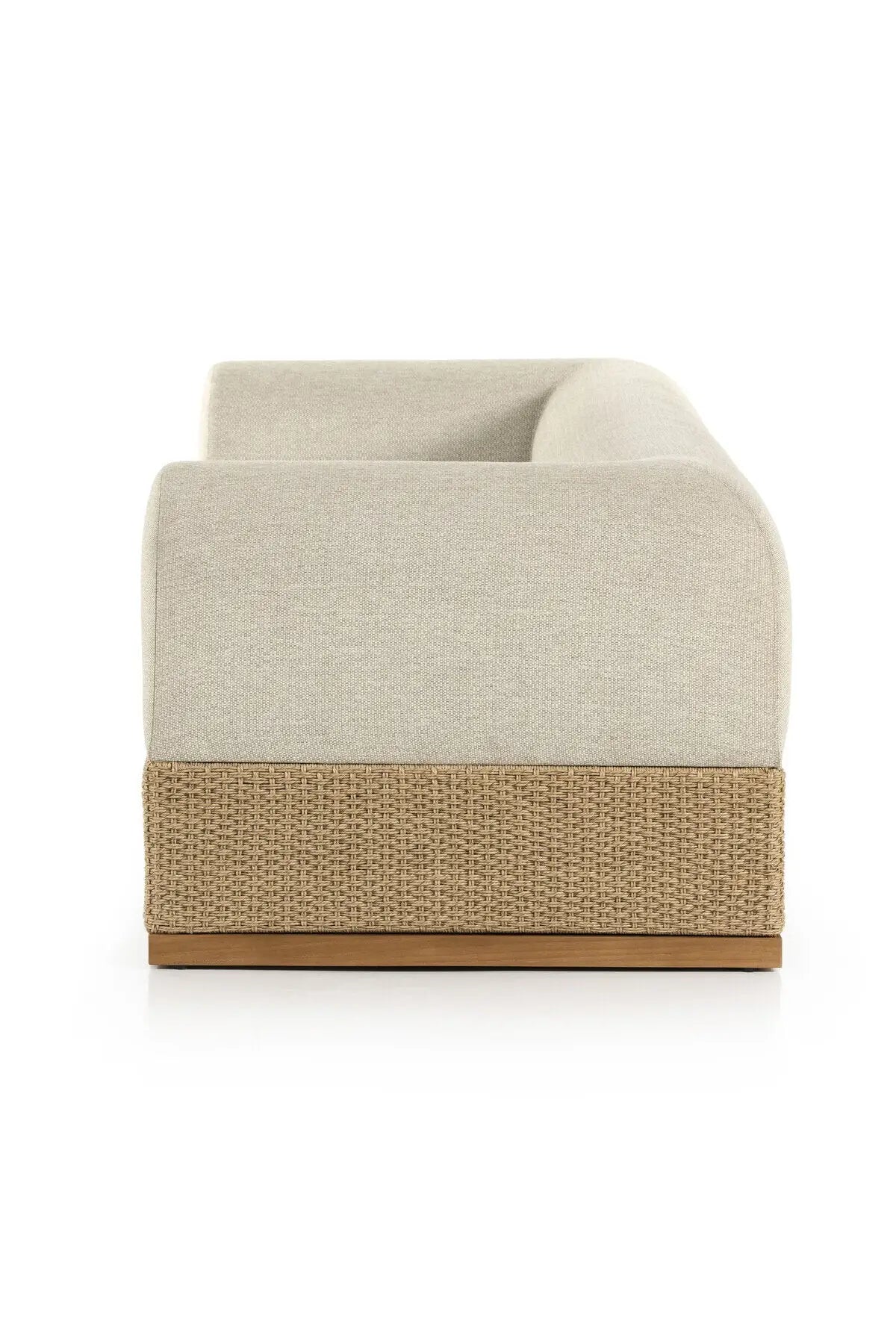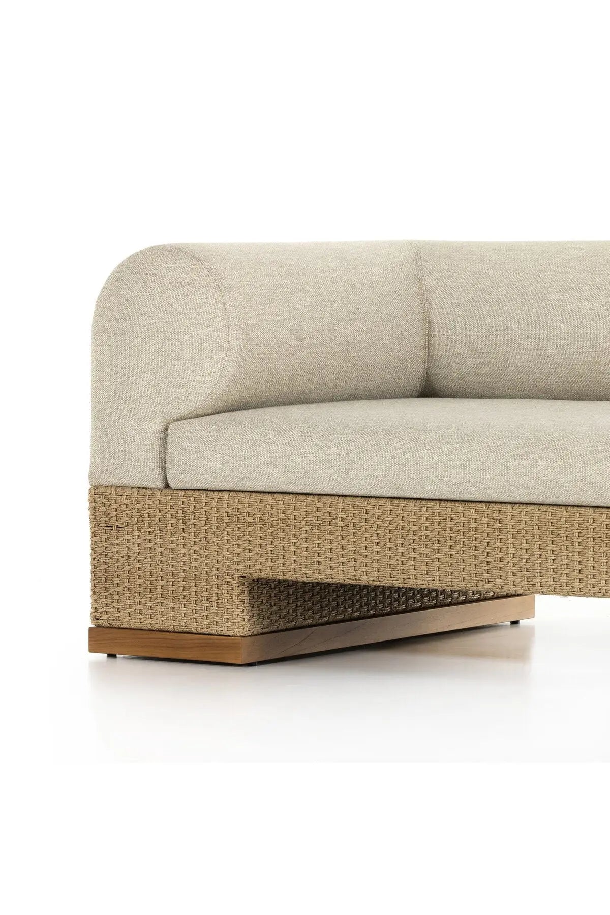 Meet the Joss Outdoor Sofa. Regal outdoor seating in an extra-long length. Seat cushion and sculptural arms and back bolsters are tightly upholstered in 100% Olefin known for its UV-resistant, water-repellent, quick-drying abilities. Cutout wicker base adds a sense of airiness to the design above teak plinth feet. Cover or store indoors during inclement weather and when not in use.