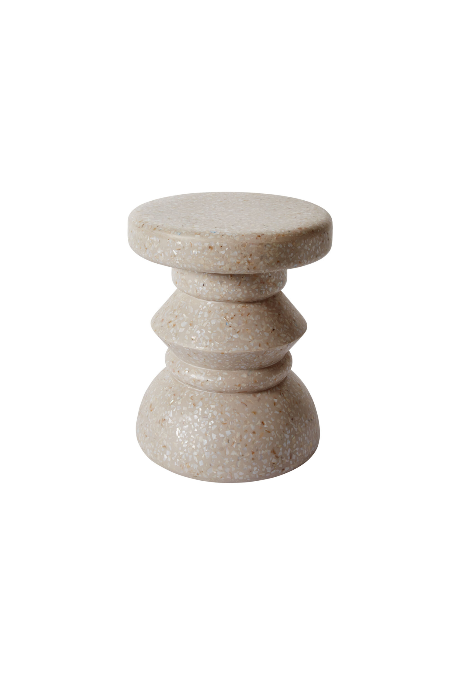 With a marbled, terrazzo-style, shimmered finish & sculptural, accordion shape, the Prisma Stool offers a contemporary yet timeless elegance to the home. Made from a sturdy yet lightweight fiber composite material with an organic design & natural colors of an off-white base & inset opalescent flakes, this piece is a lovely plant stand or a side table indoors or on an outdoor patio.