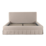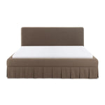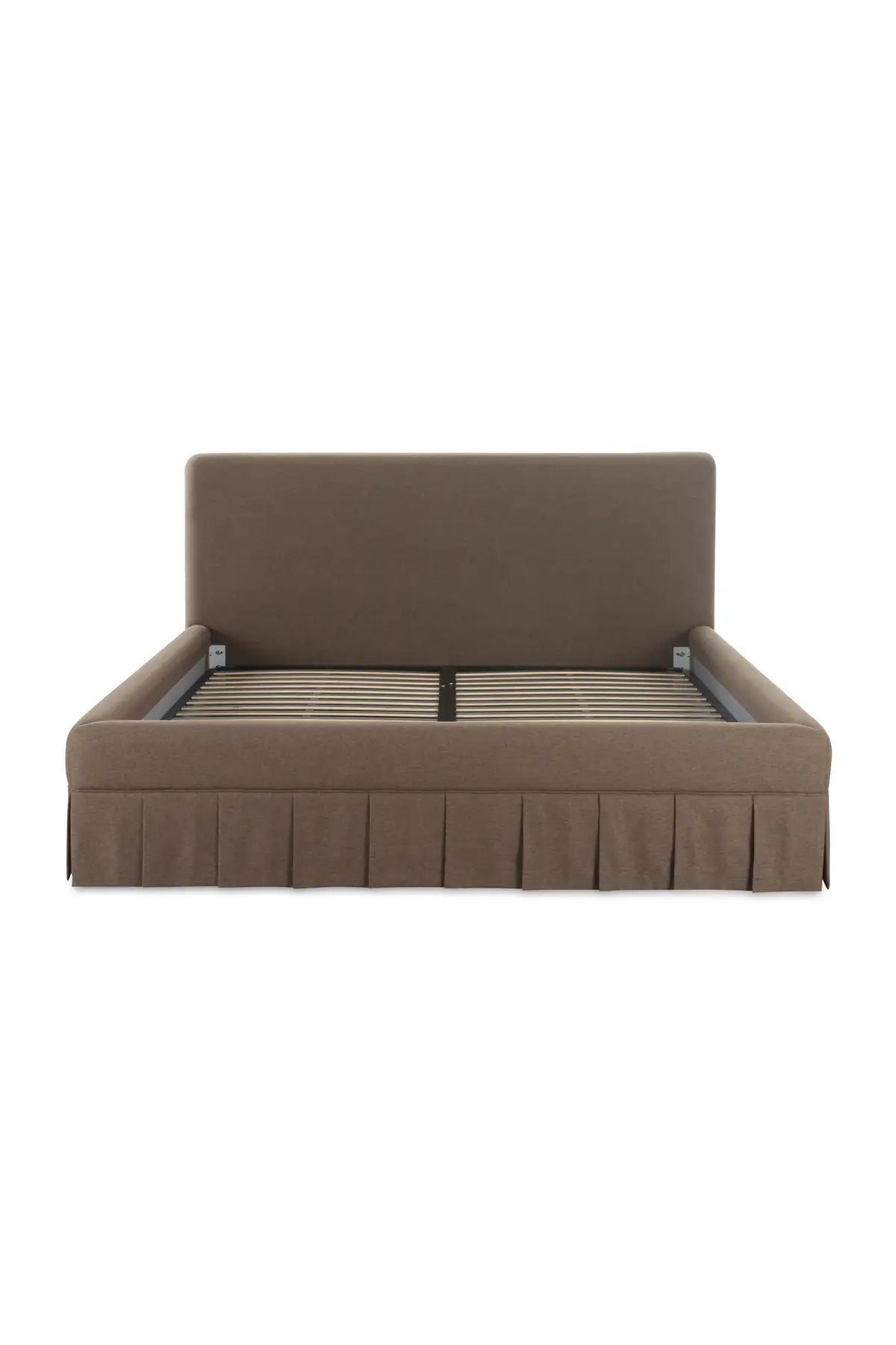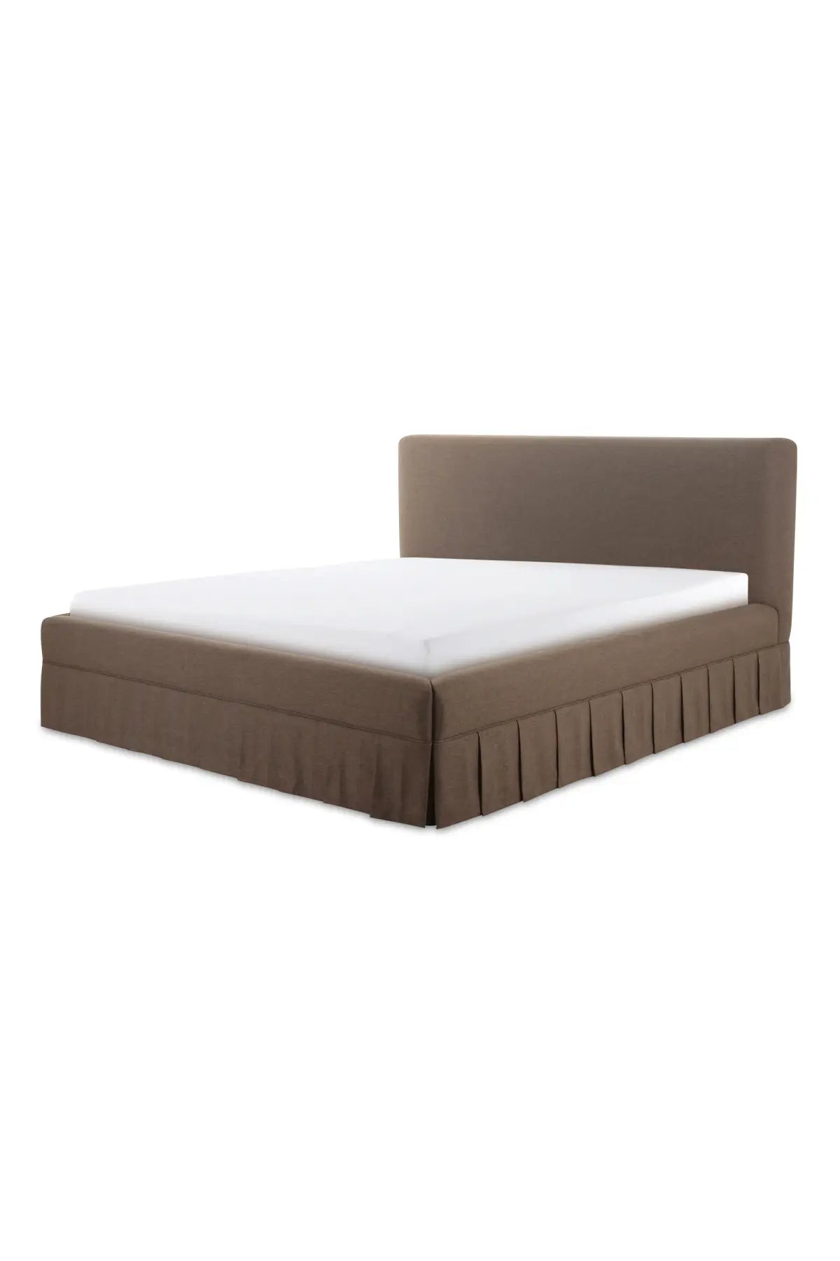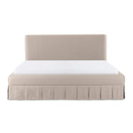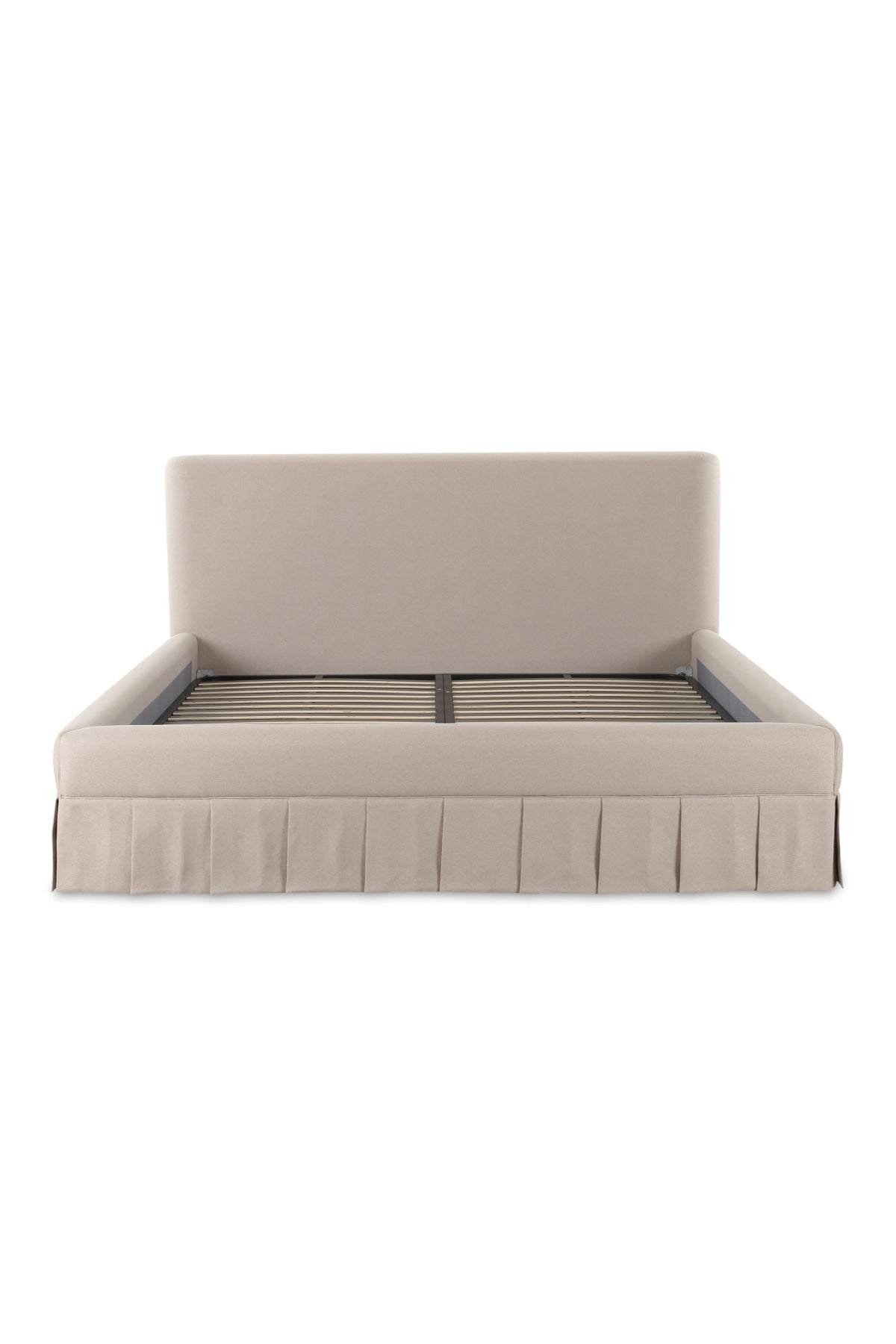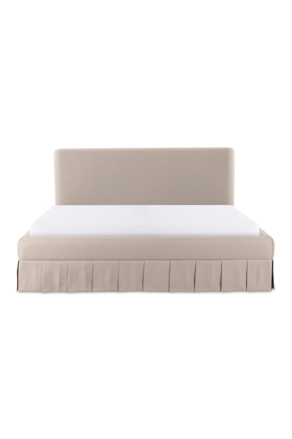 The Maren Bed exudes a soft, feminine aesthetic, upholstered in a warm, neutral fabric and featuring a playful yet refined box pleat base reminiscent of vintage finesse, straddling the line between contemporary form and traditional finish. With smoothly rounded corners and graceful, curving forms adding softness to the design, this piece is a study in elegance and subtlety. Slats included.