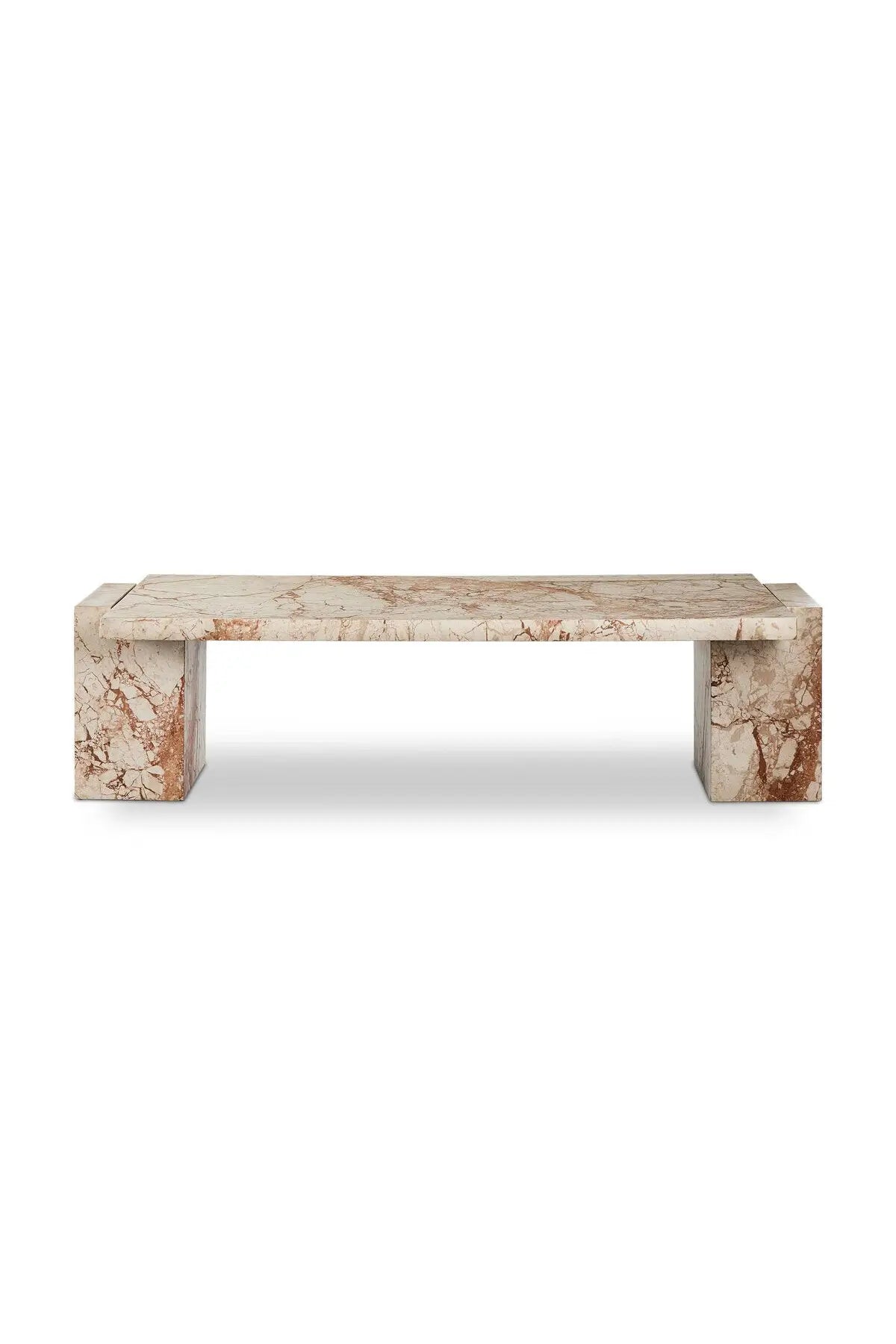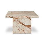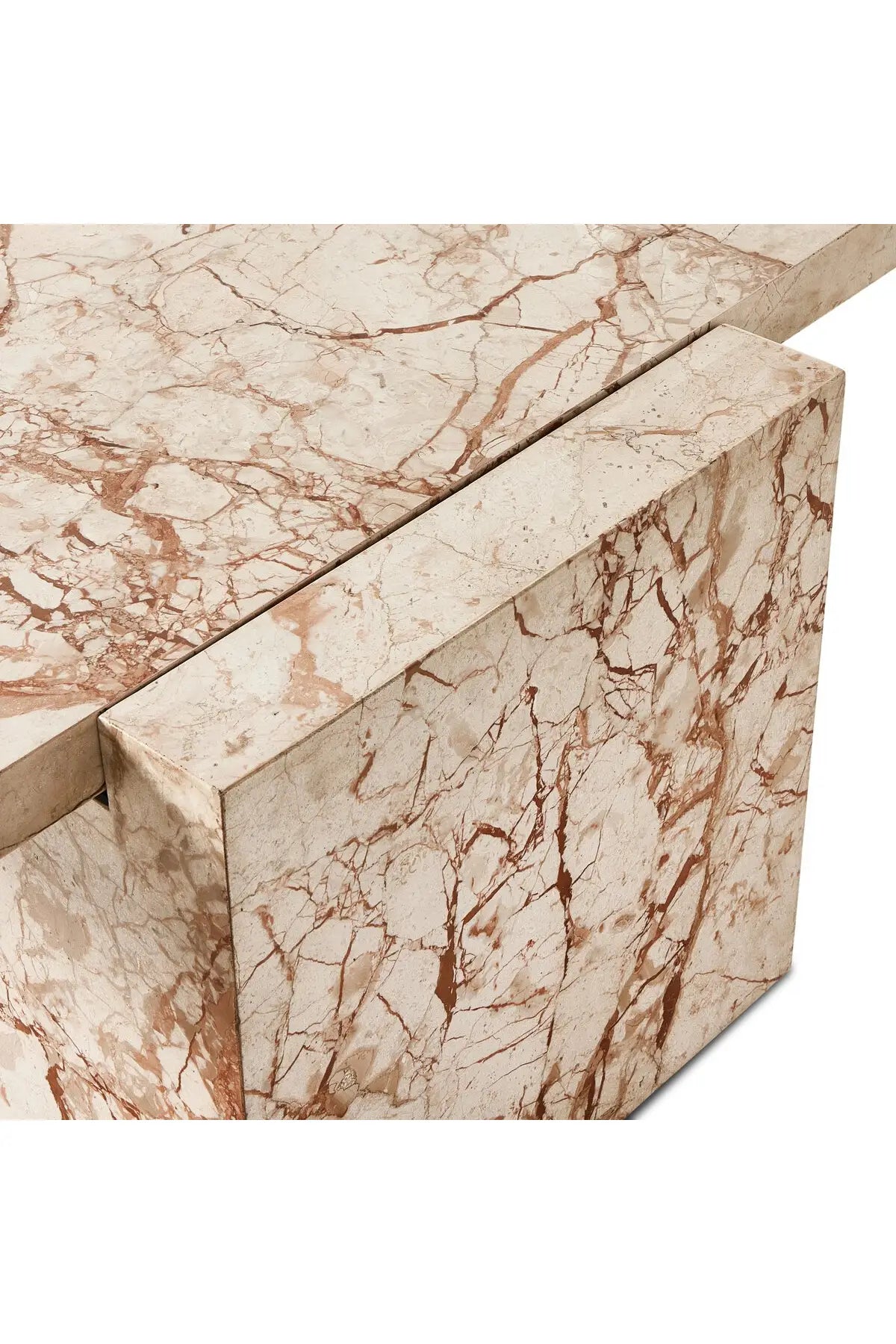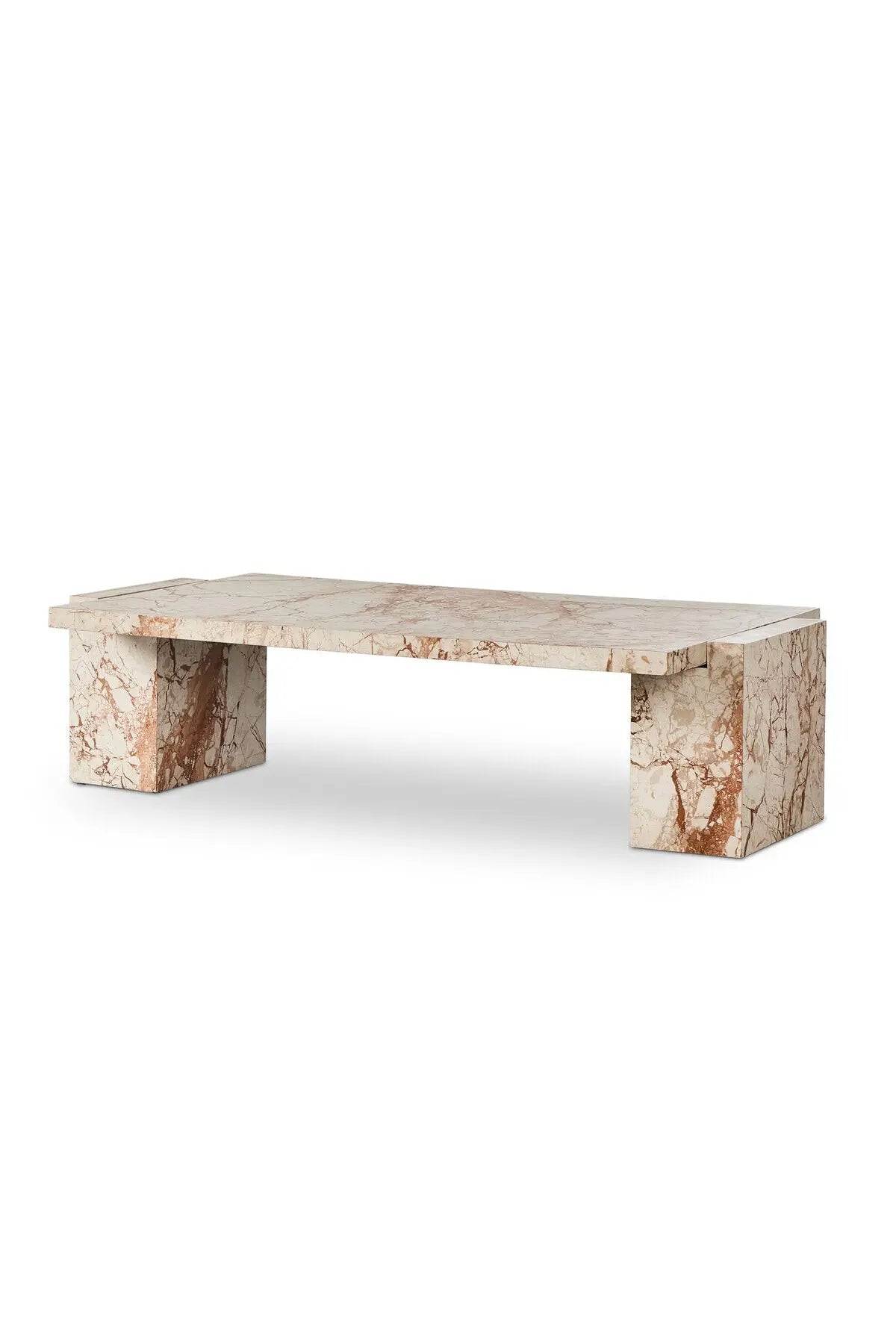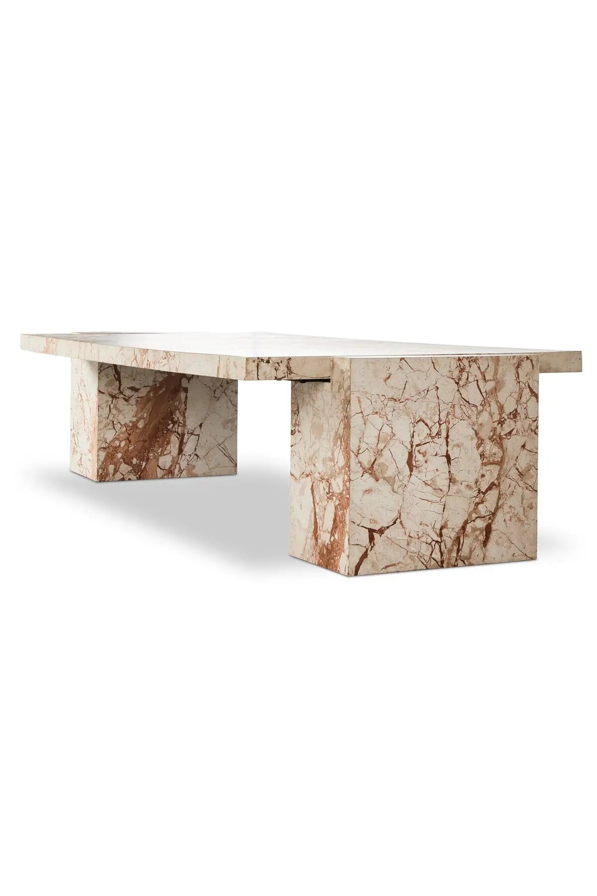 Meet the Romano Coffee Table. Solid marble sheets are laminated to create cubed cradle bases for a thick-cut tabletop. Heavy veining and natural swirls speak to the nature of marble, with each piece being entirely unique.