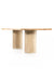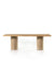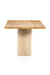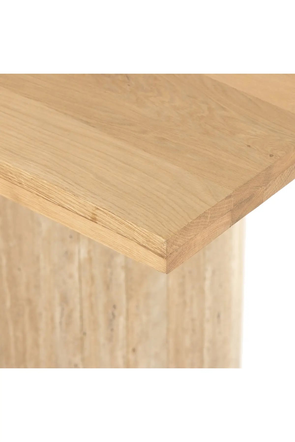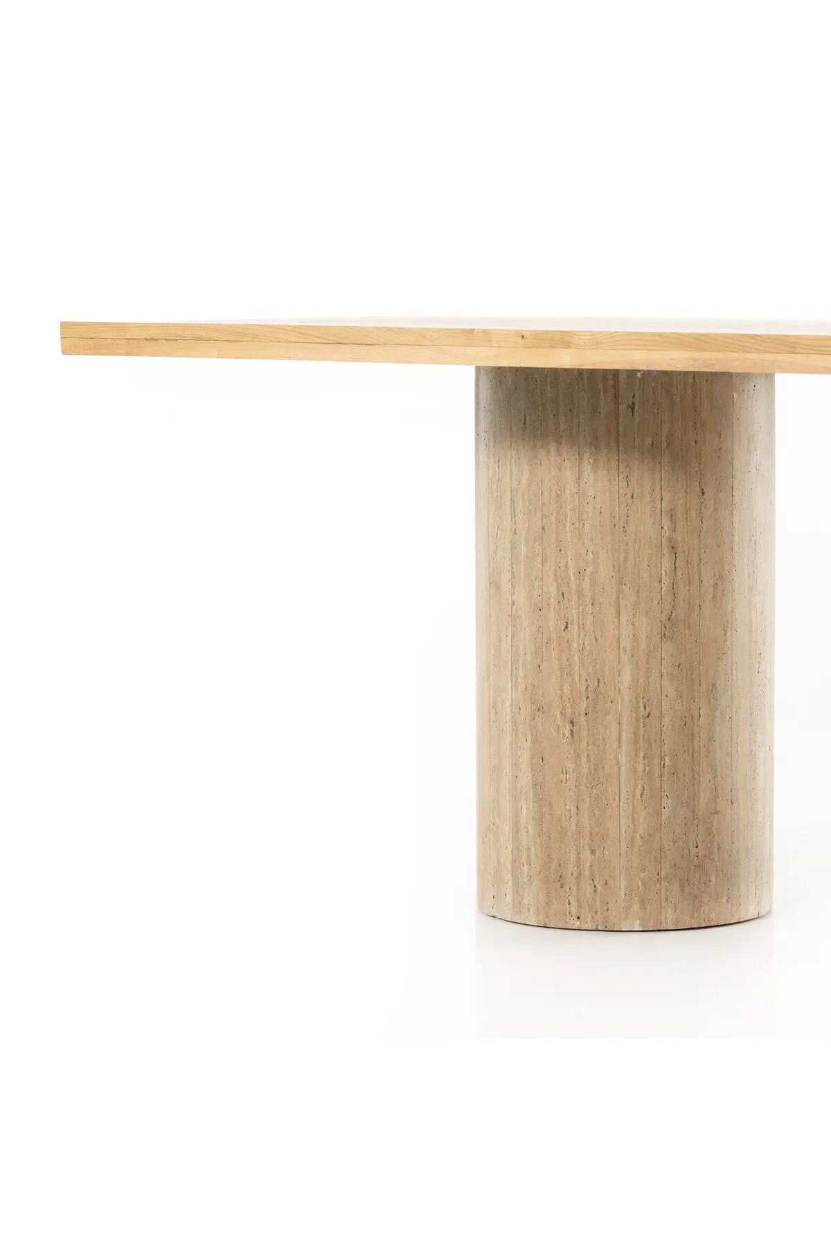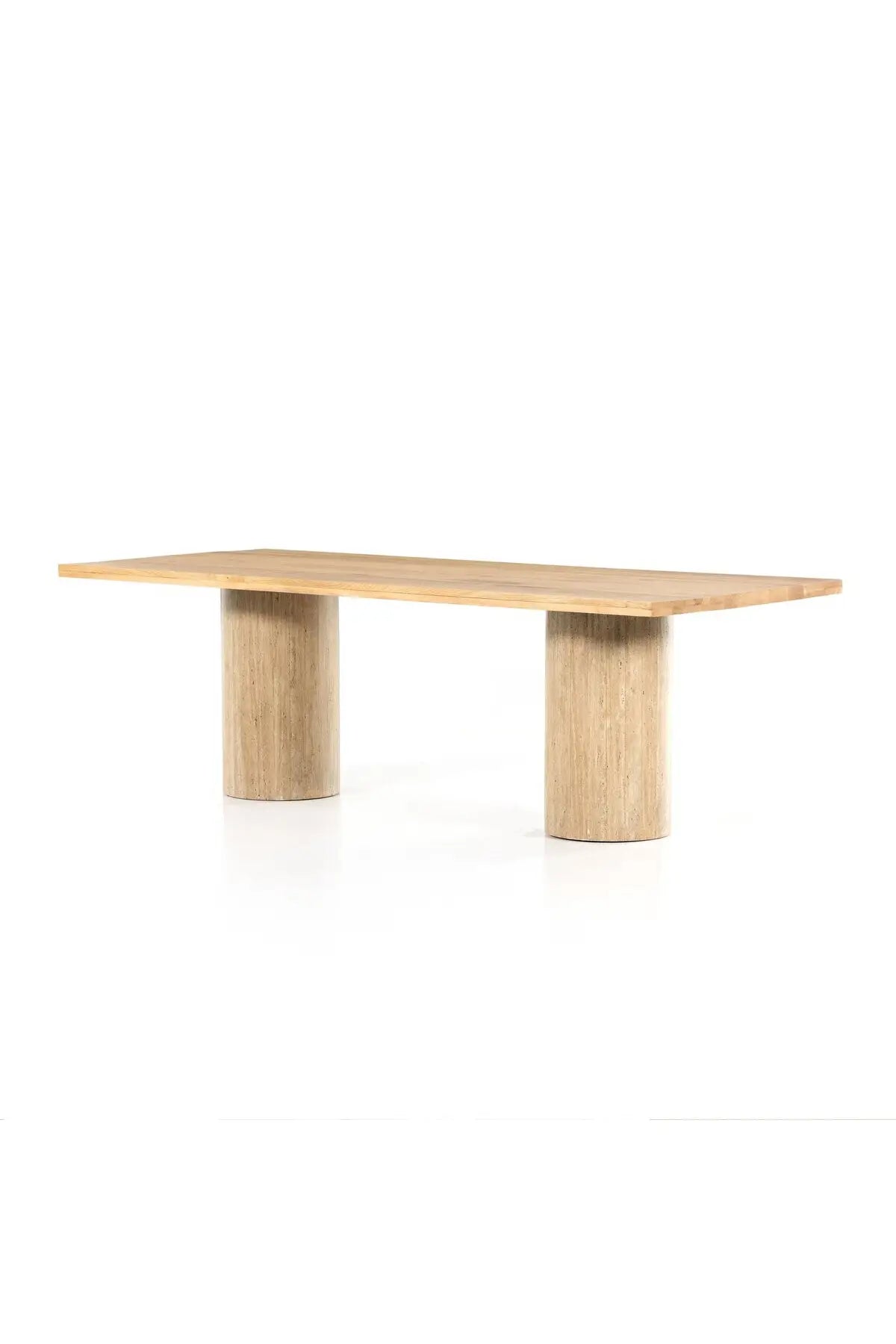 Meet the Malia Dining Table. Make a mixed material statement with the Malia Dining Table. Cylindrical legs of solid travertine provide a dramatically scaled base for a rectangular tabletop of solid natural oak, for a fresh twist on organic Seventies styling. Seats six comfortably.