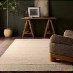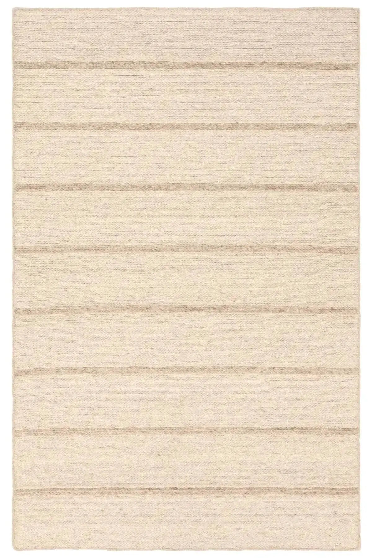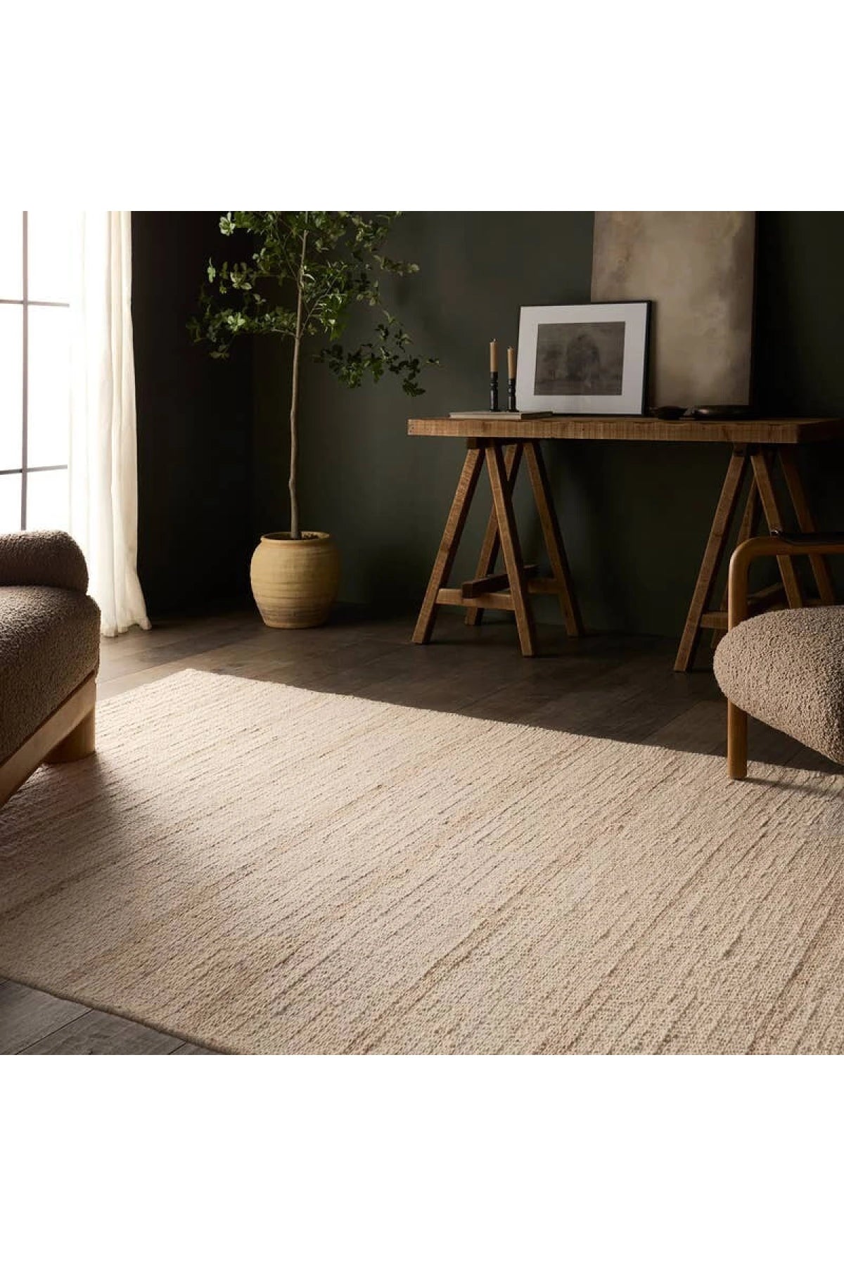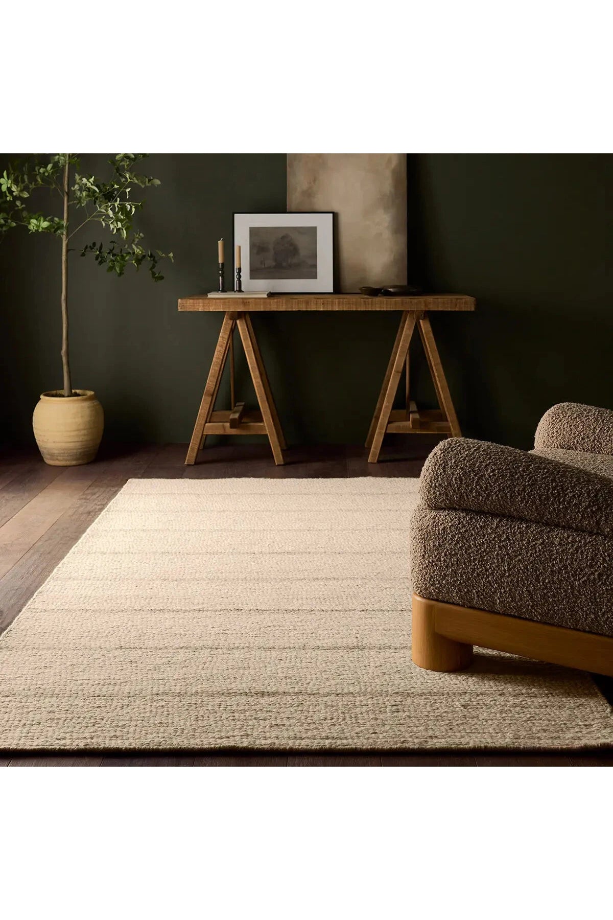Meet the Bavell Rug - Travertine. This Rug, made of 100% undyed wool with natural stripes and unique brown flecks, is durable, stain resistant, and perfect for stylish, eco-friendly medium-traffic spaces. Samples are modeled at our North Scottsdale/Phoenix location.