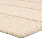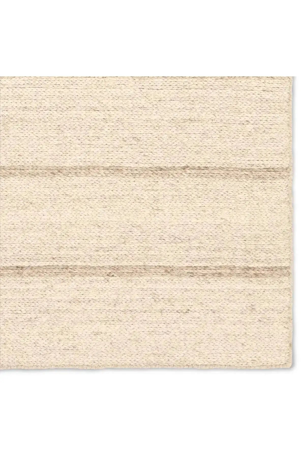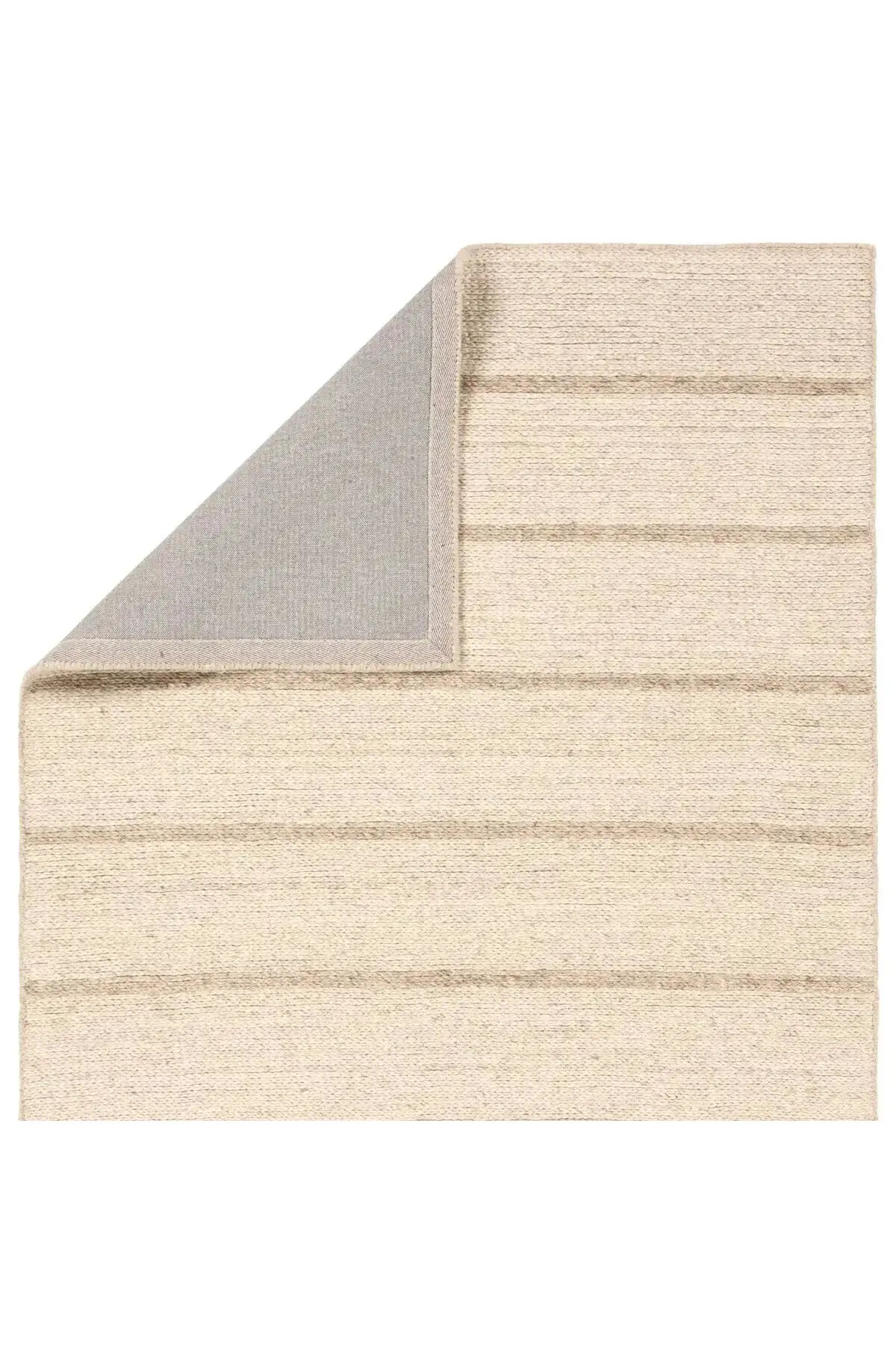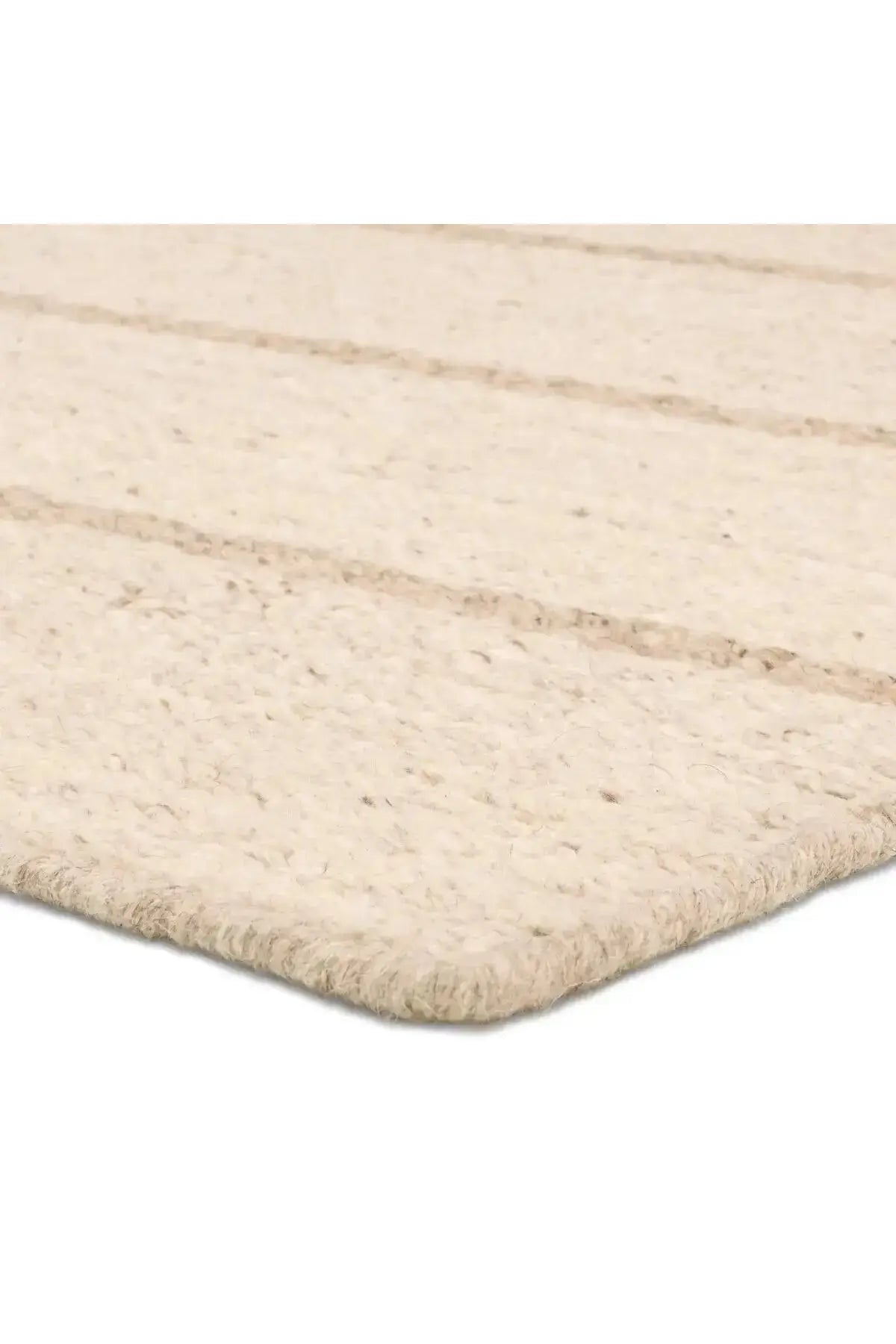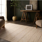 Meet the Bavell Rug - Travertine. This Rug, made of 100% undyed wool with natural stripes and unique brown flecks, is durable, stain resistant, and perfect for stylish, eco-friendly medium-traffic spaces. Samples are modeled at our North Scottsdale/Phoenix location.