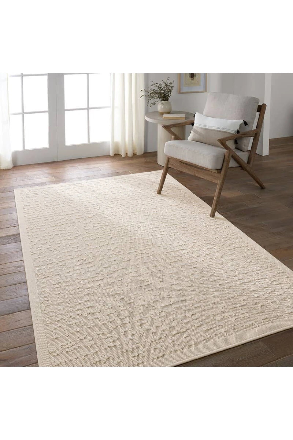 Meet the Continuum Rug - Style 1. This rug offers a stylish, durable option for both outdoor and busy indoor spaces. Its soft, geometric pattern adds texture, while stain- and water-resistant fibers make cleaning simple, perfect for any room.Samples are modeled at our North Scottsdale/Phoenix location.