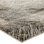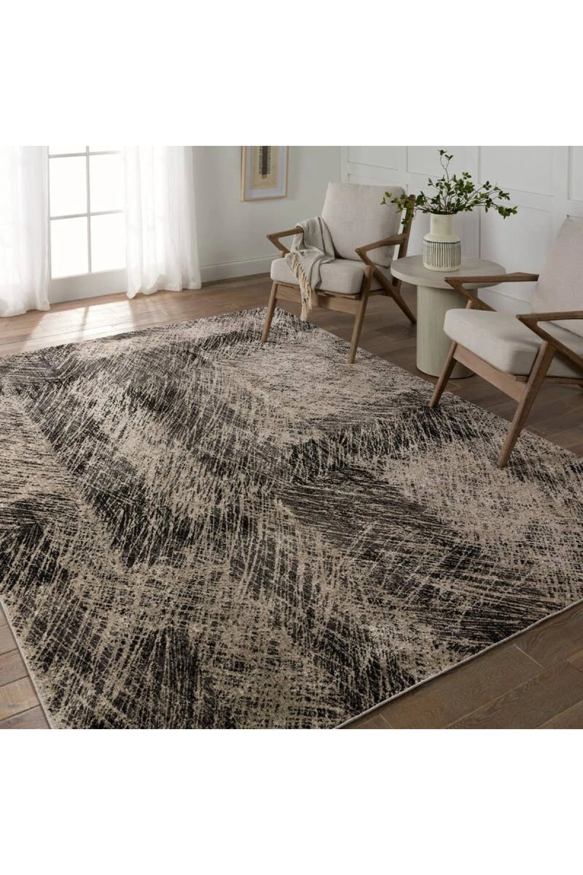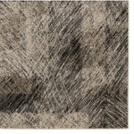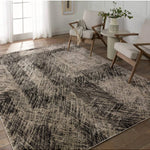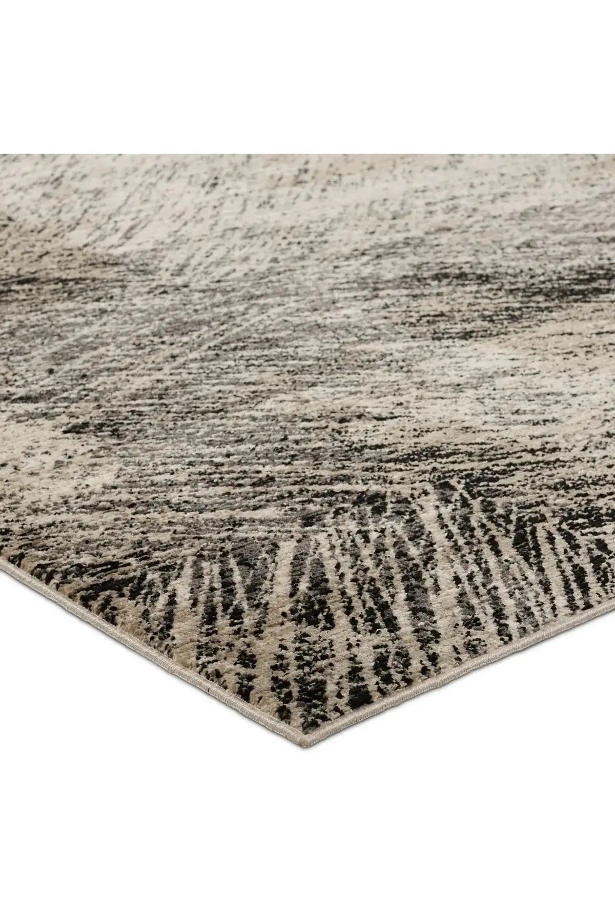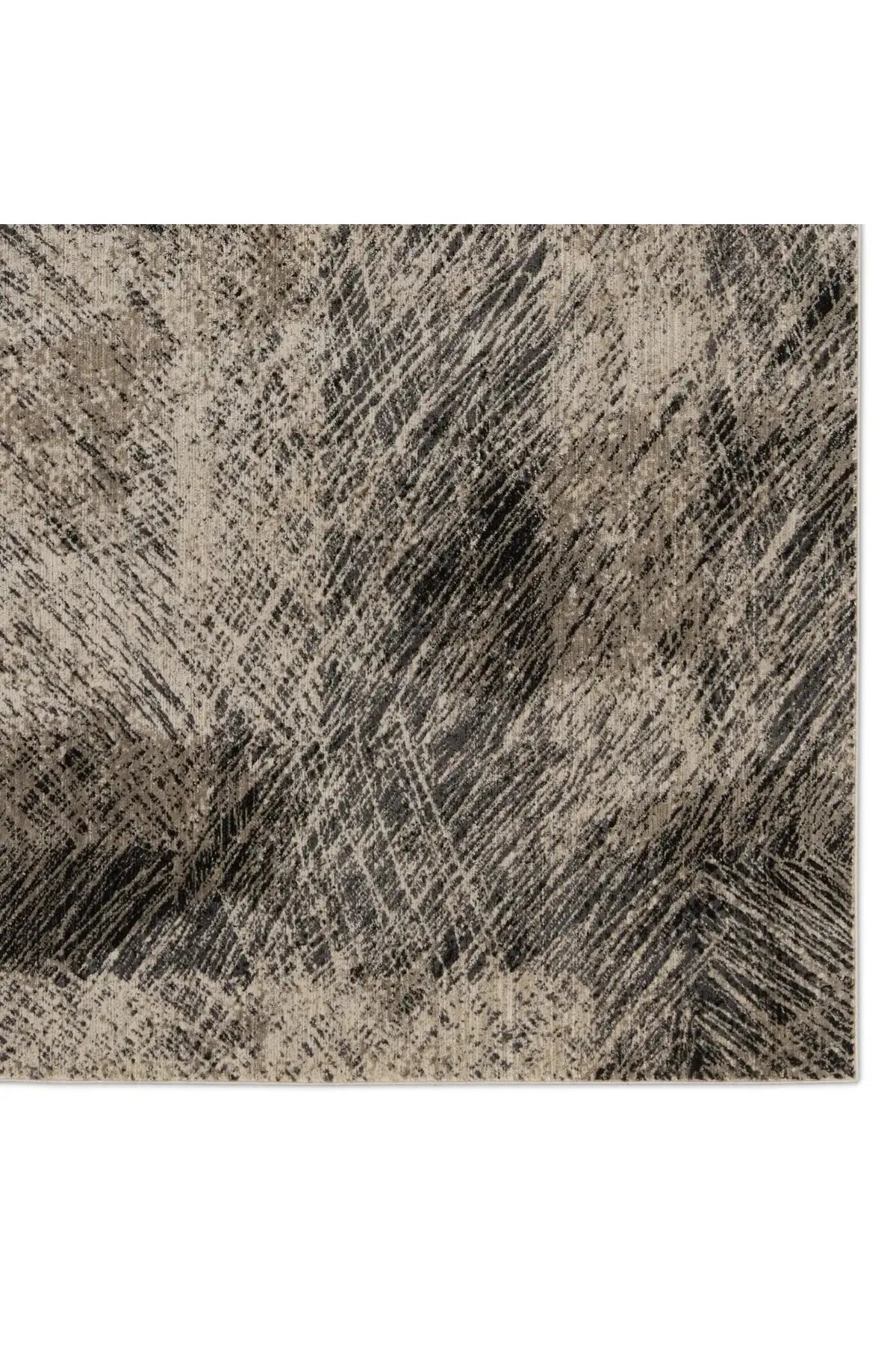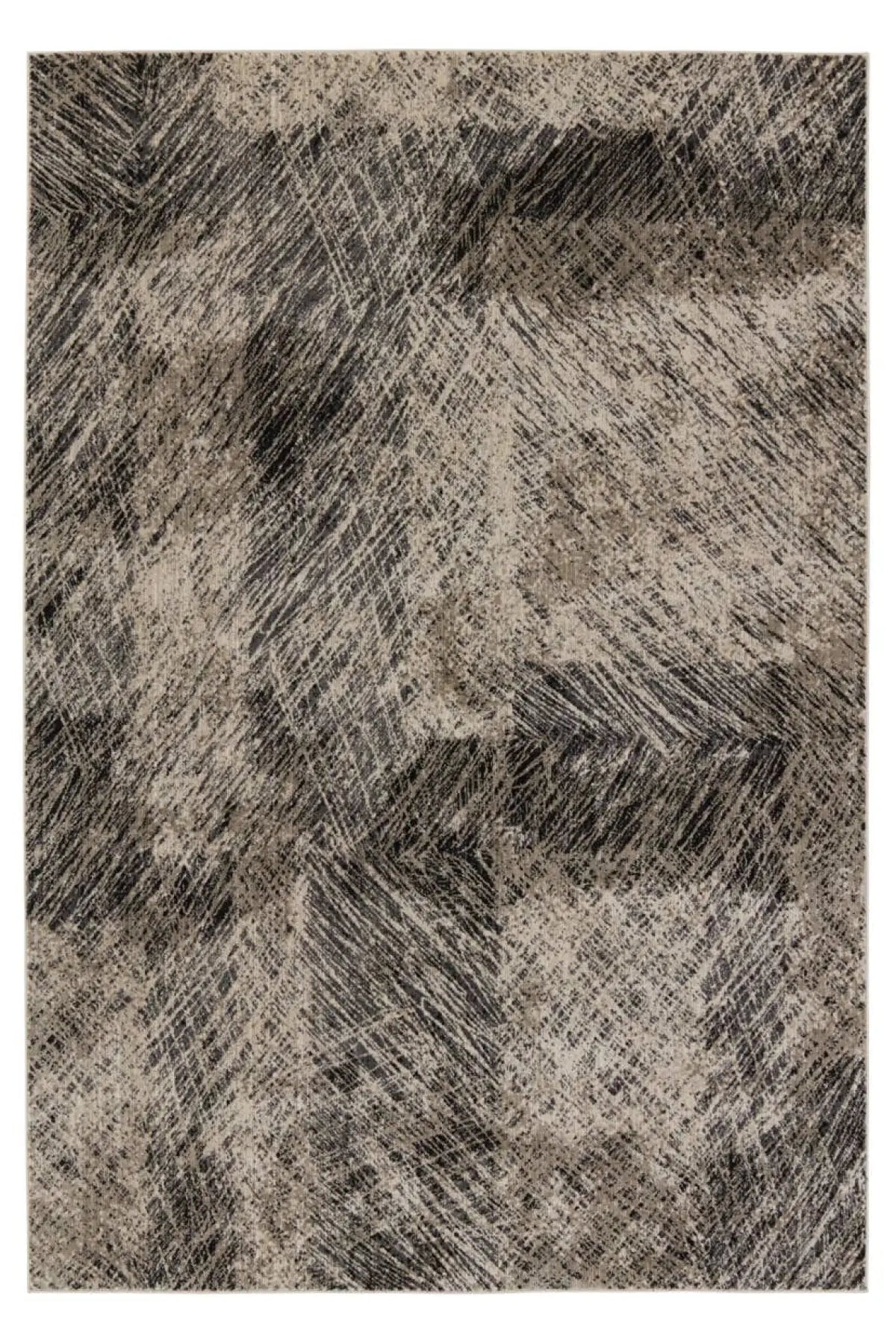 Meet the Graphite Rug - Oyster Gray. A durable blend of polyester and polypropylene, designed for busy areas. Its abstract pattern in black, taupe, gray, and cream adds textured style to any bedroom, living room, office, or entryway. Samples are modeled at our North Scottsdale/Phoenix location.