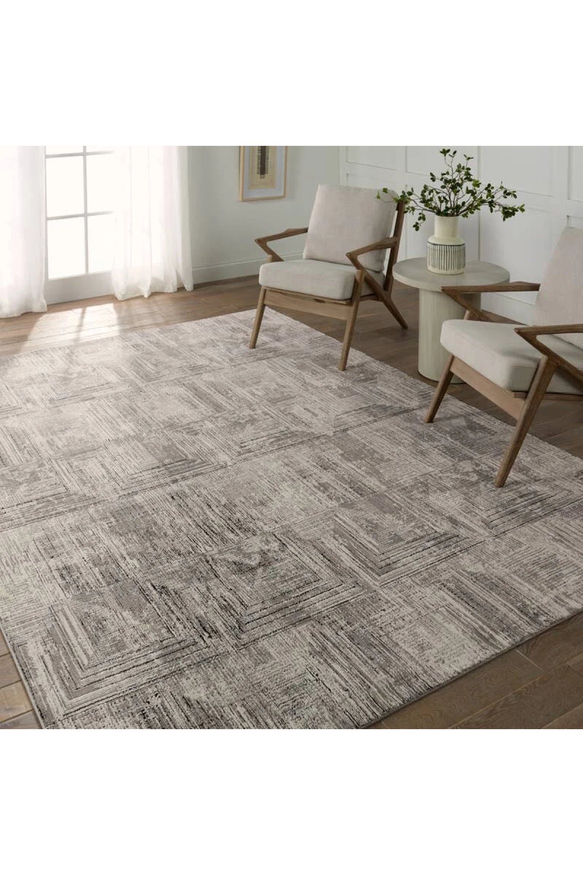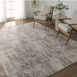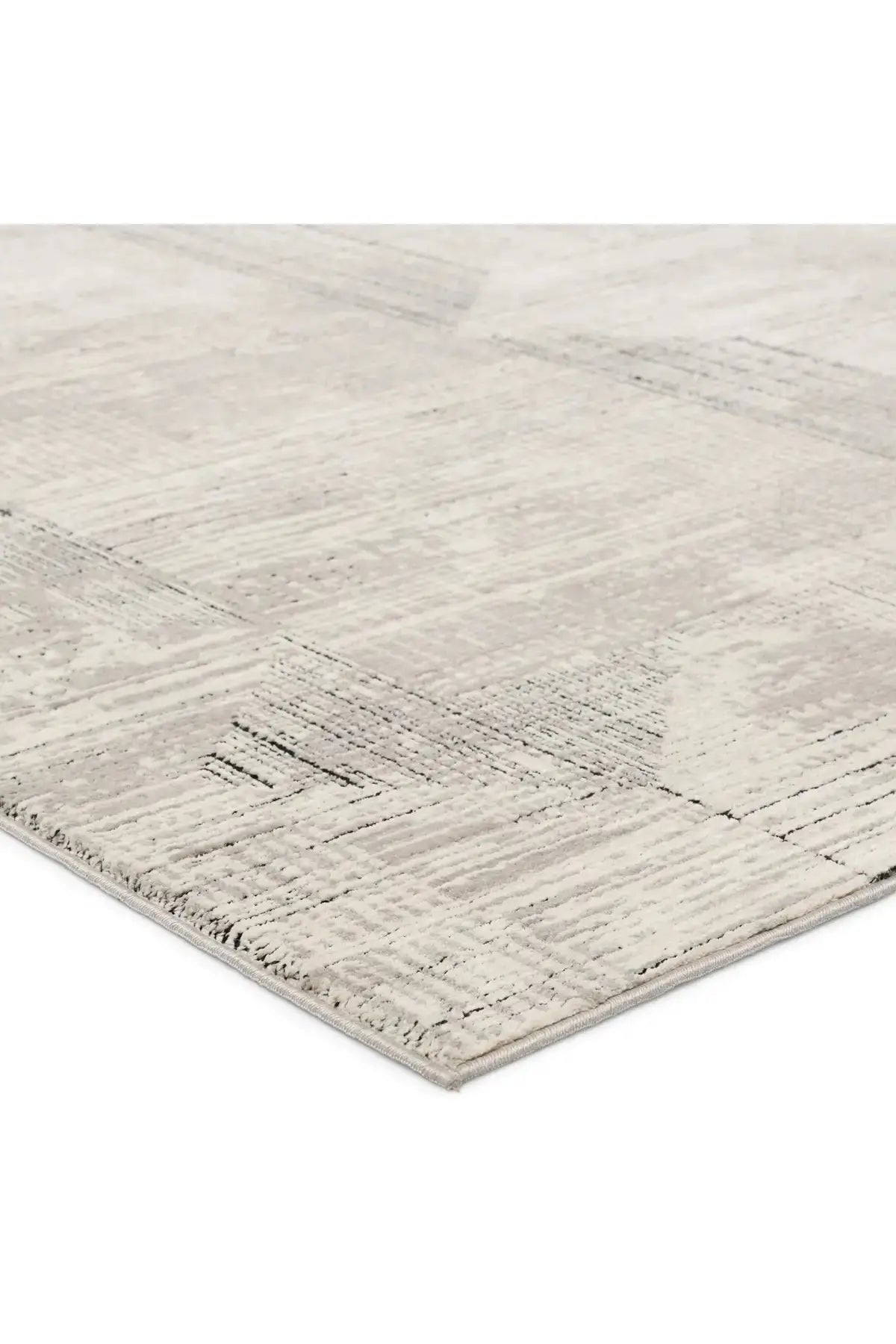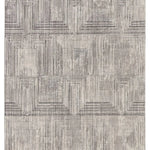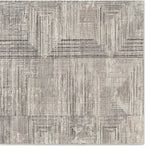 Meet the Graphite Rug - Silver Cloud. This rug in Silver Cloud combines polyester and polypropylene for durability in busy areas. Its striped abstract design in gray, black, and silver adds texture and style to bedrooms, living rooms, offices, and entryways. Samples are modeled at our North Scottsdale/Phoenix location.